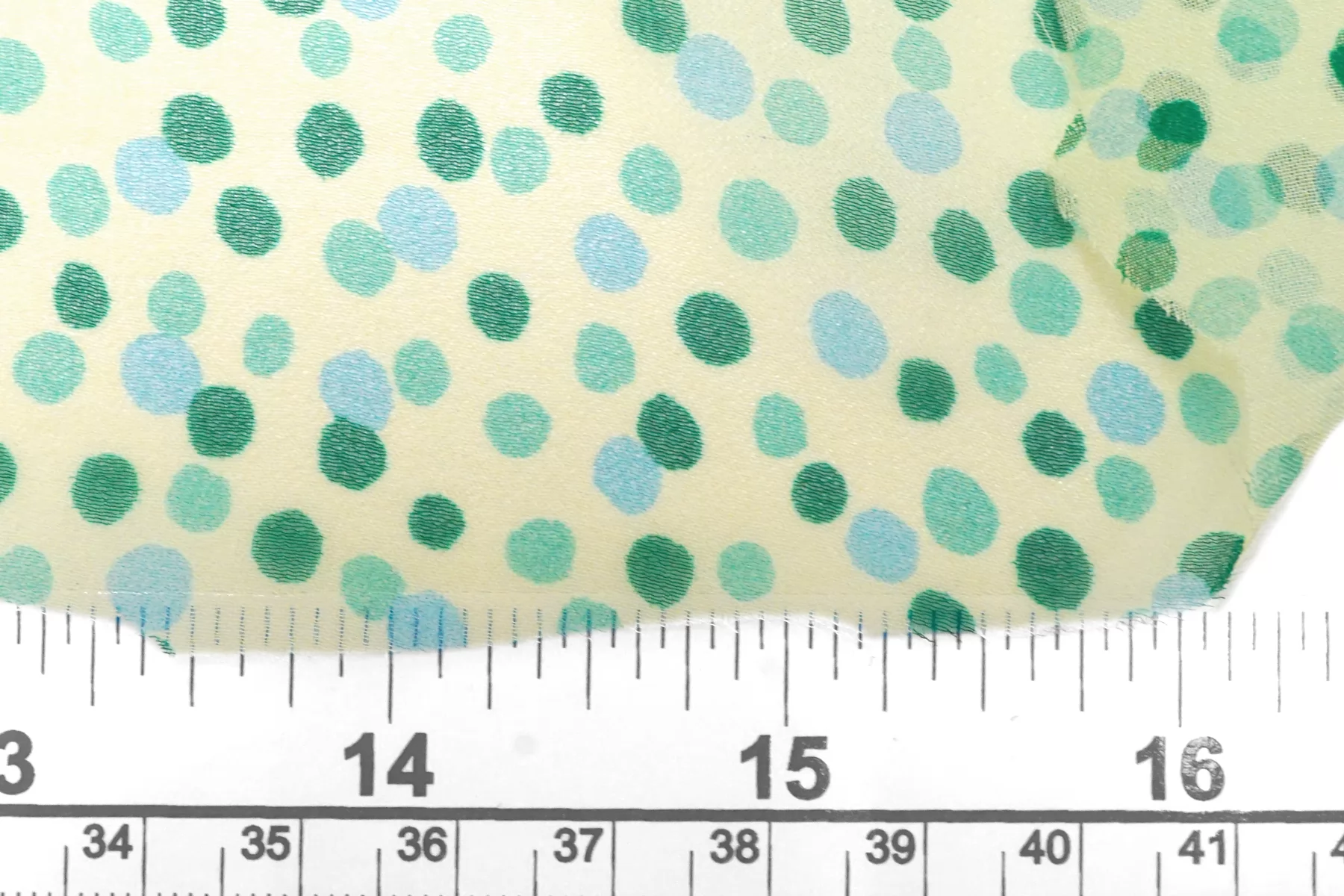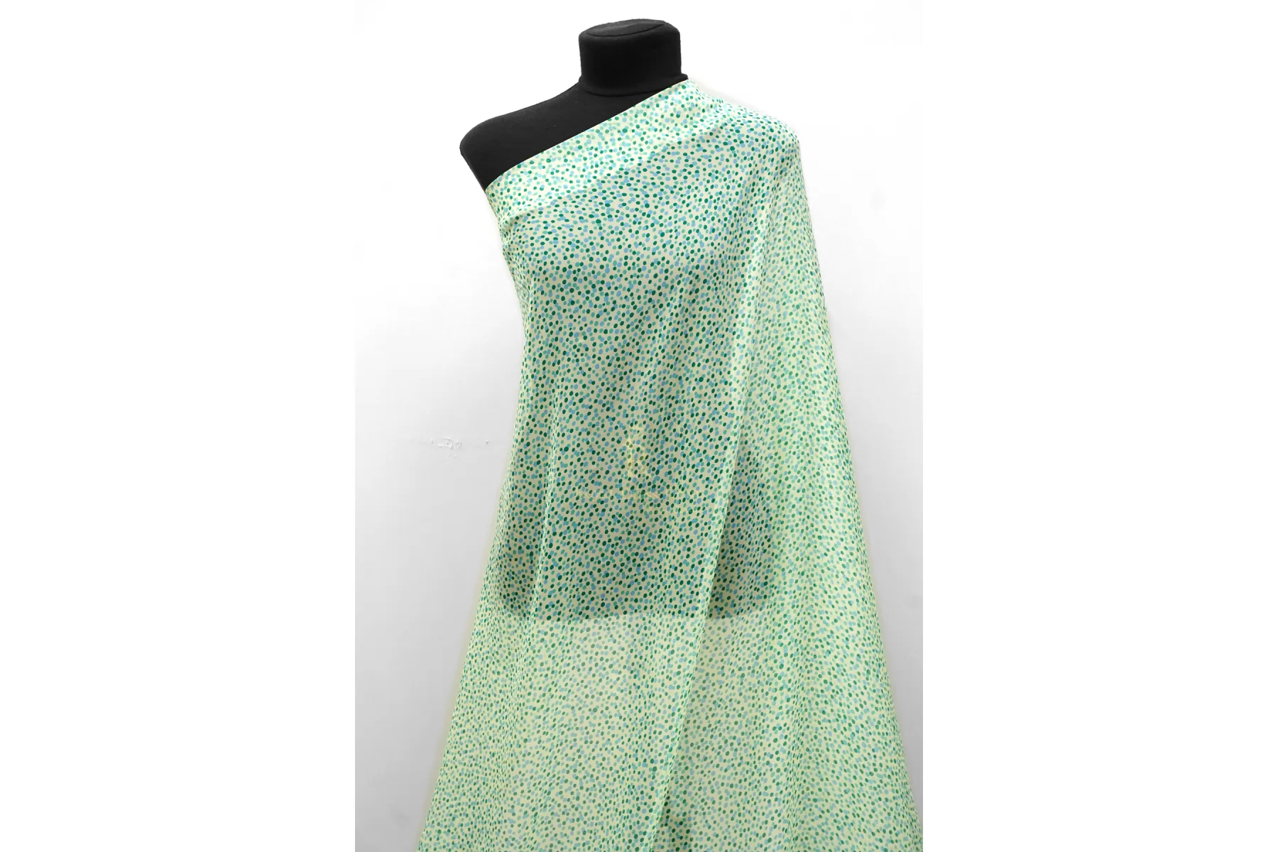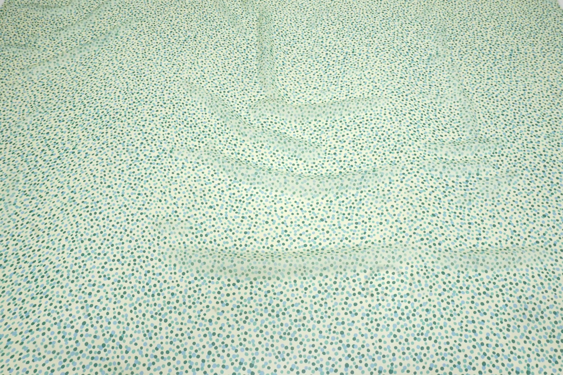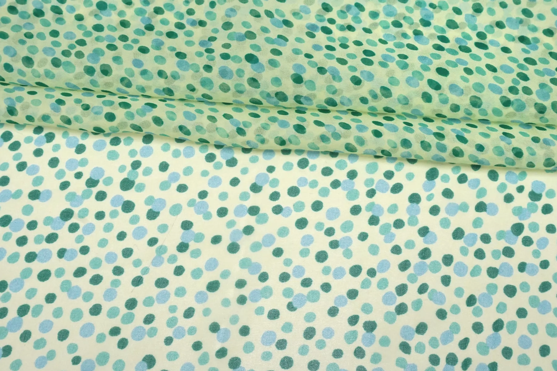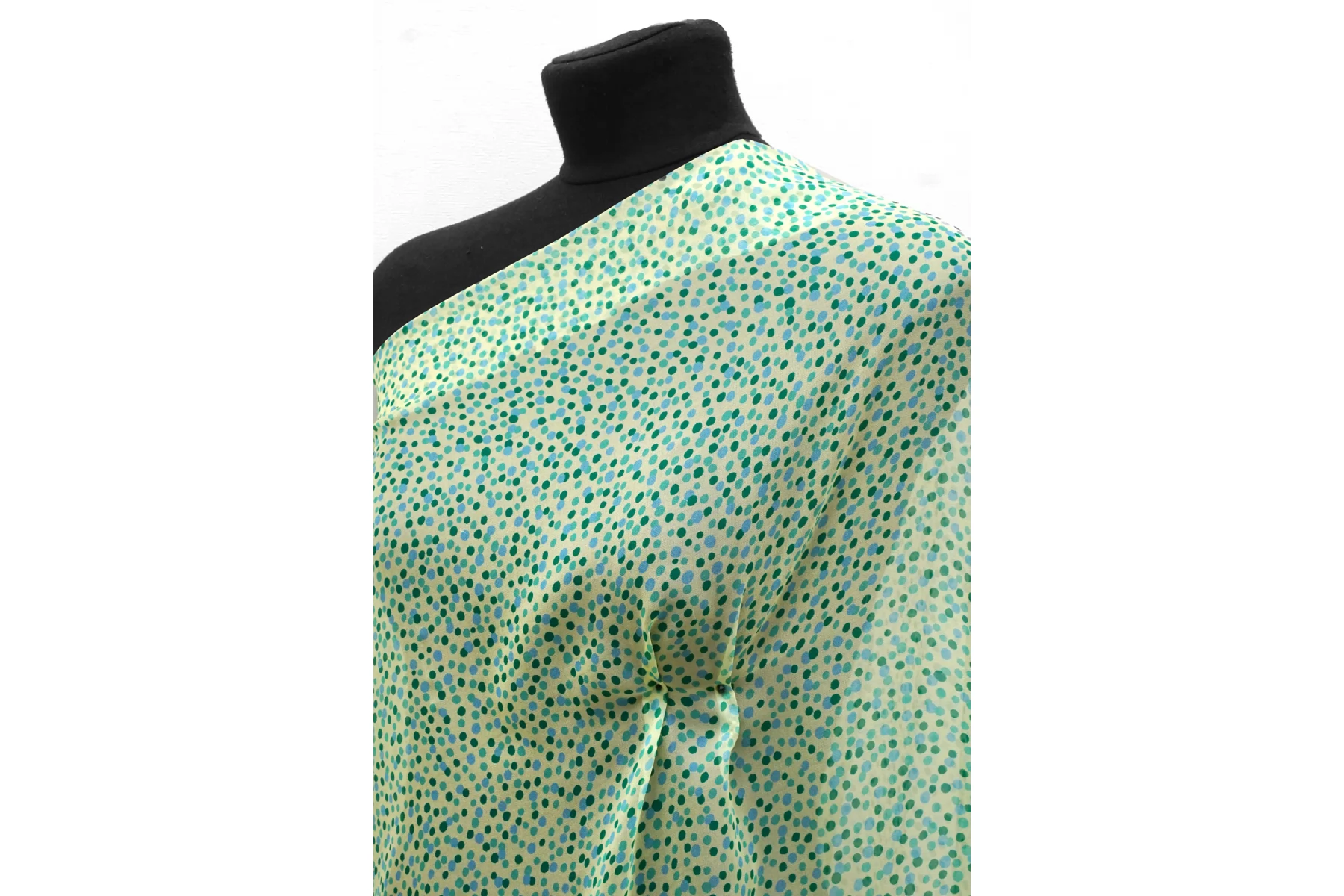 Прекрасный шелковый шифон от бренда Max Mara, принт в виде хаотичного горошка голубого, бирюзового и зелёного цвета на бледно-жёлтом фоне. Струящийся, летящий, воздушный, очень приятный и нежный к телу. Уход, как и за любым шелком, деликатный. Прозрачный. Сминается несильно. Подойдет на платье, блузку, юбку.