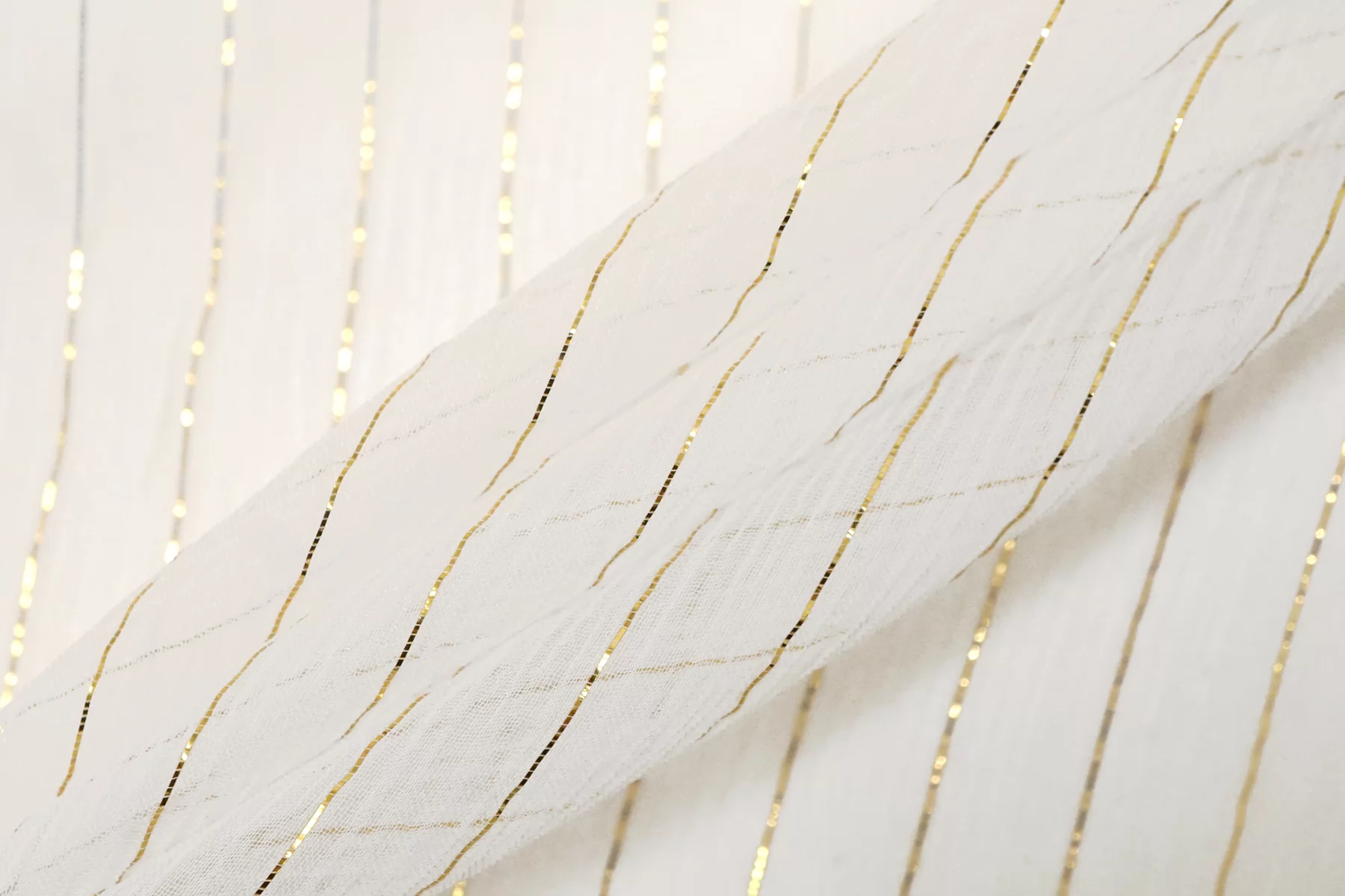 Шикарный шифон из шёлка от Max Mara, в белом цвете с очень легким молочным подтоном, плюс полосками вплетен золотой люрекс (вдоль кромки). Лёгкий, воздушный. Приятный, слегка шероховатый. Не тянется, мнется слабо. Полупрозрачный. Форму не держит, но красив в складках. Шьем блузки, платья, юбки, или используем для отдельных элементов изделия. Уход деликатный.