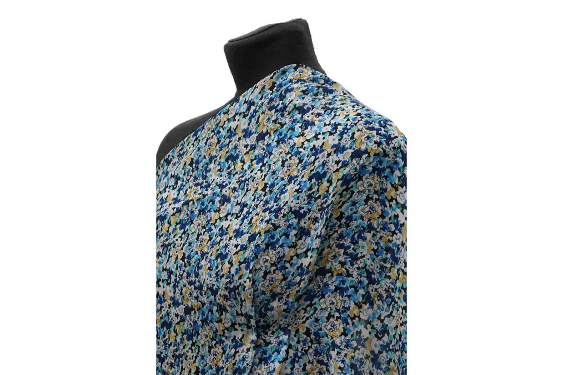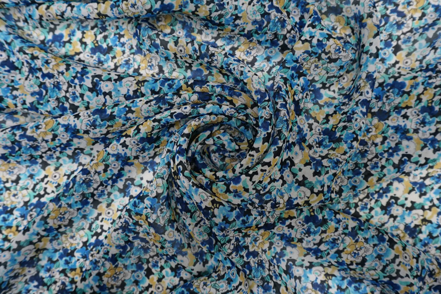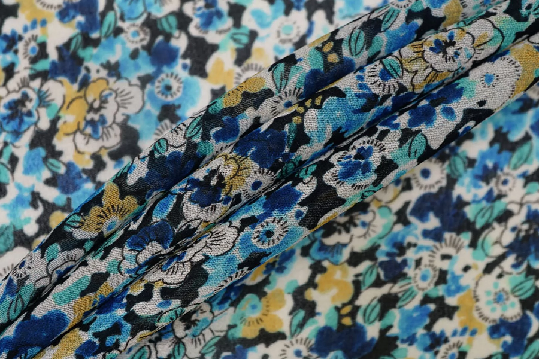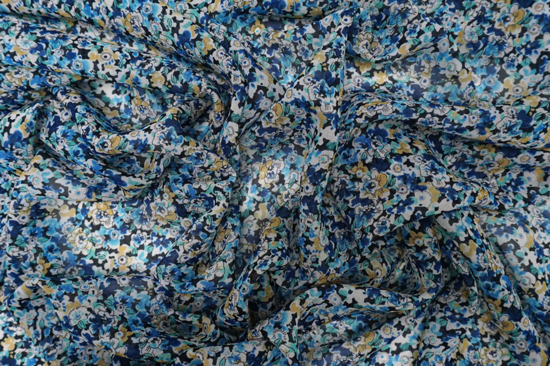 Прекрасный шифон из вискозы, мелкий цветочный принт в синих тонах, с добавкой голубого, белого, черного и ненасыщенно-горчичного. Материал достаточно тонкий, просвечивает. Тактильно мягкий, шероховатый. Легкий, летящий, красив в пластике, форму не держит. Не тянется, а слегка пружинит за счет плетения. Прекрасен для пошива блузки, туники, платья, юбки (на подкладе или многослойной). При необходимости используйте подкладочный материал. Обязательно учитывайте усадку 5-10%