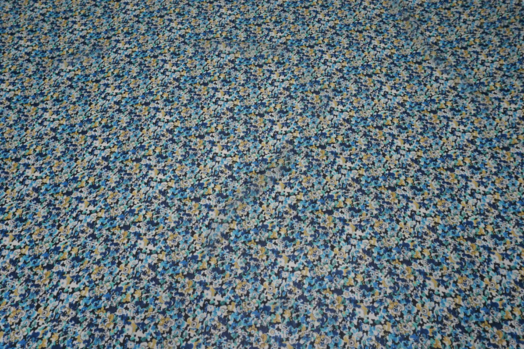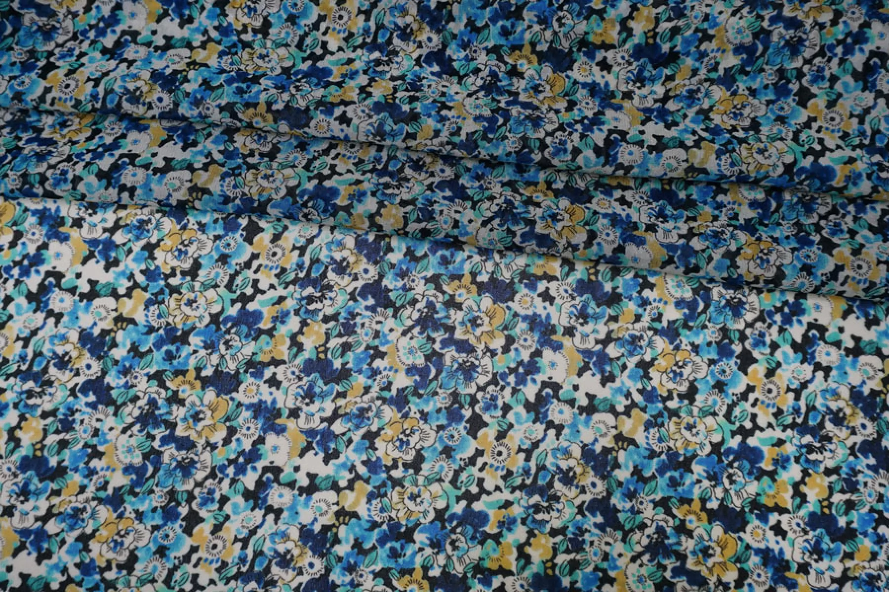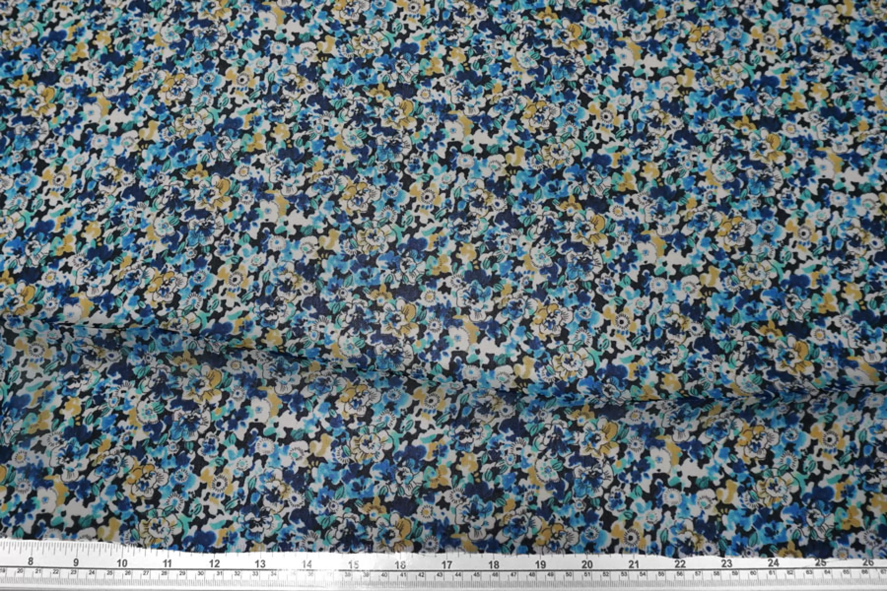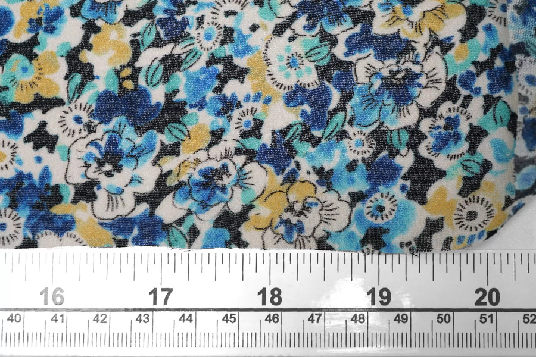 Прекрасный шифон из вискозы, мелкий цветочный принт в синих тонах, с добавкой голубого, белого, черного и ненасыщенно-горчичного. Материал достаточно тонкий, просвечивает. Тактильно мягкий, шероховатый. Легкий, летящий, красив в пластике, форму не держит. Не тянется, а слегка пружинит за счет плетения. Прекрасен для пошива блузки, туники, платья, юбки (на подкладе или многослойной). При необходимости используйте подкладочный материал. Обязательно учитывайте усадку 5-10%
