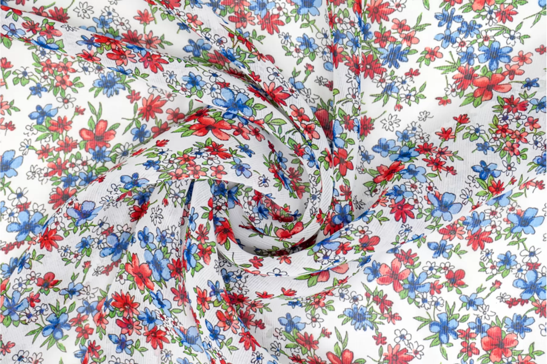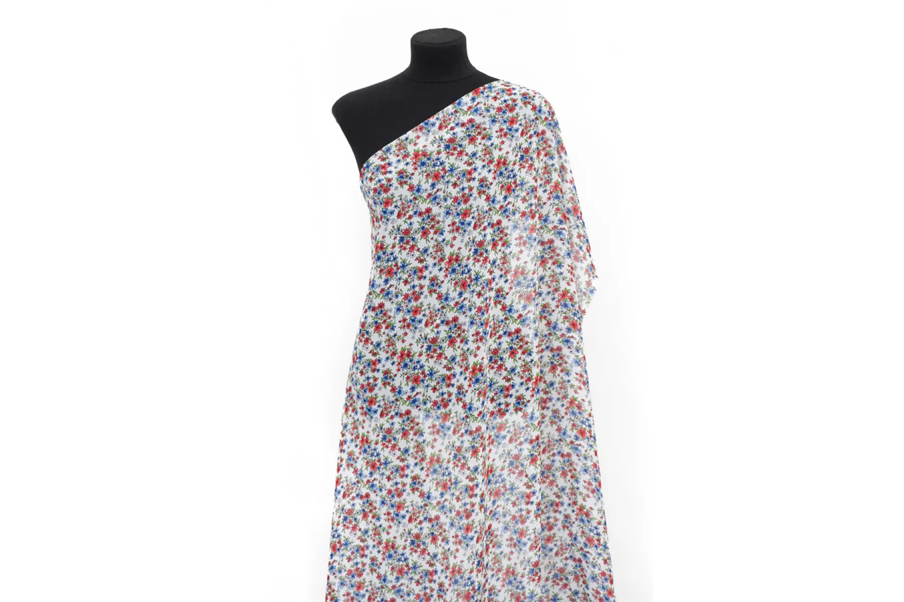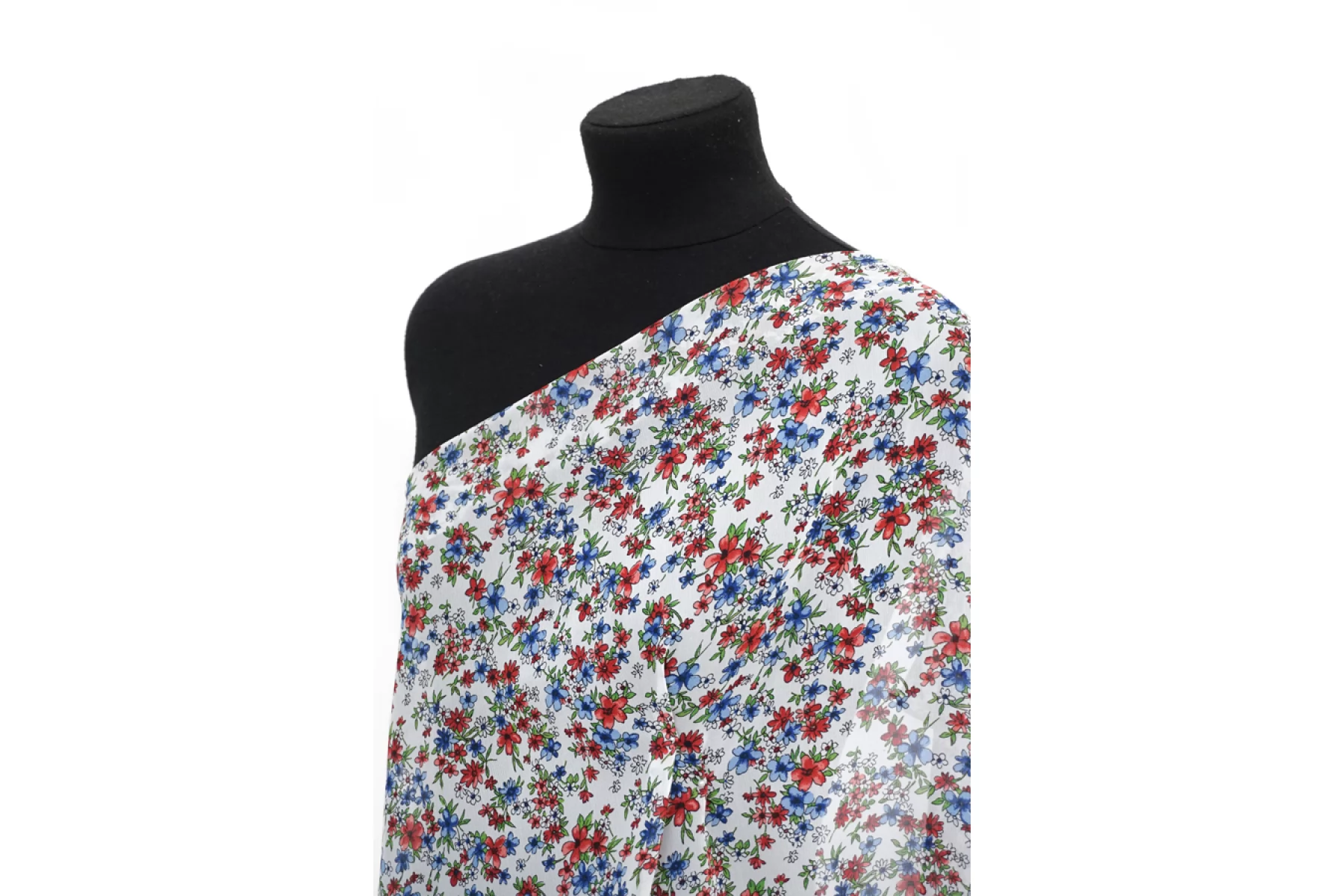 Очень красивая позиция - вискозный шифон-жоржет молочного оттенка в некрупный цветочный принт в сине-красно-зеленой цветовой гамме. Материал достаточно тонкий, просвечивает. Тактильно мягкий, шероховатый. Плотненький, слегка увесистый, красивый в пластике. Совсем немного держит форму. Не тянется. Подойдет для пошива блузки, туники, платья, юбки (на подкладе или многослойной). При необходимости используйте подкладочный материал. Обязательно учитывайте усадку 5-10%