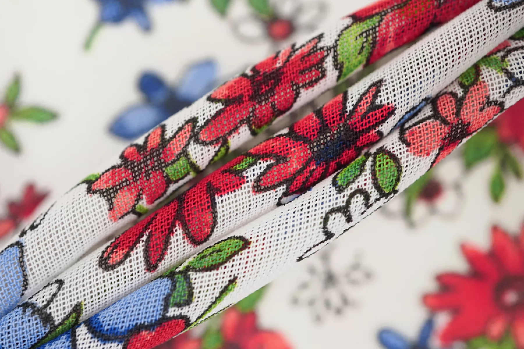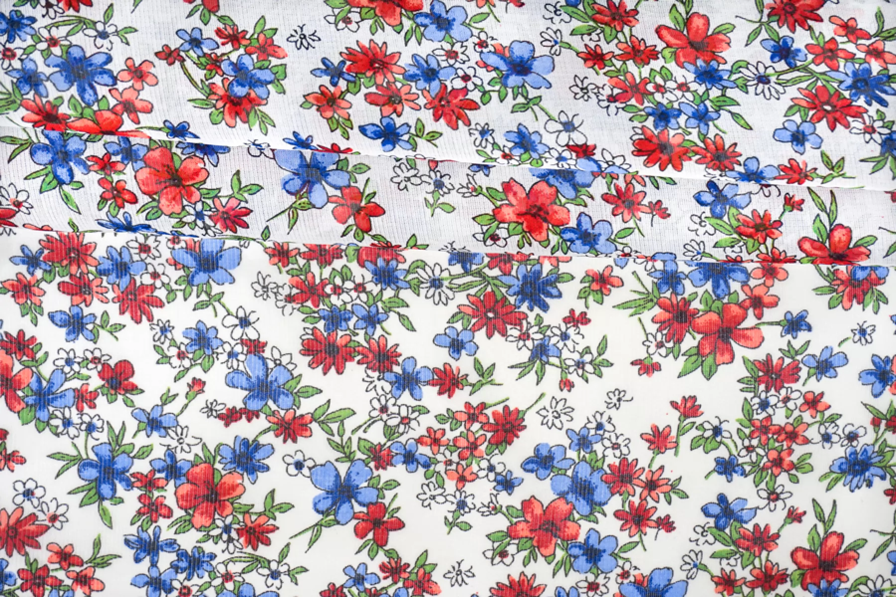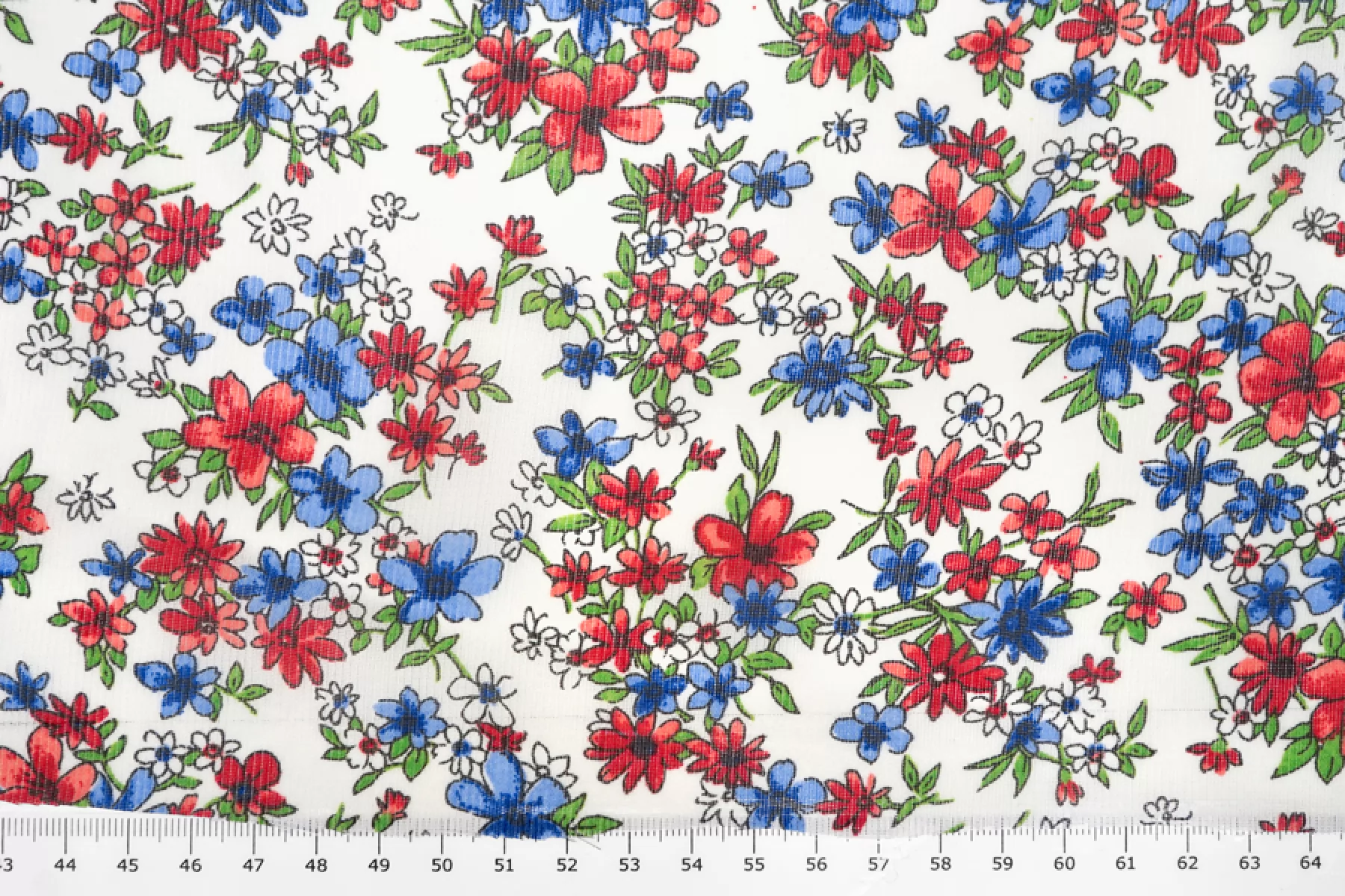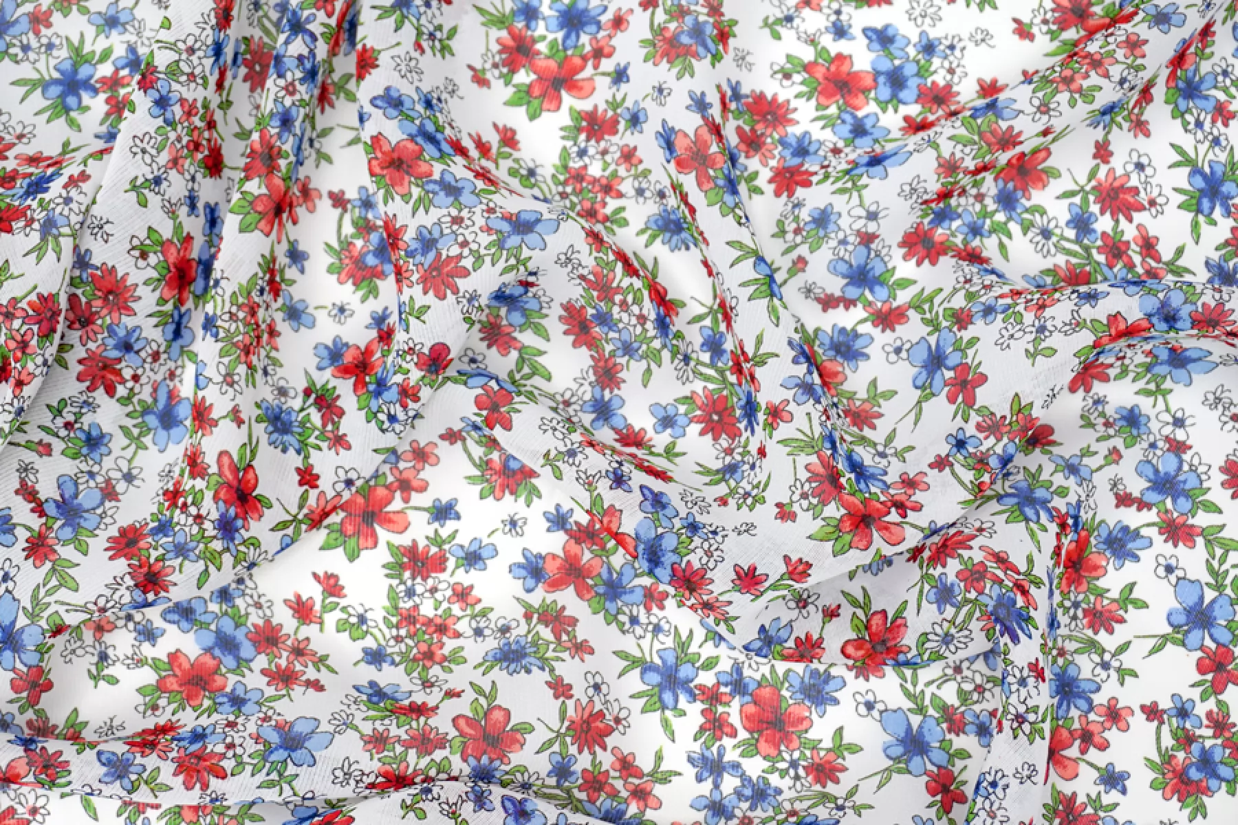 Очень красивая позиция - вискозный шифон-жоржет молочного оттенка в некрупный цветочный принт в сине-красно-зеленой цветовой гамме. Материал достаточно тонкий, просвечивает. Тактильно мягкий, шероховатый. Плотненький, слегка увесистый, красивый в пластике. Совсем немного держит форму. Не тянется. Подойдет для пошива блузки, туники, платья, юбки (на подкладе или многослойной). При необходимости используйте подкладочный материал. Обязательно учитывайте усадку 5-10%