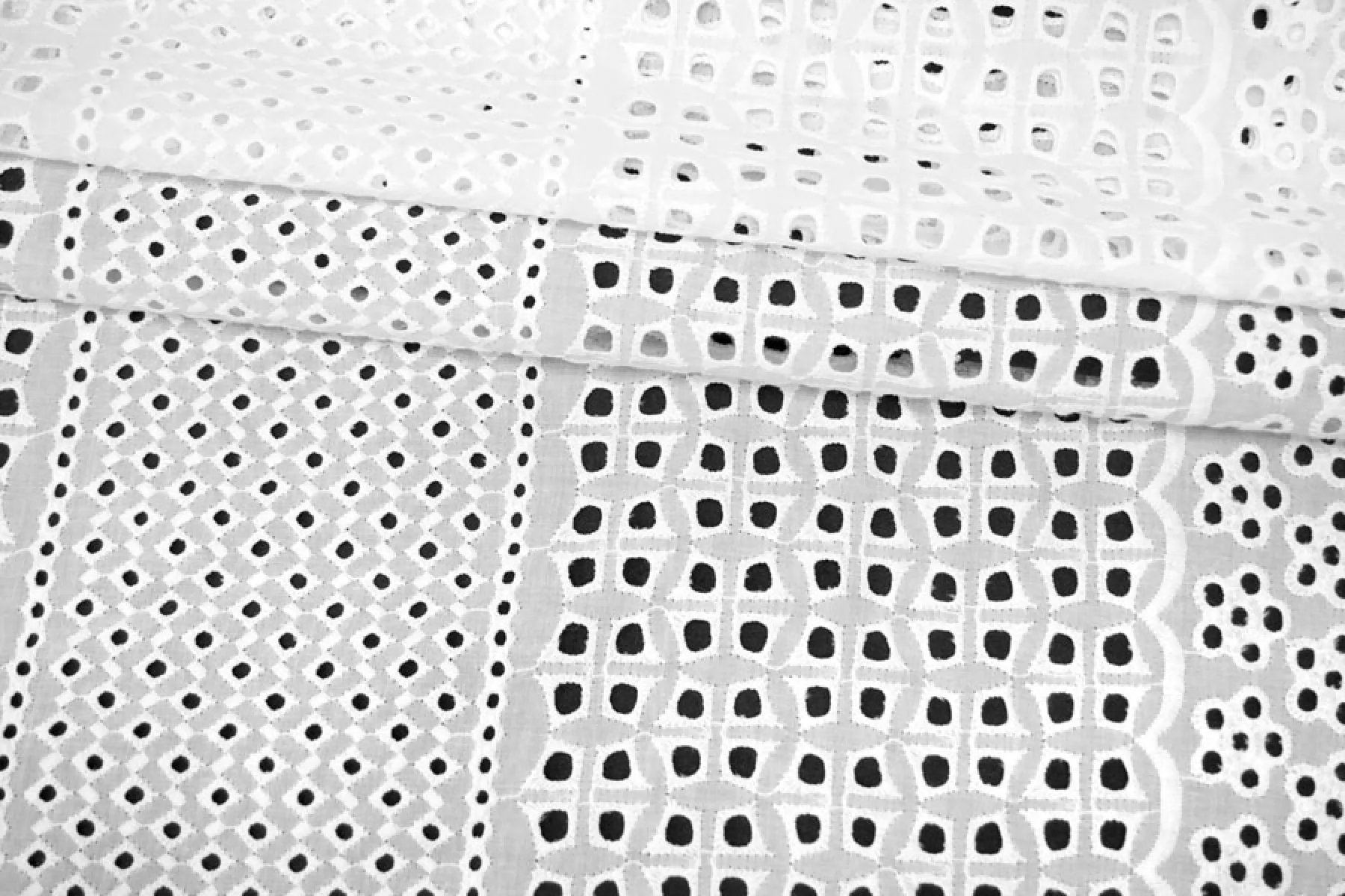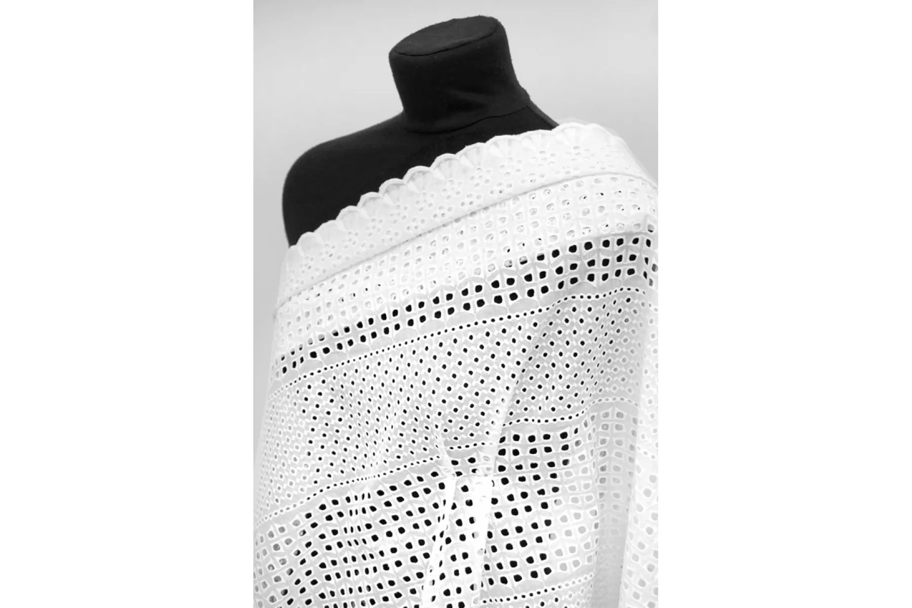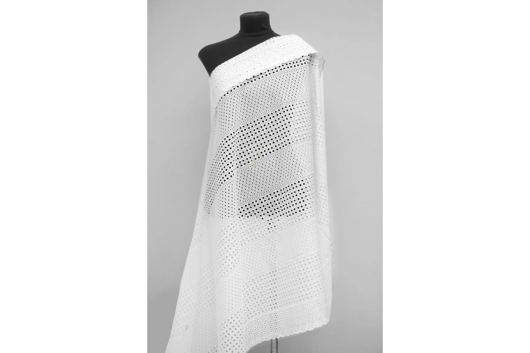 Очень красивое хлопковое шитье белого цвета с цветочным и геометричным орнаментом. В основе ткани хлопок. У материала фестонный край с двух сторон. Материал немного жестковатый, держит форму. Просвечивает. Слегка мнется. Не тянется. Прекрасный вариант на платья, сарафаны, блузки и юбки. Для однослойных изделий при необходимости используйте подкладочный материал.