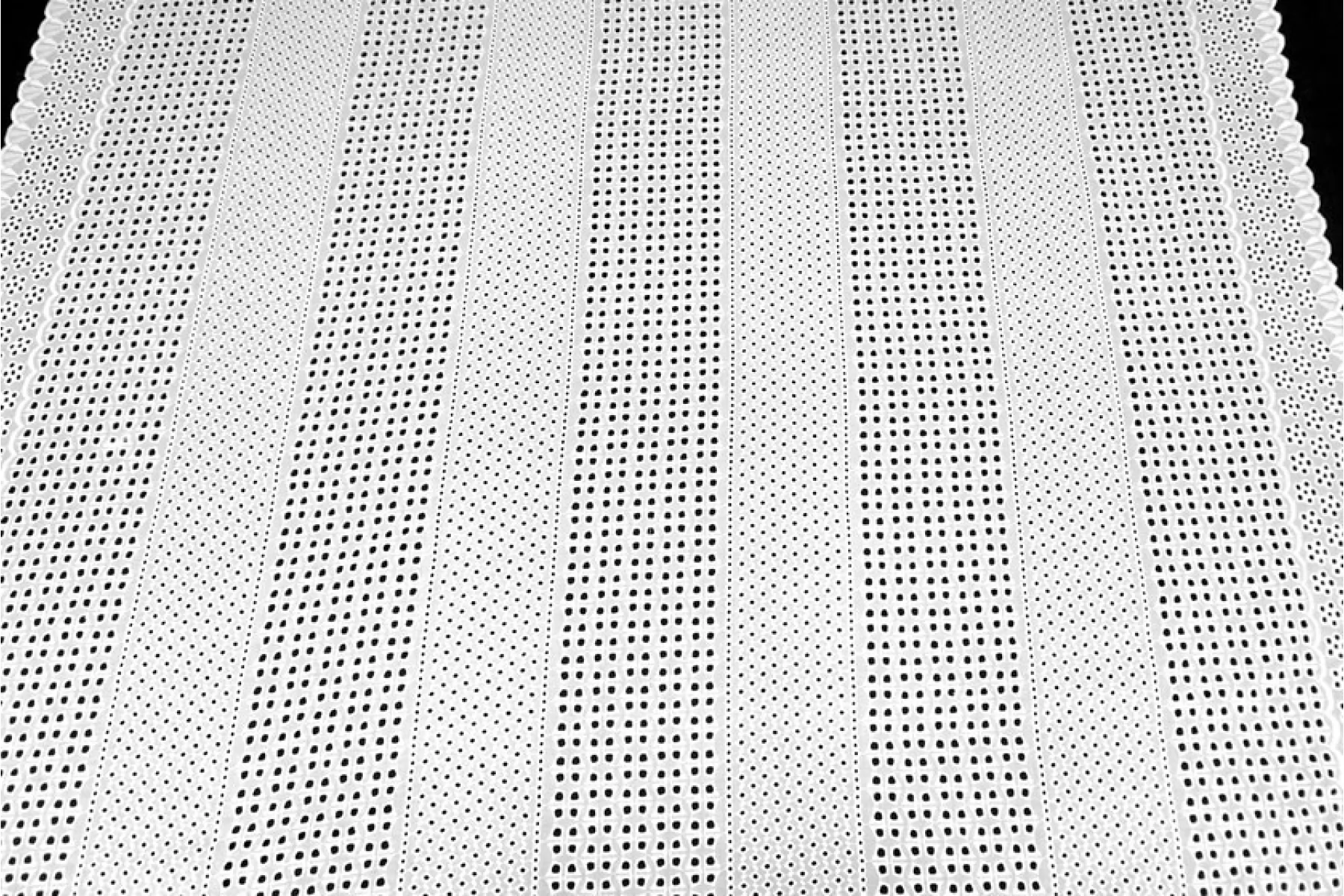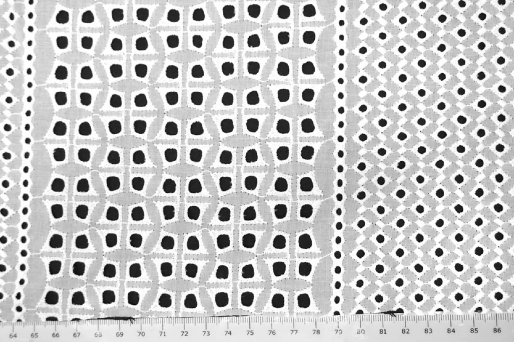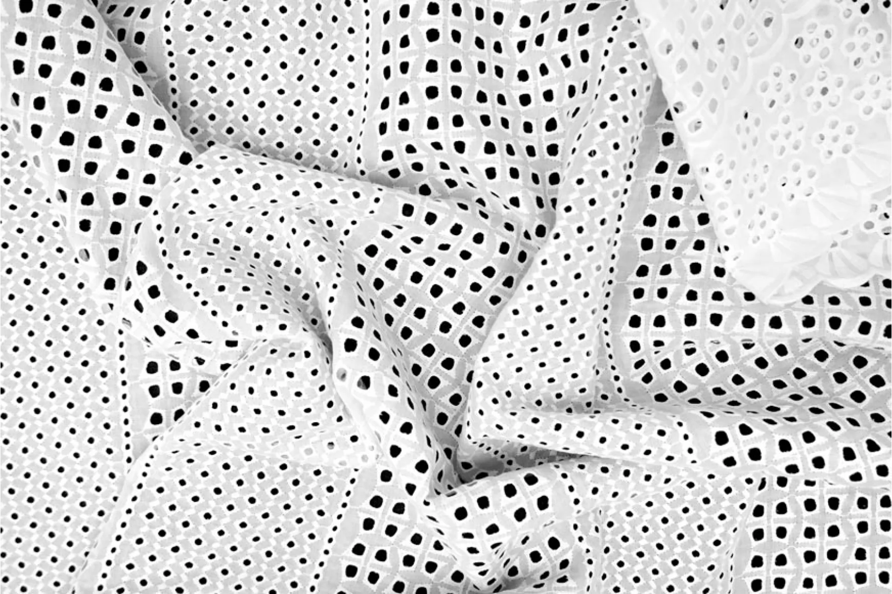 Очень красивое хлопковое шитье белого цвета с цветочным и геометричным орнаментом. В основе ткани хлопок. У материала фестонный край с двух сторон. Материал немного жестковатый, держит форму. Просвечивает. Слегка мнется. Не тянется. Прекрасный вариант на платья, сарафаны, блузки и юбки. Для однослойных изделий при необходимости используйте подкладочный материал.