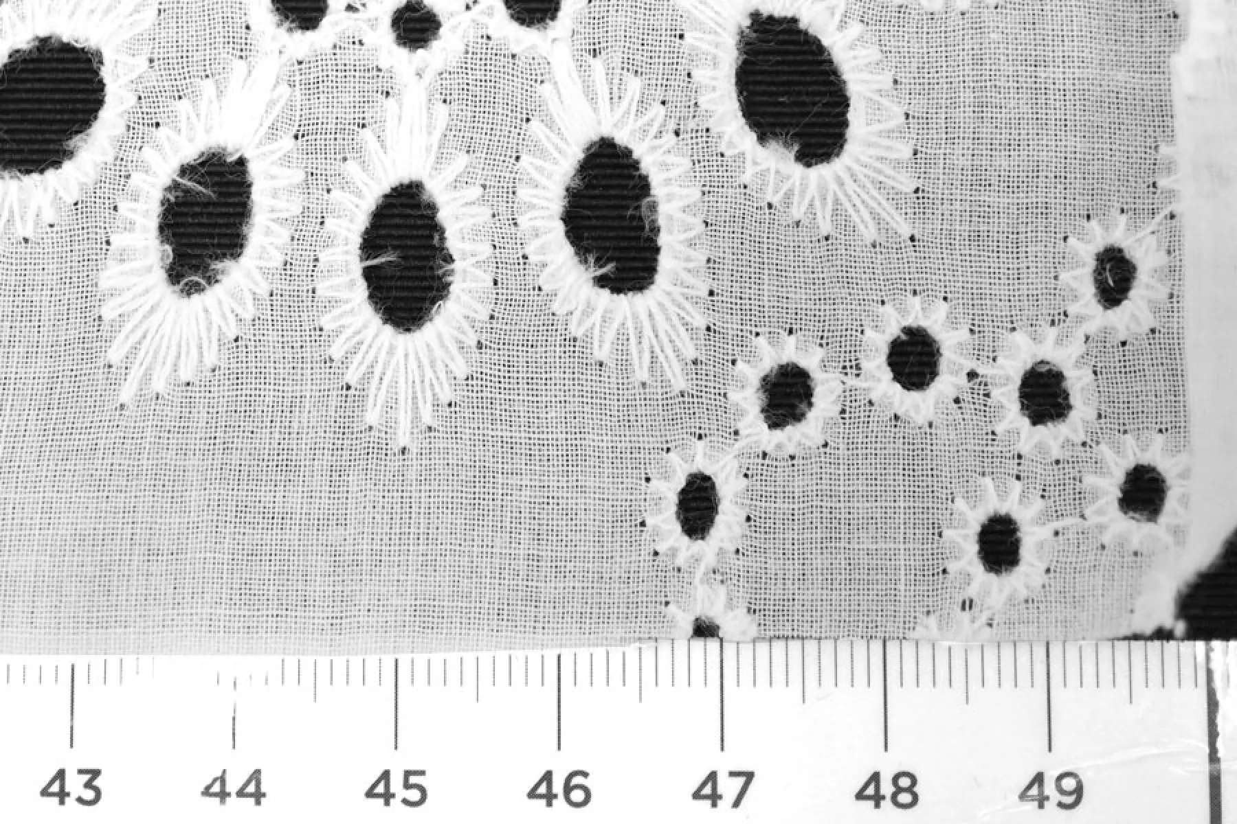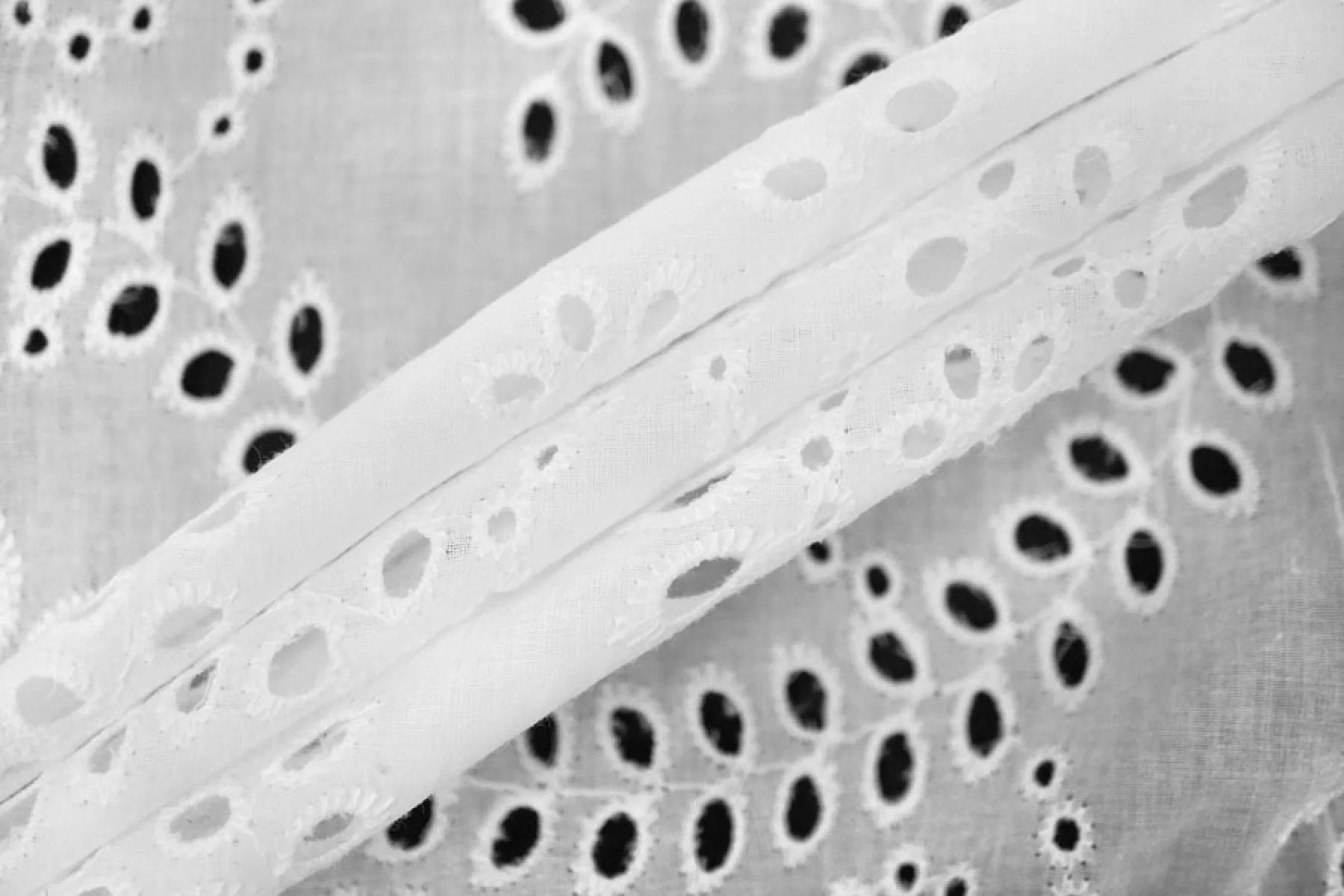 Хлопковое шитье белого цвета с выработкой узора в орнаментально-цветочном стиле. В основе ткани батист, просвечивает. У материала фестонный край с двух сторон. Материал мнется. Не тянется. Прекрасный вариант на платья, сарафаны, блузки и юбки. Для однослойных изделий при необходимости используйте подкладочный материал.