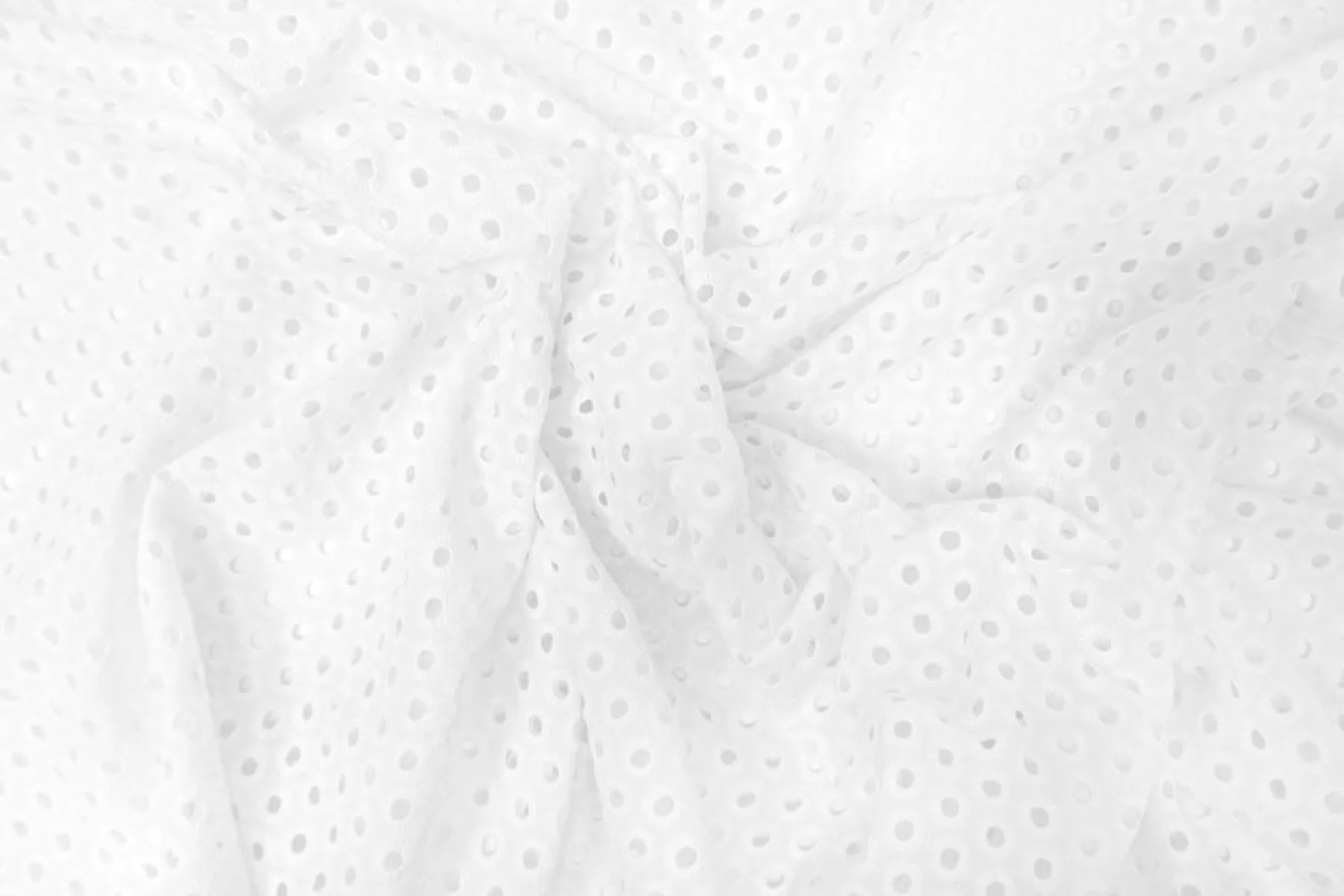 Красивое шитье белого цвета в орнамент. Смотрится красиво! Немного жестковатое.. Просвечивает силуэт. Практически не сминается. Совсем слегка растягивается. Прекрасно смотрится в складках. Шьем платья, сарафаны, блузки и юбки. Для однослойных изделий при необходимости используйте подкладочный материал.