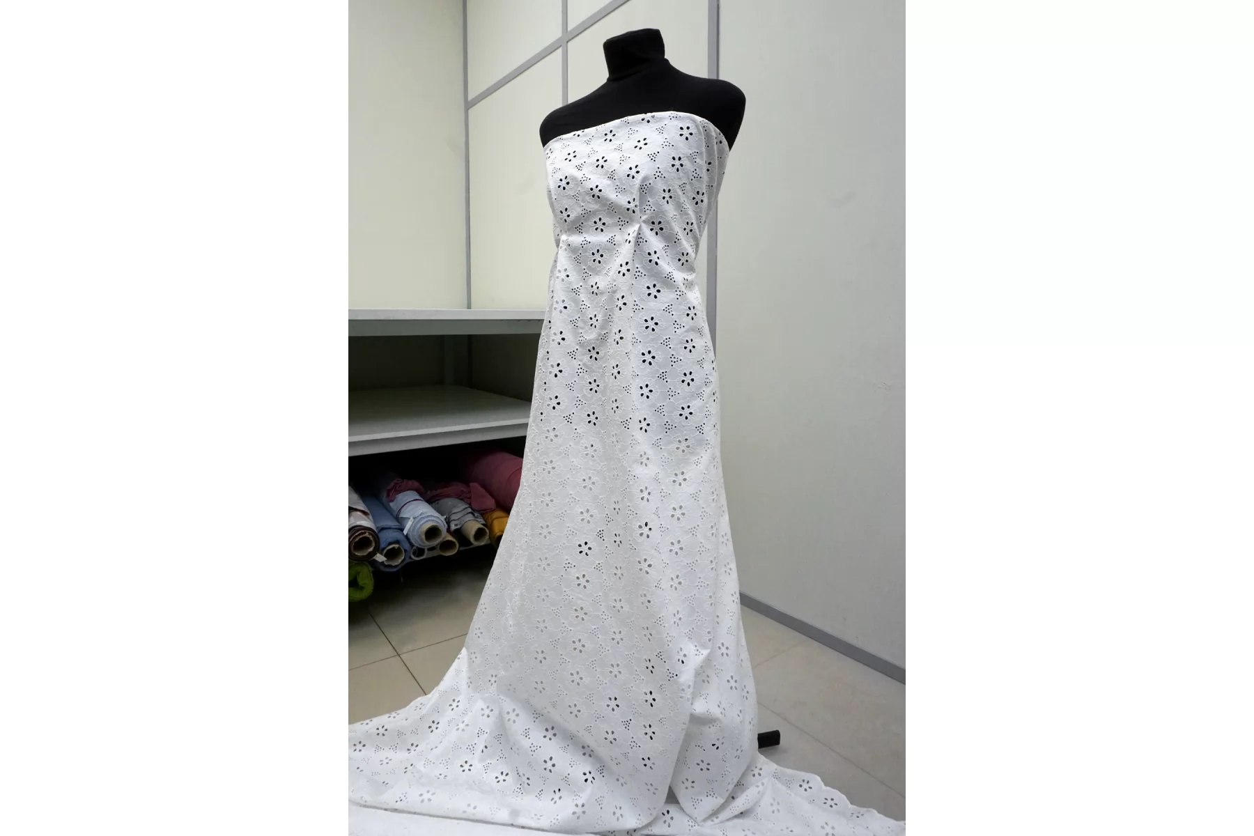 Хлопковое шитье белого цвета с выработкой узора в орнаментально-цветочном стиле. В основе ткани рубашечный хлопок диагонального плетения, просвечивает. У материала фестонный край с двух сторон. Материал мнется. Не тянется. Прекрасный вариант на платья, сарафаны, блузки и юбки. Для однослойных изделий при необходимости используйте подкладочный материал.