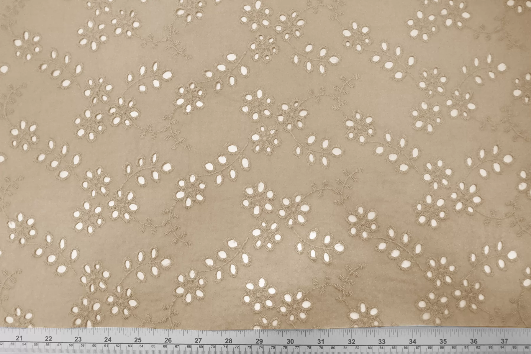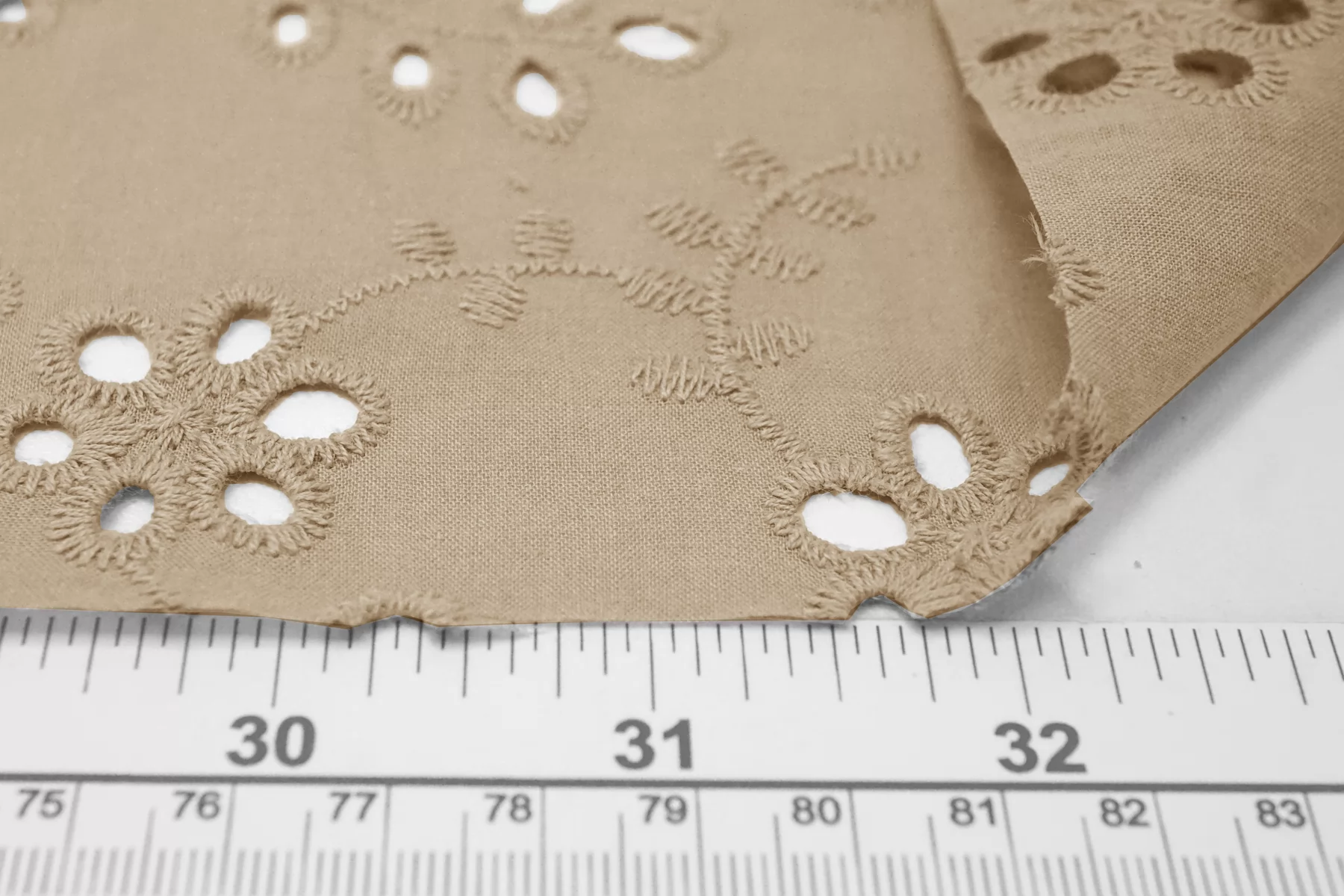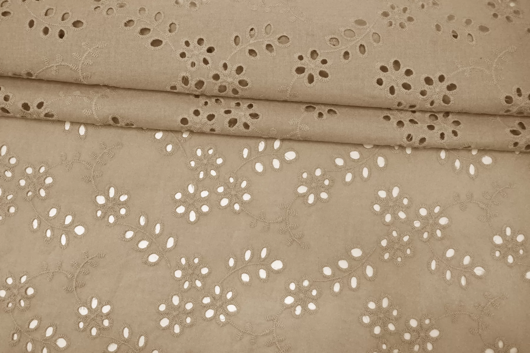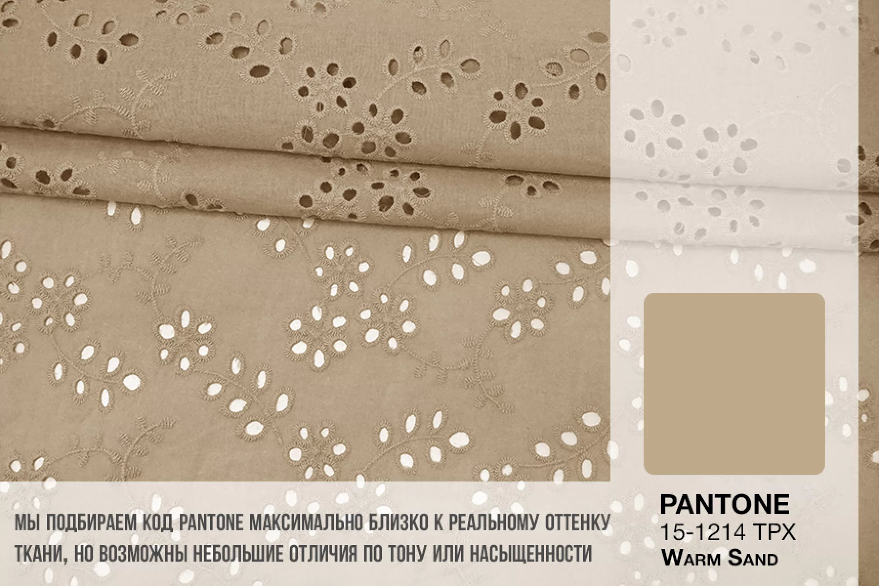 Общая ширина 143 см, ширина участка с вышивкой - 133 см. Хлопковое шитье бежевого цвета с цветочными узорами. В основе ткани хлопковый батист. Без фестонного края. Материал мнется. Не тянется. Прекрасный вариант на платья, сарафаны, блузки и юбки. Для однослойных изделий при необходимости используйте подкладочный материал.