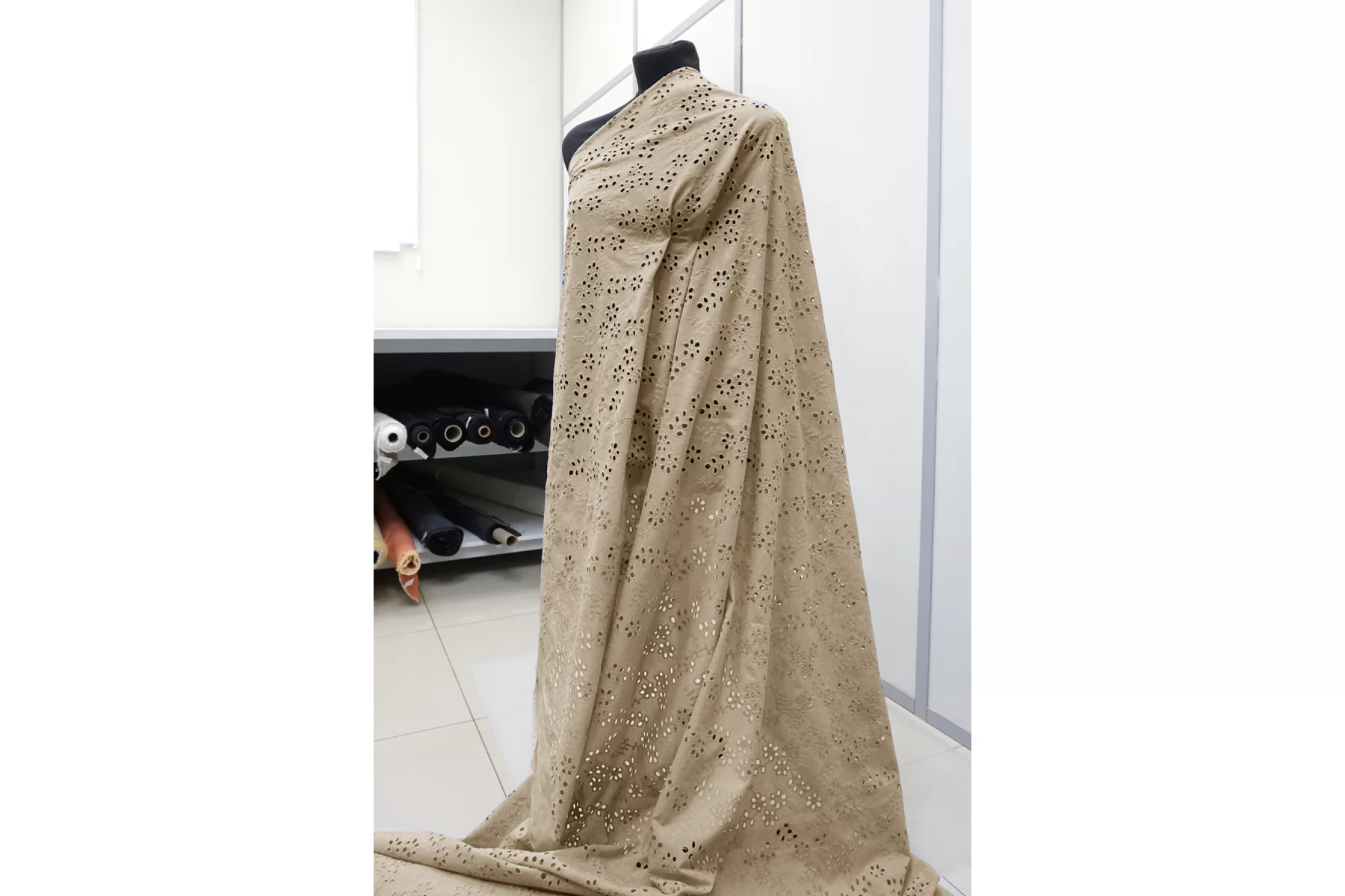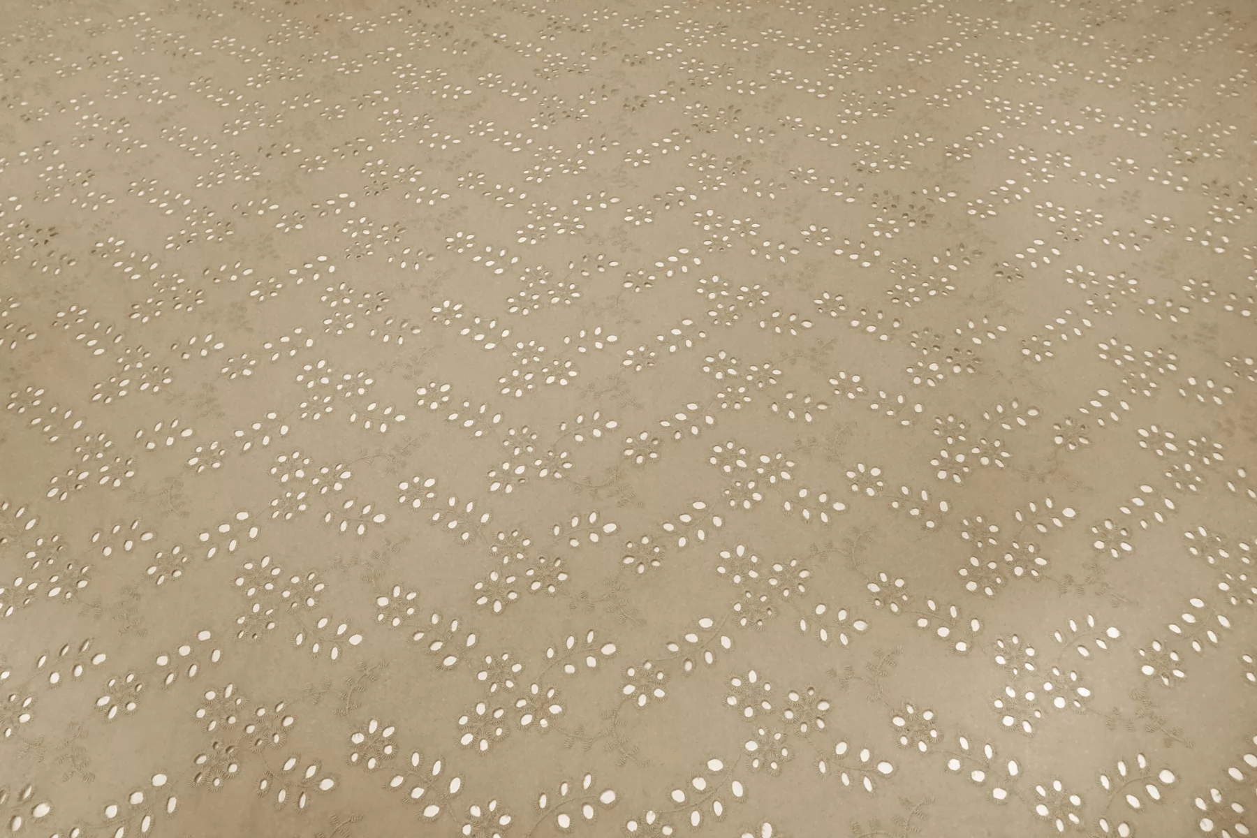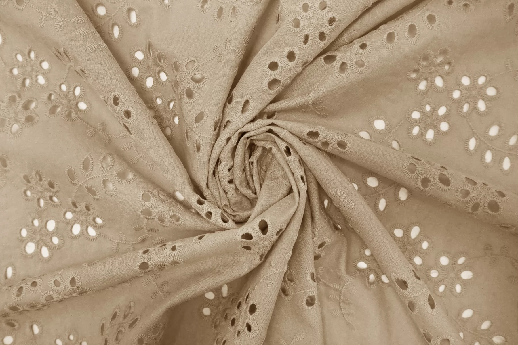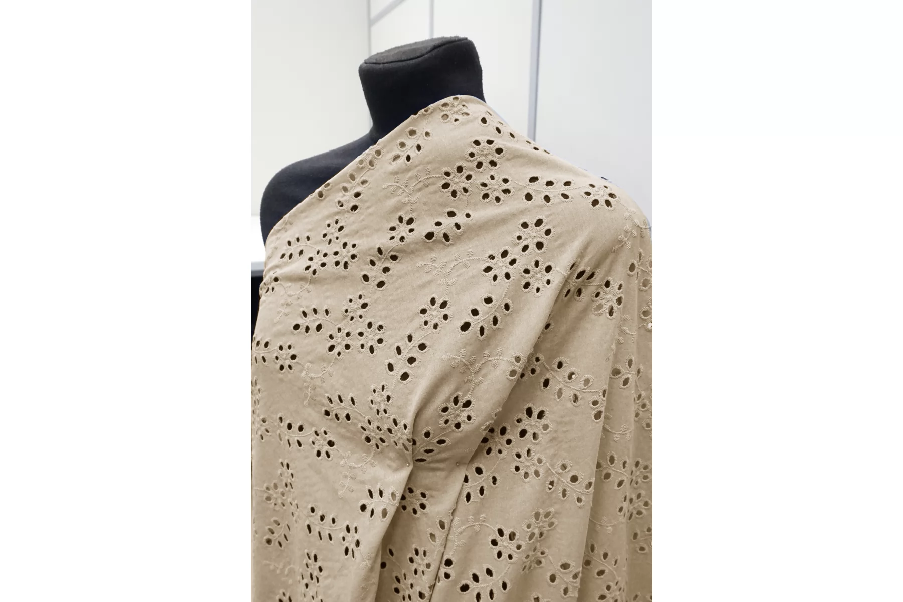 Общая ширина 143 см, ширина участка с вышивкой - 133 см. Хлопковое шитье бежевого цвета с цветочными узорами. В основе ткани хлопковый батист. Без фестонного края. Материал мнется. Не тянется. Прекрасный вариант на платья, сарафаны, блузки и юбки. Для однослойных изделий при необходимости используйте подкладочный материал.