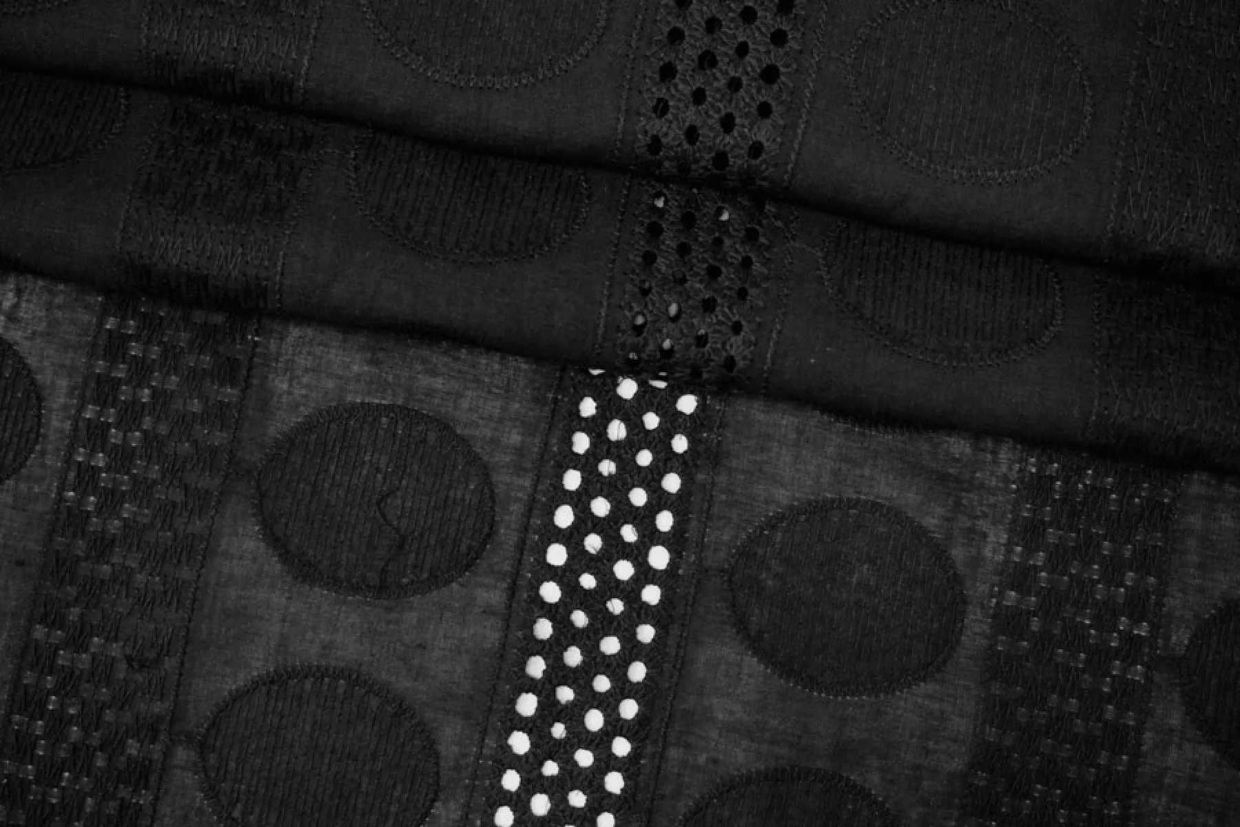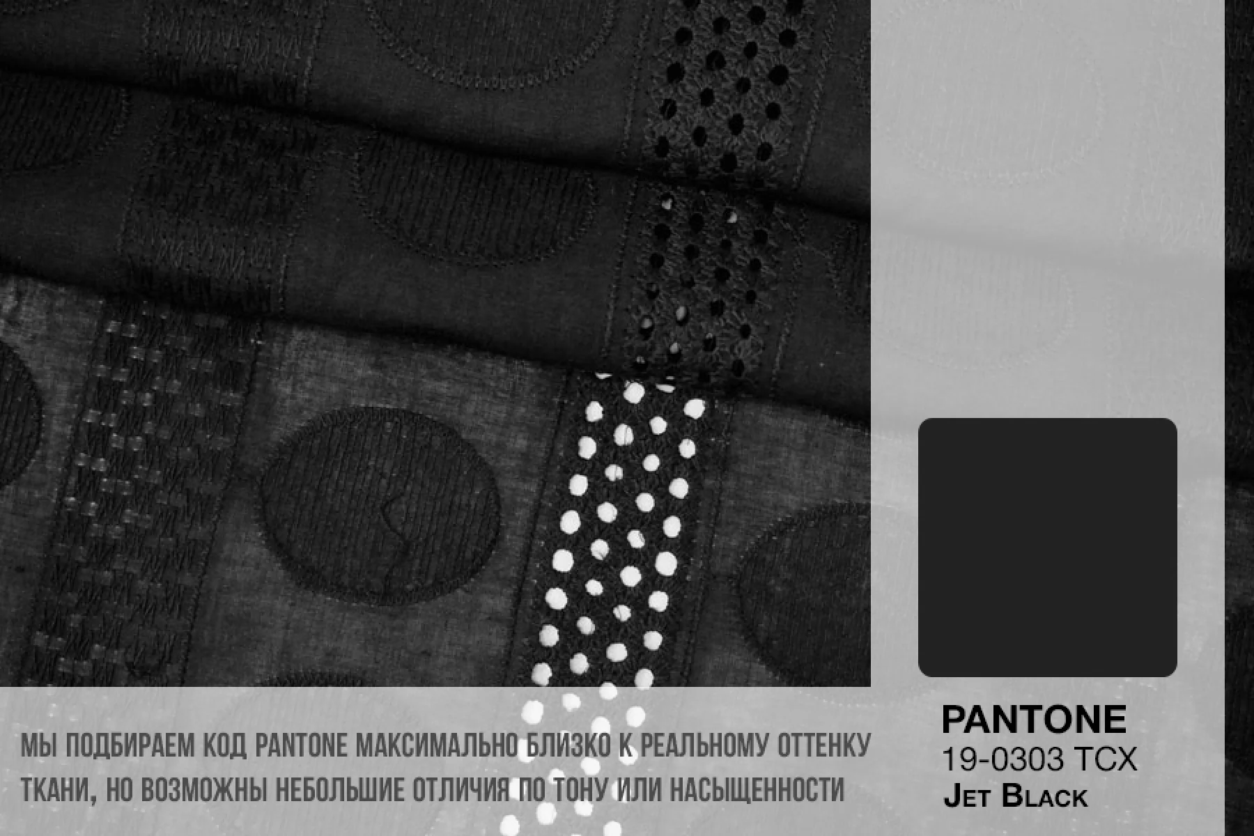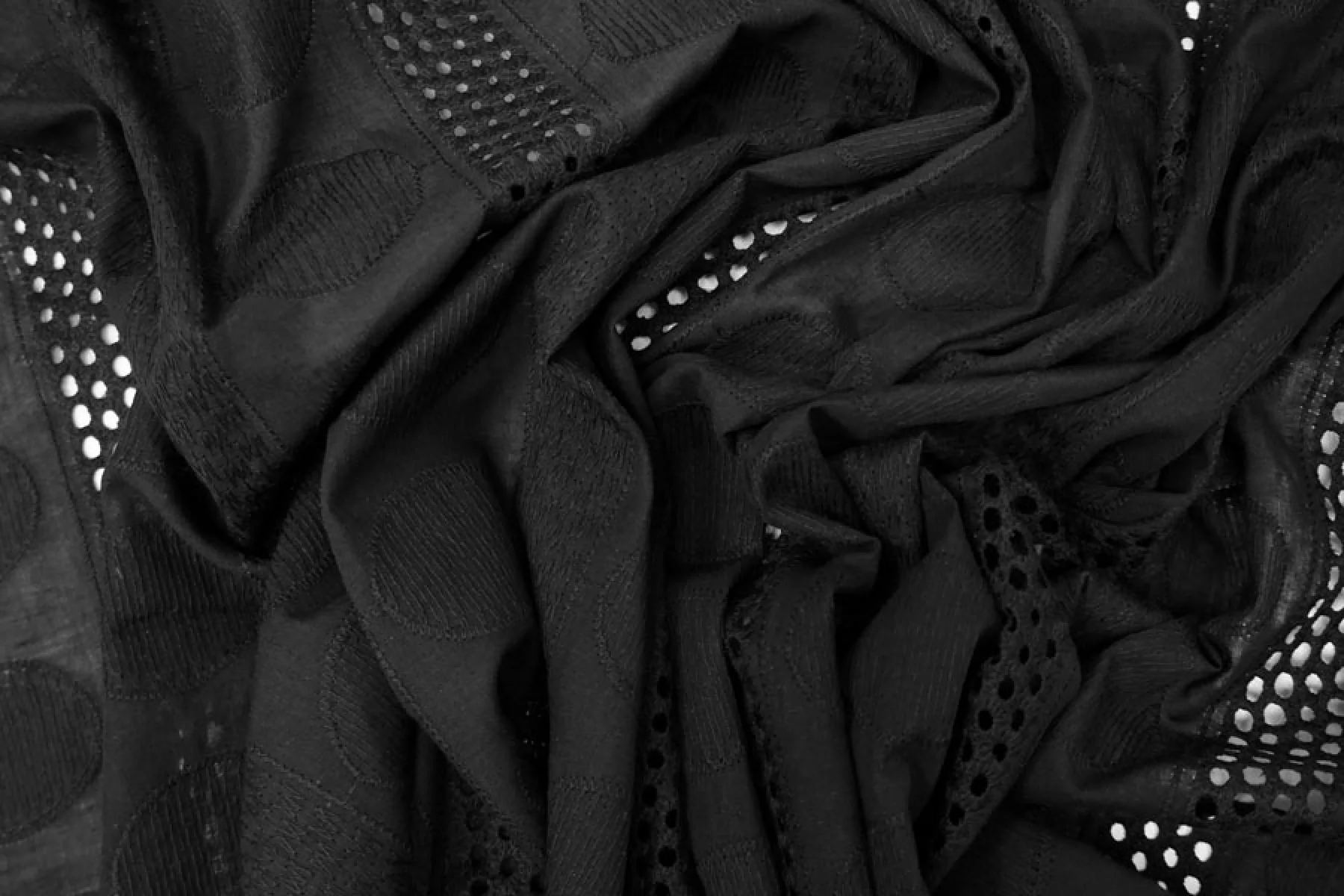 Интересное хлопковое шитье черного цвета в виде кругов и полос. Немного суховатой и чуть-чуть жестковатое наощупь. Форму держит хорошо. Не тянется. Просвечивает. Практически не мнется. Отличный летний вариант на платья, сарафаны, рубашки, накидки, юбки.