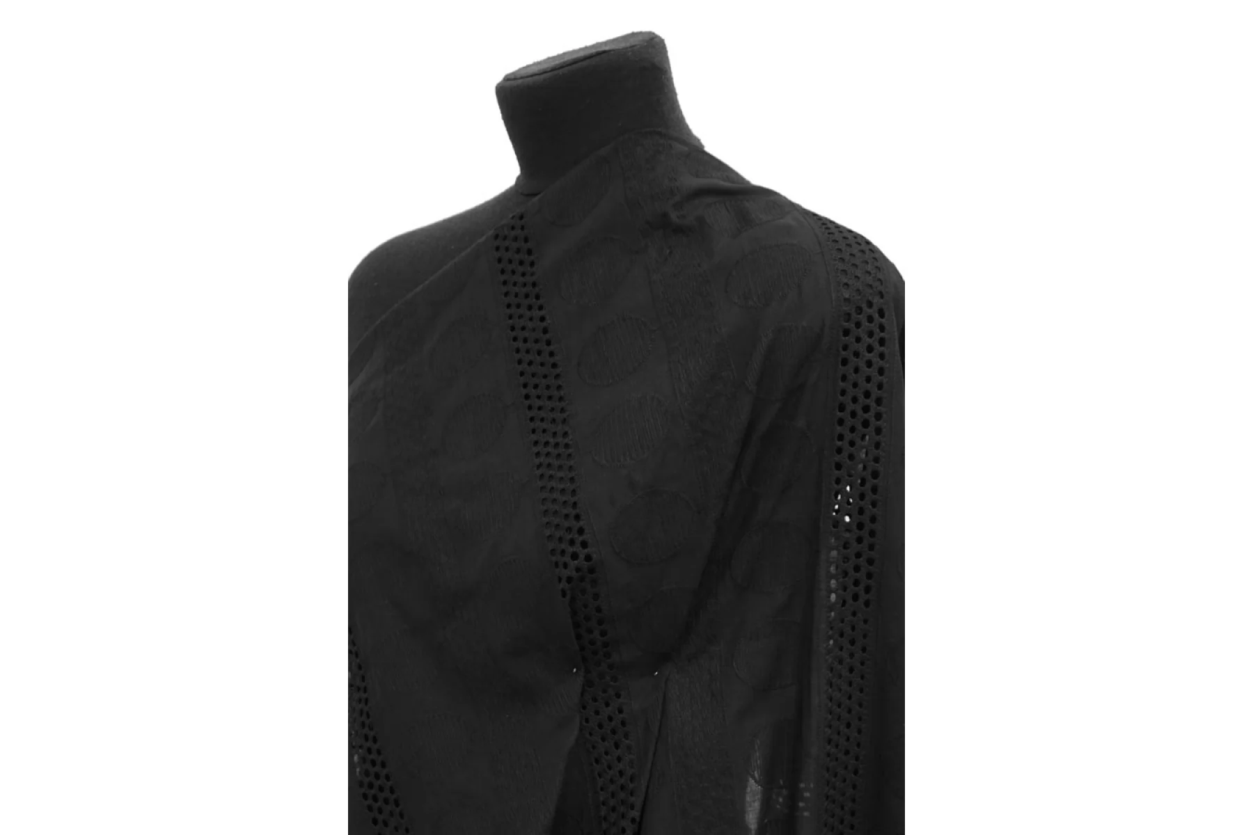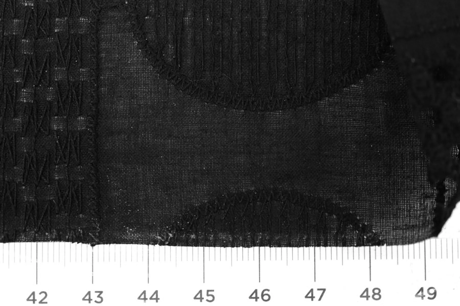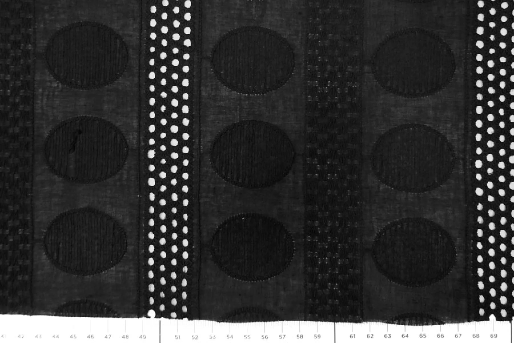 Интересное хлопковое шитье черного цвета в виде кругов и полос. Немного суховатой и чуть-чуть жестковатое наощупь. Форму держит хорошо. Не тянется. Просвечивает. Практически не мнется. Отличный летний вариант на платья, сарафаны, рубашки, накидки, юбки.