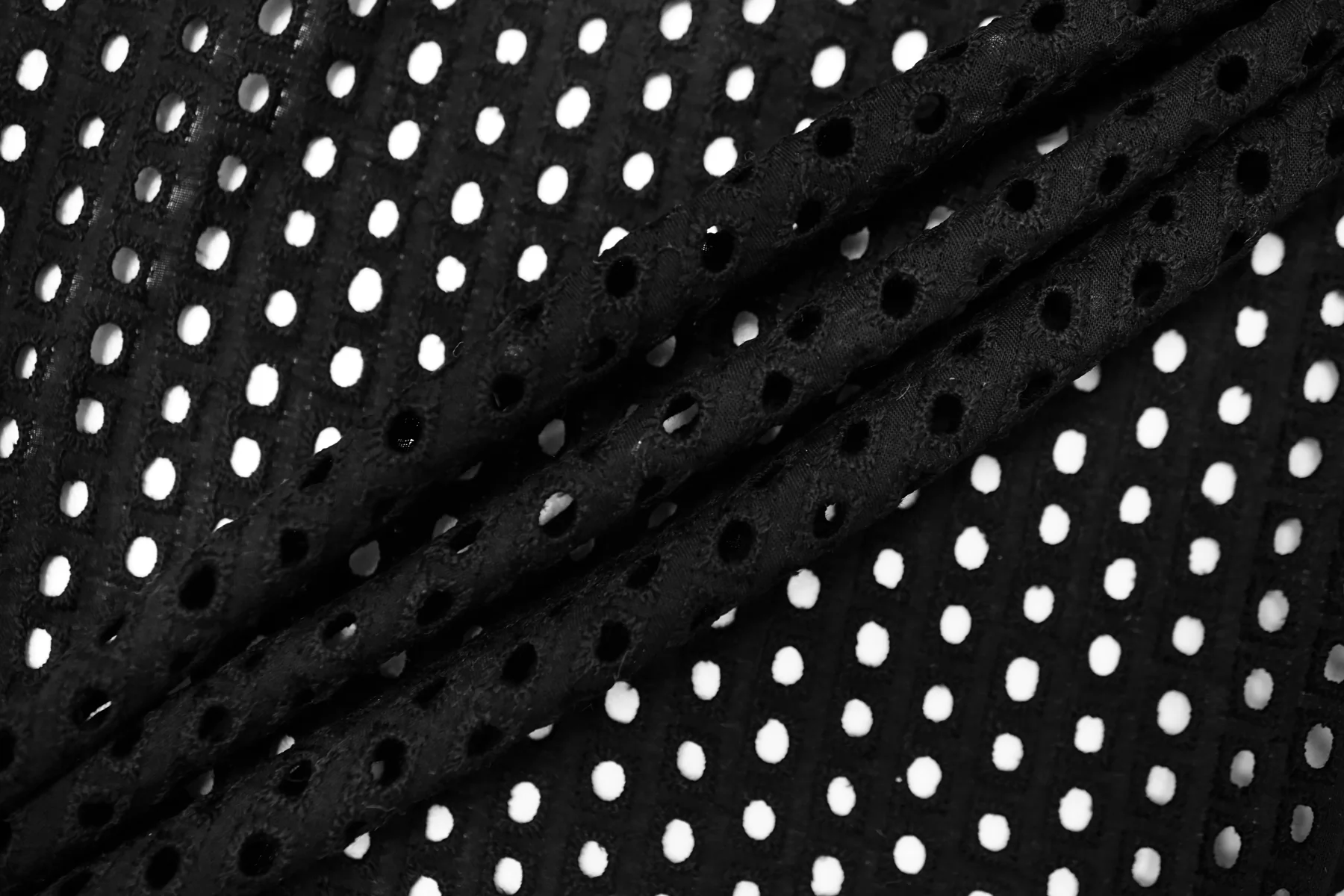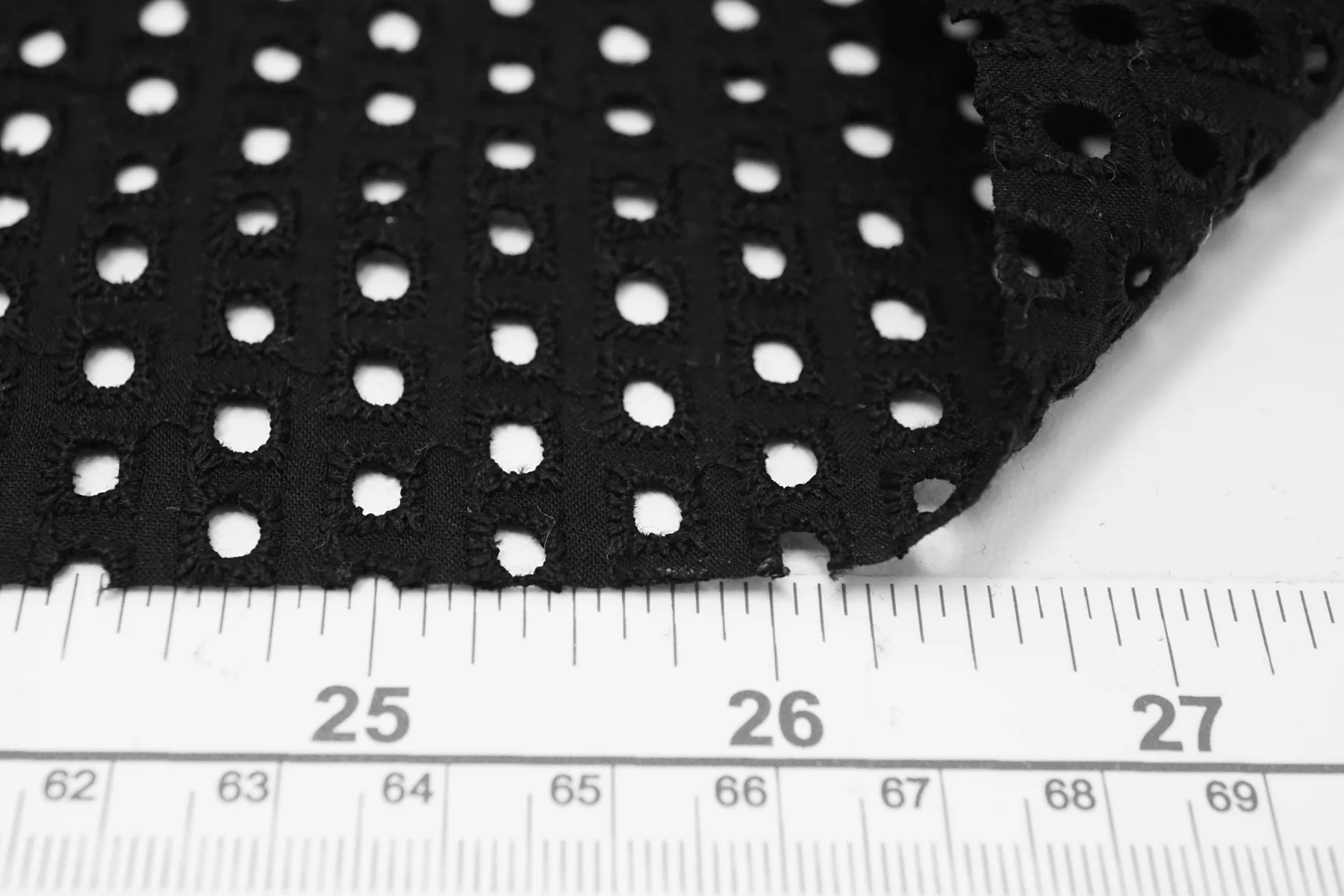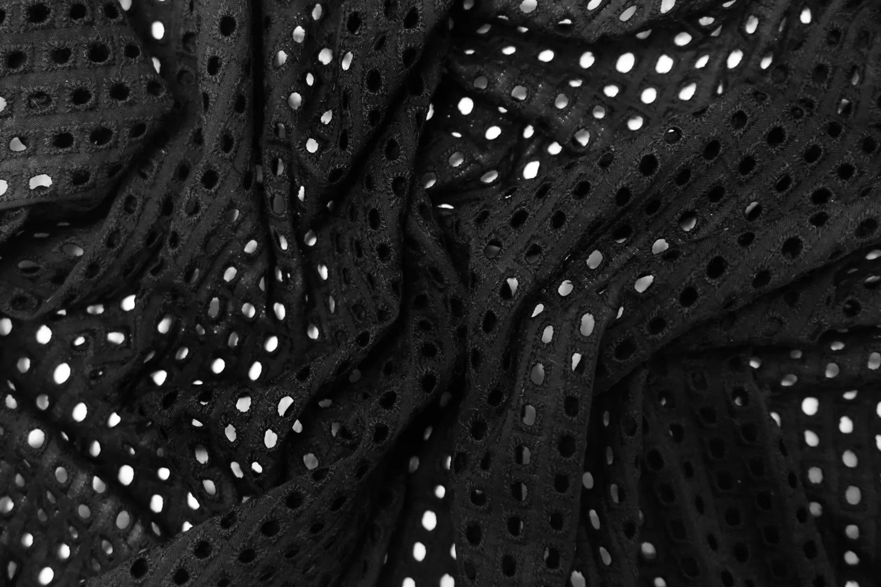Общая ширина 133 см, ширина участка с вышивкой - 127 см. Хлопковое шитье чёрного цвета с узором-кружочками. В основе ткани хлопковый батист. Слегка жёсткое из-за плотной вышивки. Без фестонного края. Материал мнется. Не тянется. Прекрасный вариант на платья, сарафаны, блузки и юбки. Для однослойных изделий при необходимости используйте подкладочный материал.