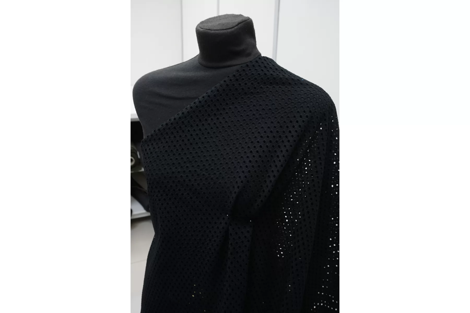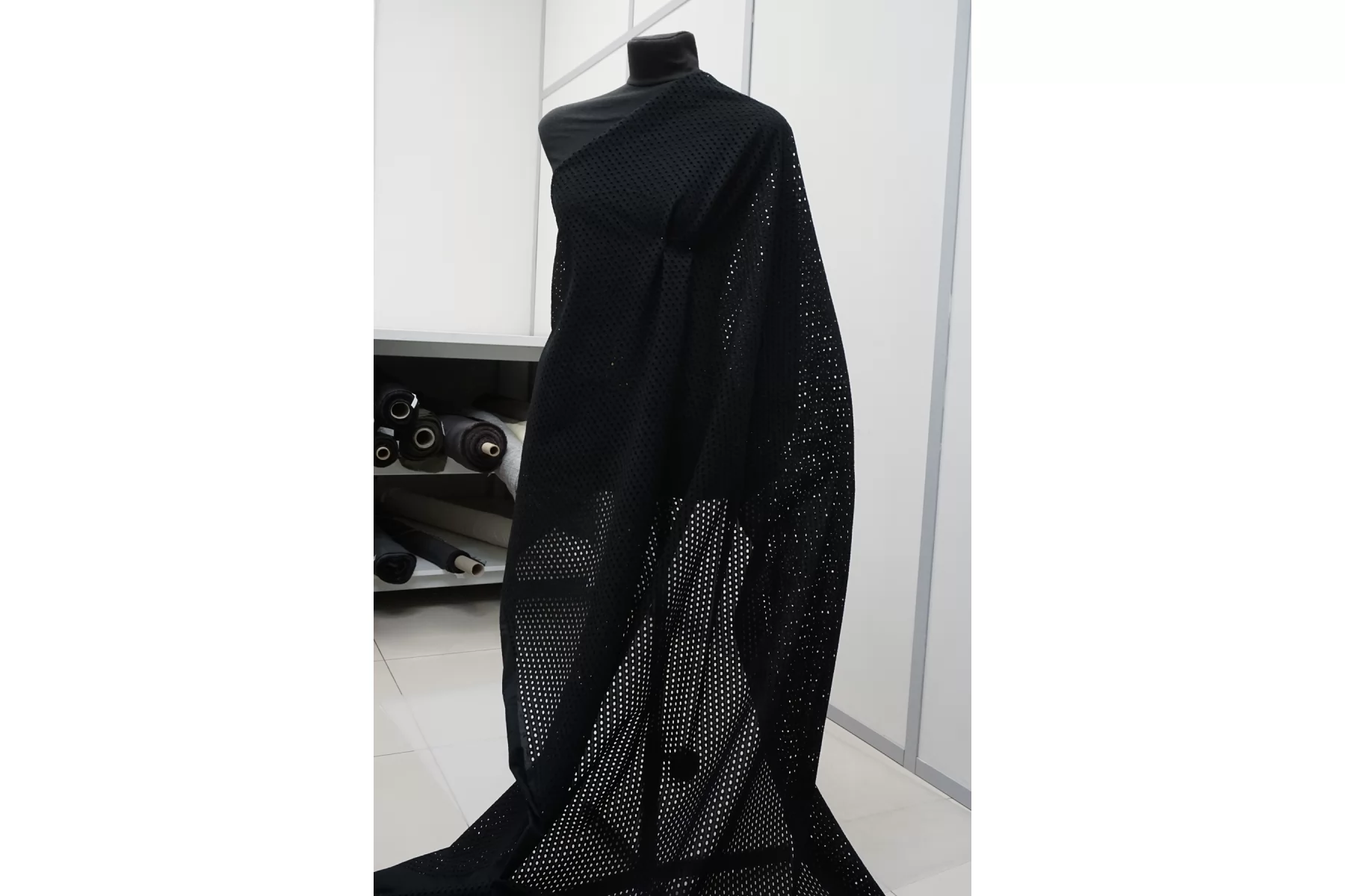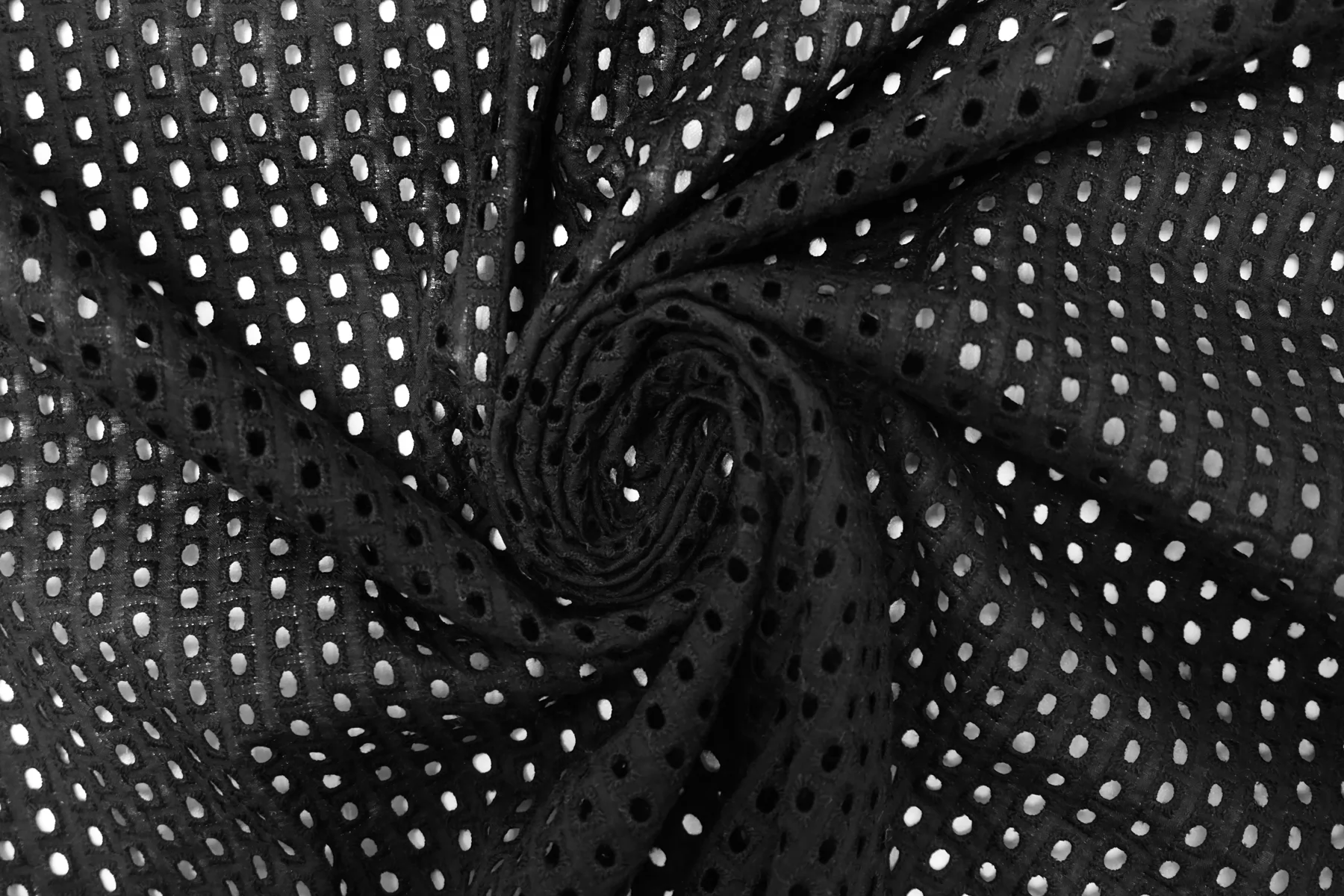 Общая ширина 133 см, ширина участка с вышивкой - 127 см. Хлопковое шитье чёрного цвета с узором-кружочками. В основе ткани хлопковый батист. Слегка жёсткое из-за плотной вышивки. Без фестонного края. Материал мнется. Не тянется. Прекрасный вариант на платья, сарафаны, блузки и юбки. Для однослойных изделий при необходимости используйте подкладочный материал.