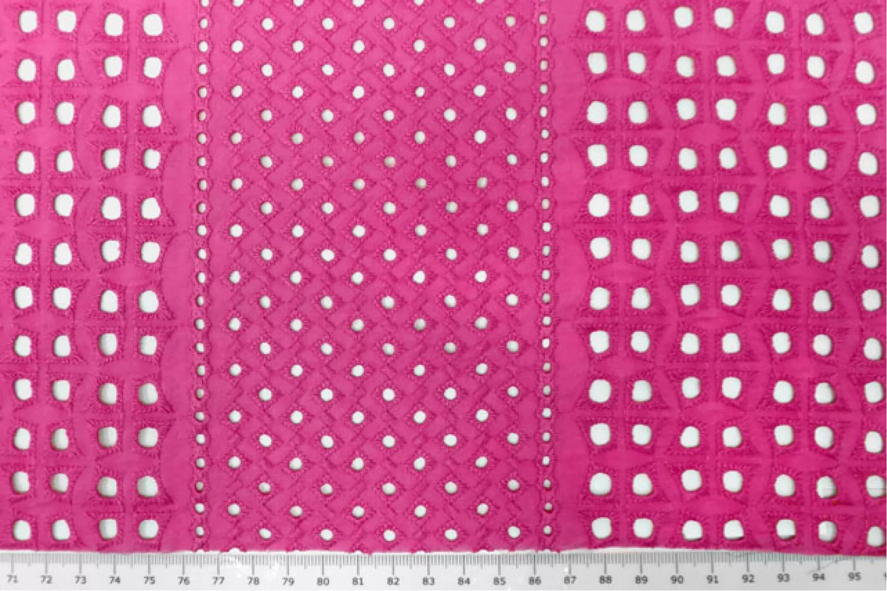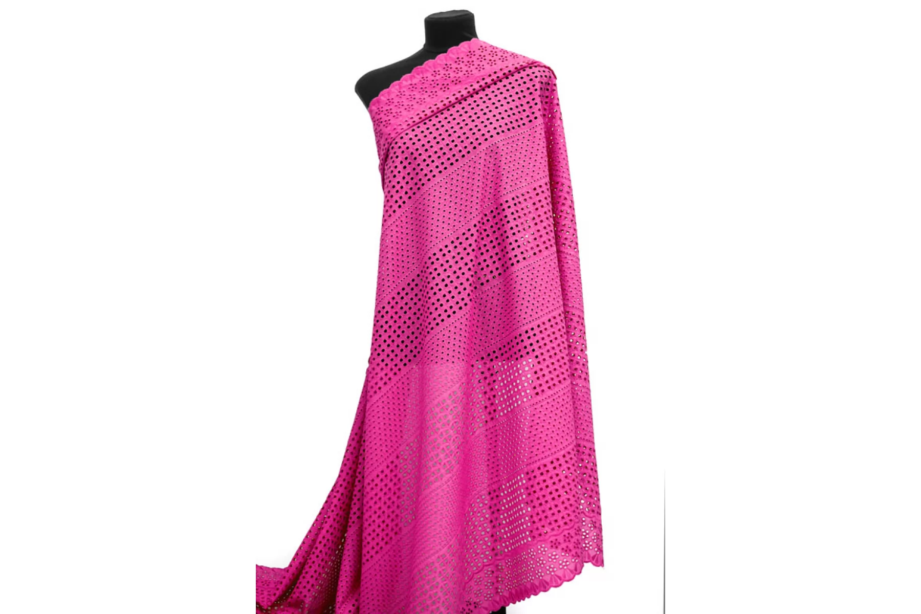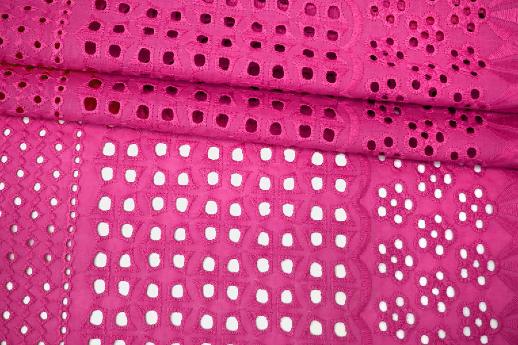 Очень красивое хлопковое шитье цвета фуксии с цветочным и геометричным орнаментом. В основе ткани хлопок. У материала фестонный край с двух сторон. Материал немного жестковатый, держит форму. Просвечивает. Слегка мнется. Не тянется. Прекрасный вариант на платья, сарафаны, блузки и юбки. Для однослойных изделий при необходимости используйте подкладочный материал.