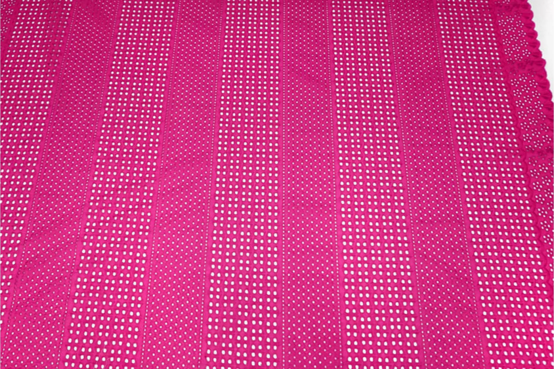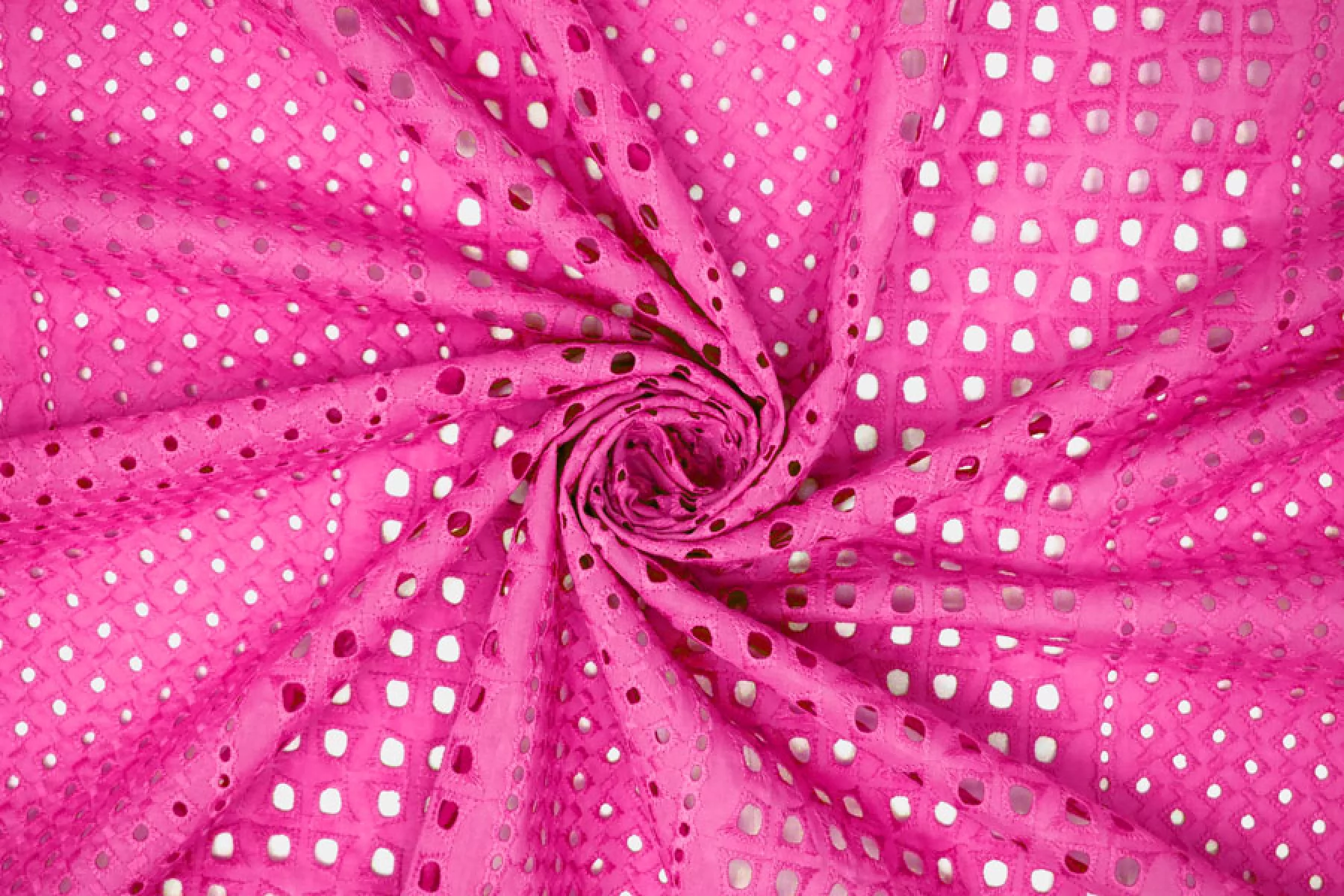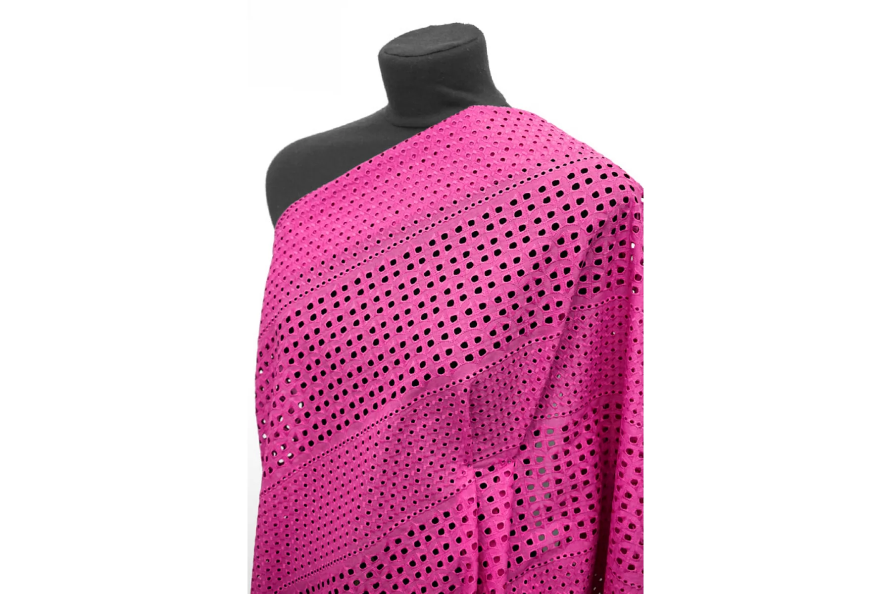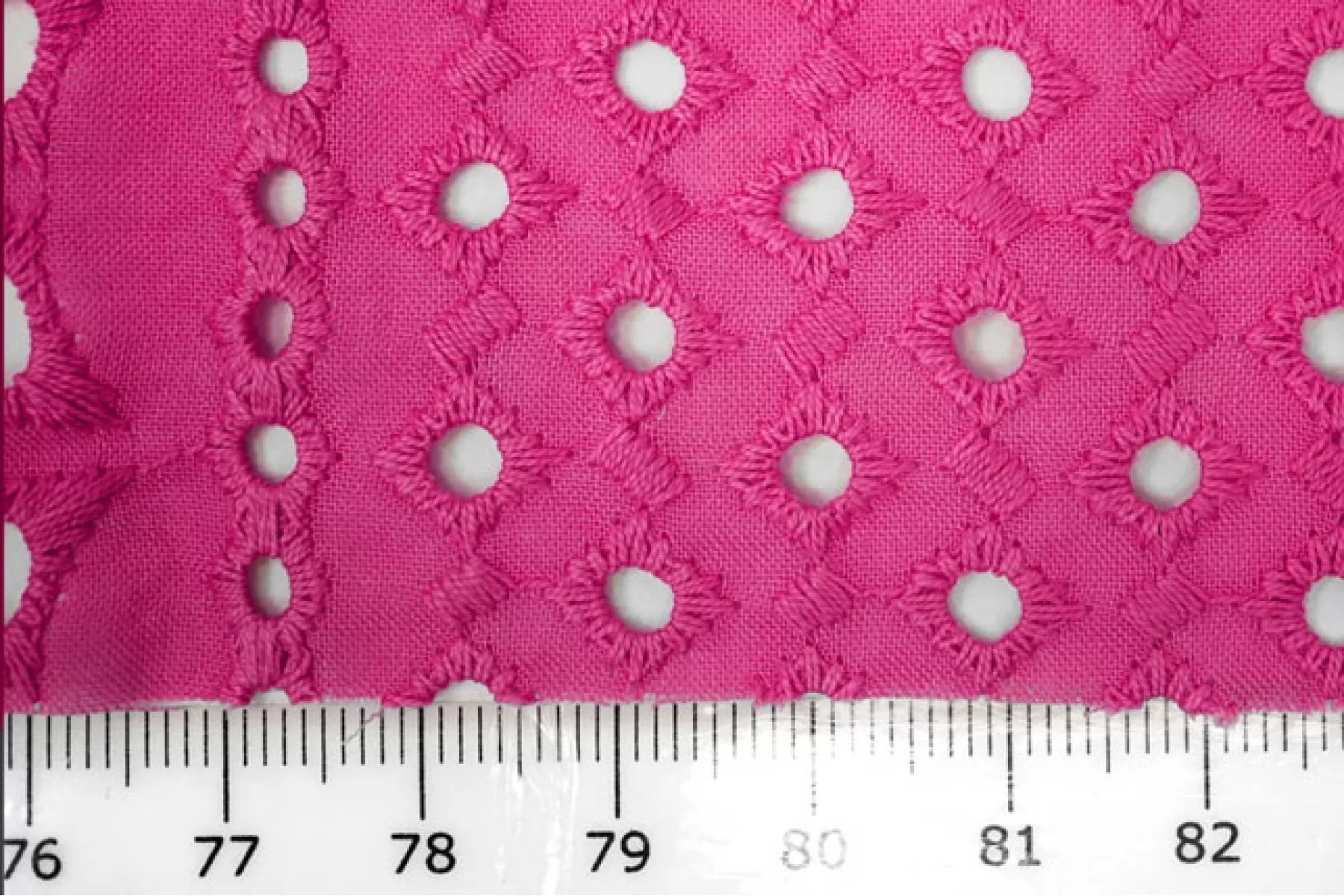 Очень красивое хлопковое шитье цвета фуксии с цветочным и геометричным орнаментом. В основе ткани хлопок. У материала фестонный край с двух сторон. Материал немного жестковатый, держит форму. Просвечивает. Слегка мнется. Не тянется. Прекрасный вариант на платья, сарафаны, блузки и юбки. Для однослойных изделий при необходимости используйте подкладочный материал.