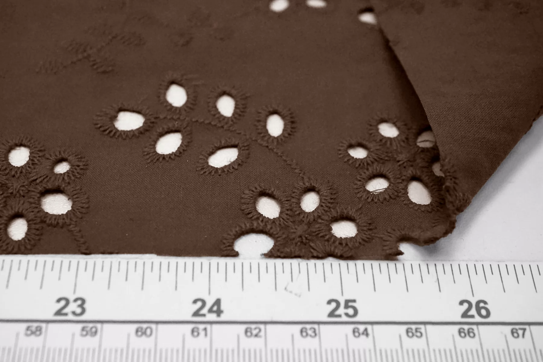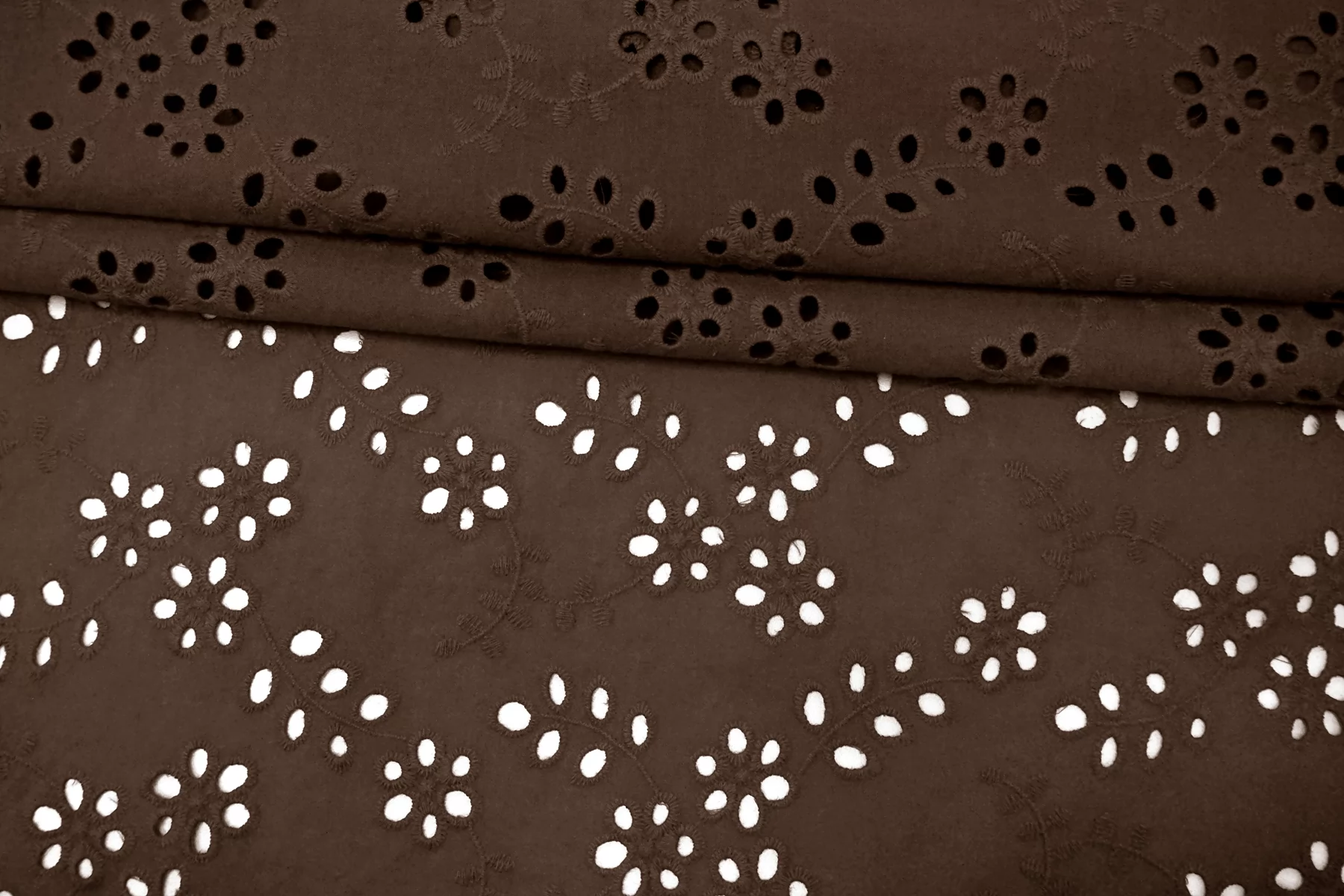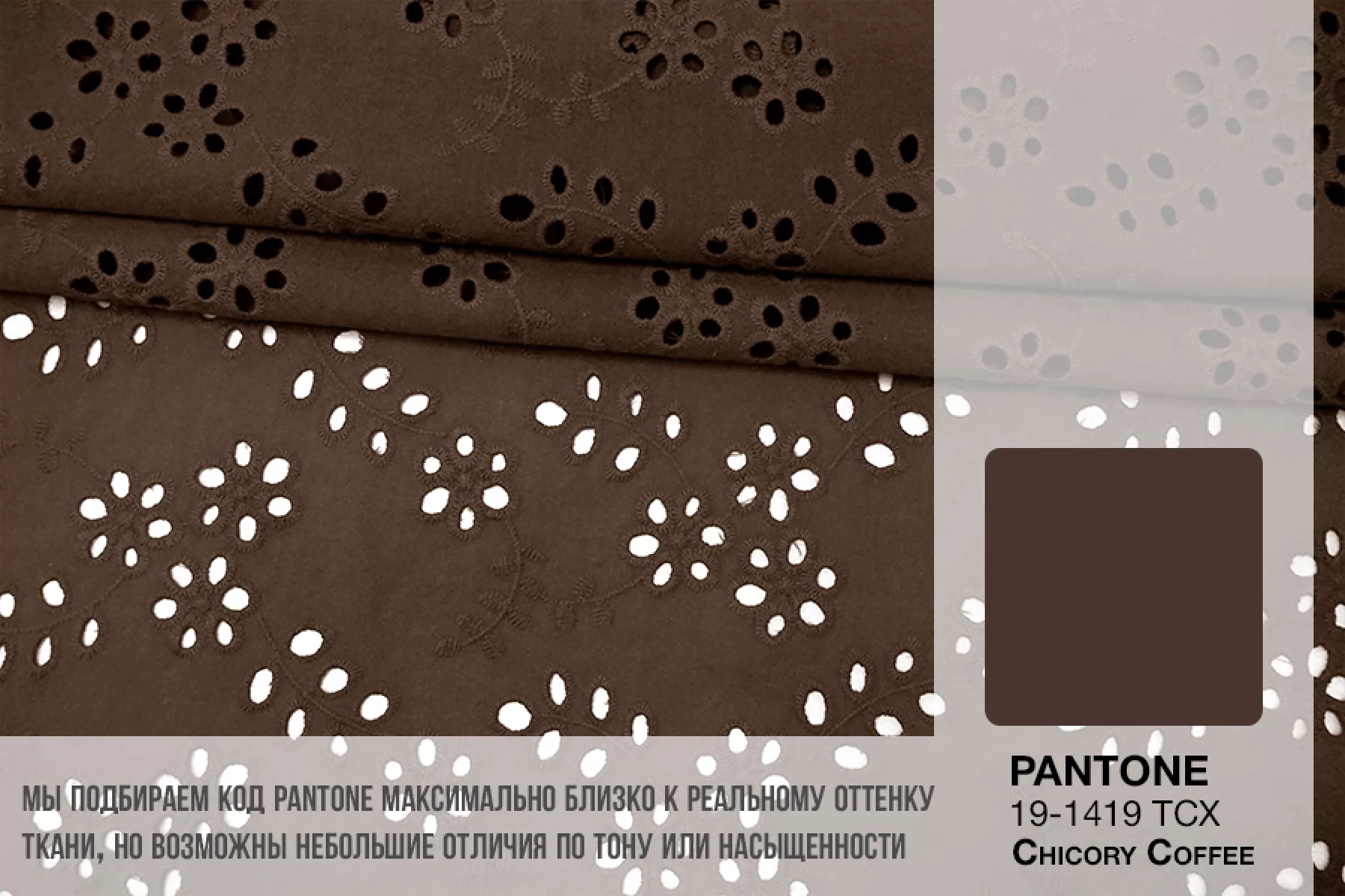 Общая ширина 143 см, ширина участка с вышивкой - 133 см. Хлопковое шитье коричневого цвета с цветочными узорами. В основе ткани хлопковый батист. Без фестонного края. Материал мнется. Не тянется. Прекрасный вариант на платья, сарафаны, блузки и юбки. Для однослойных изделий при необходимости используйте подкладочный материал.