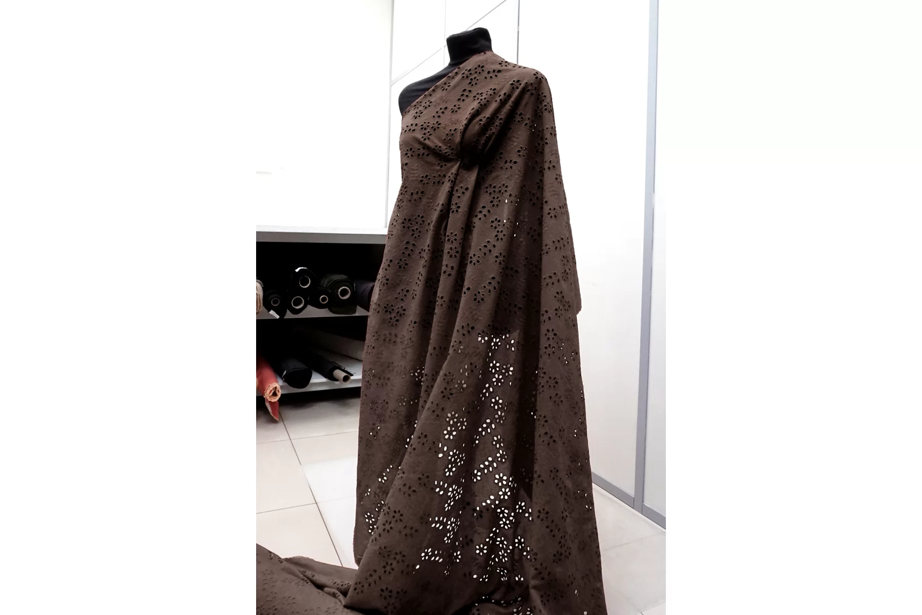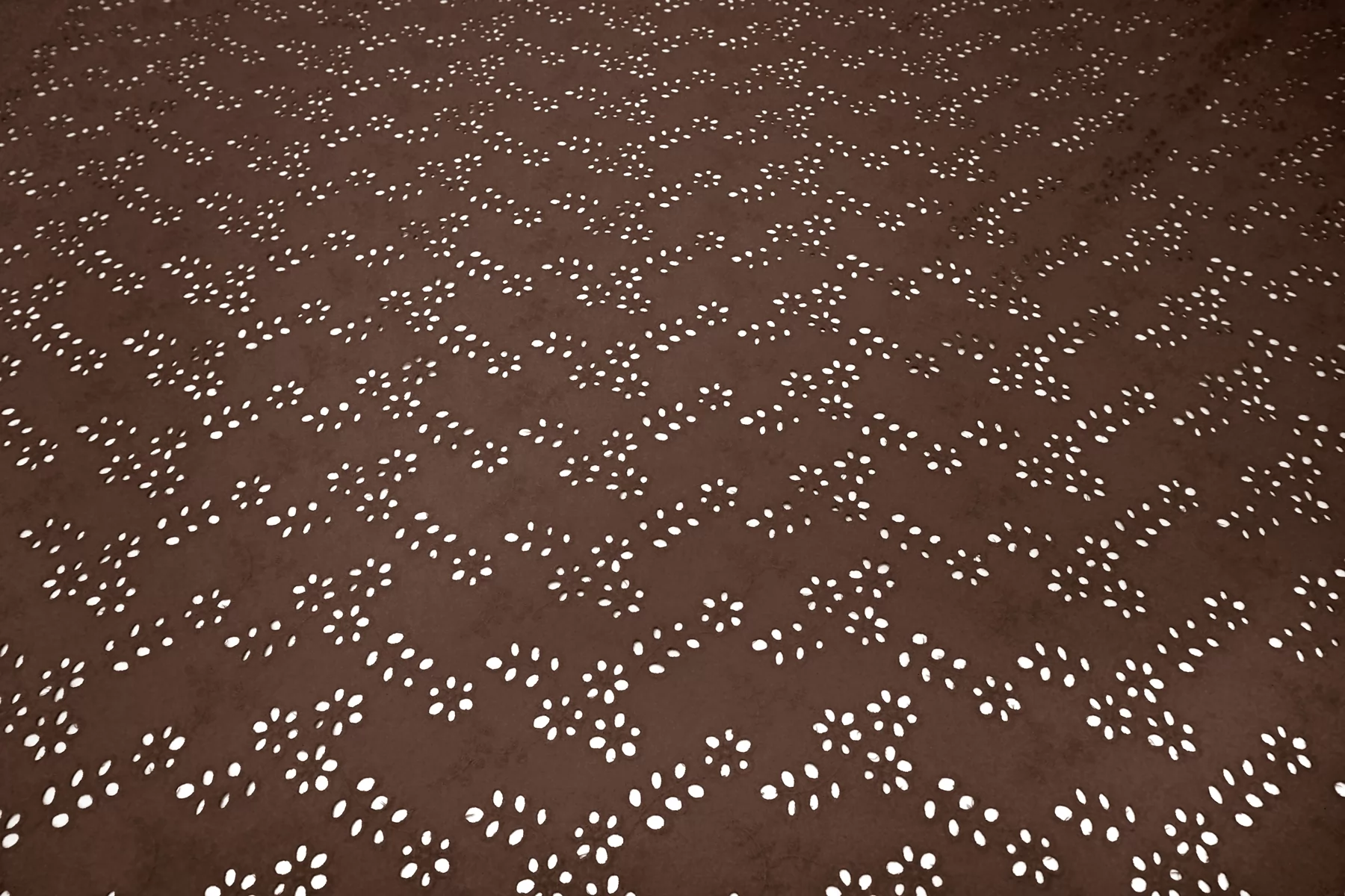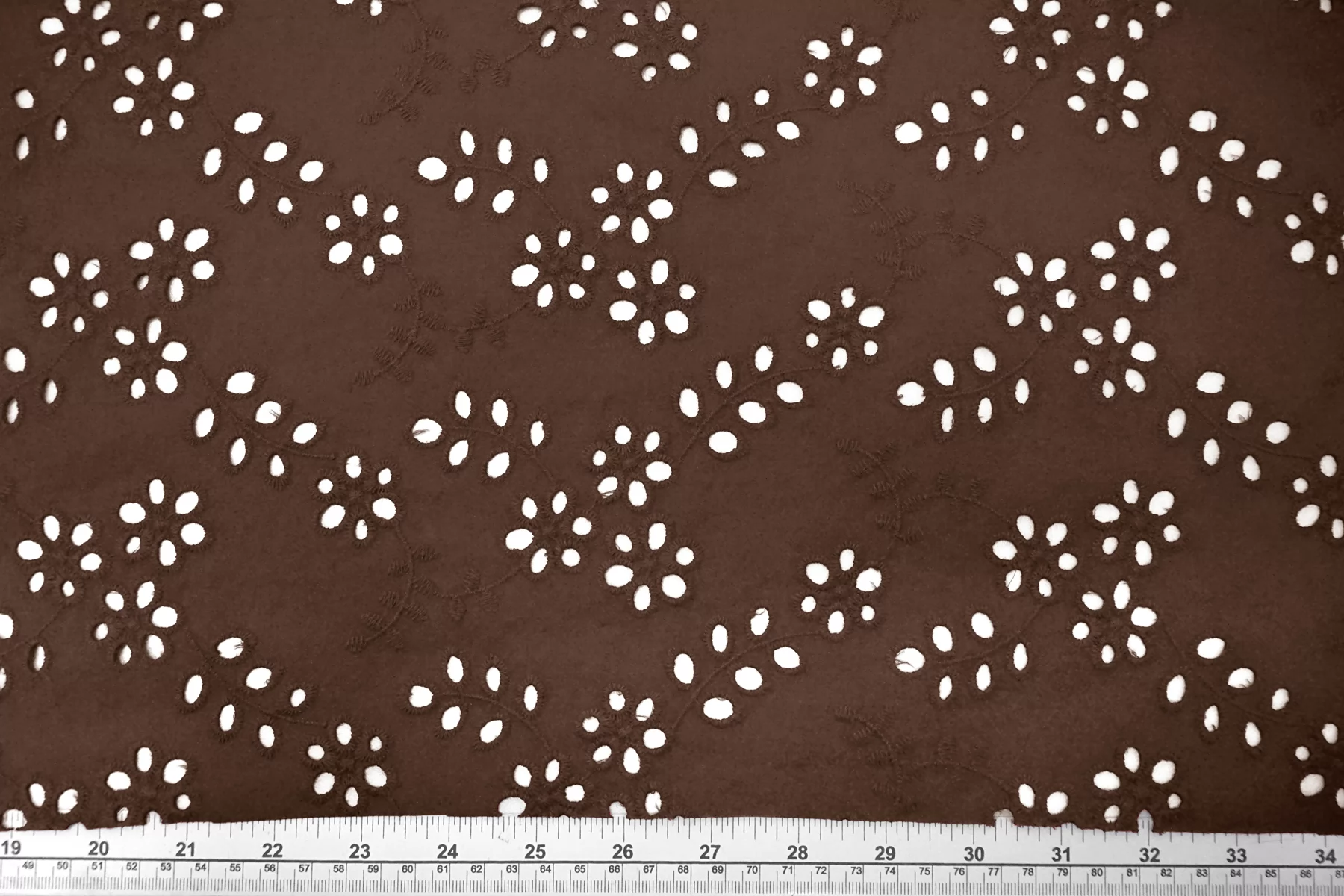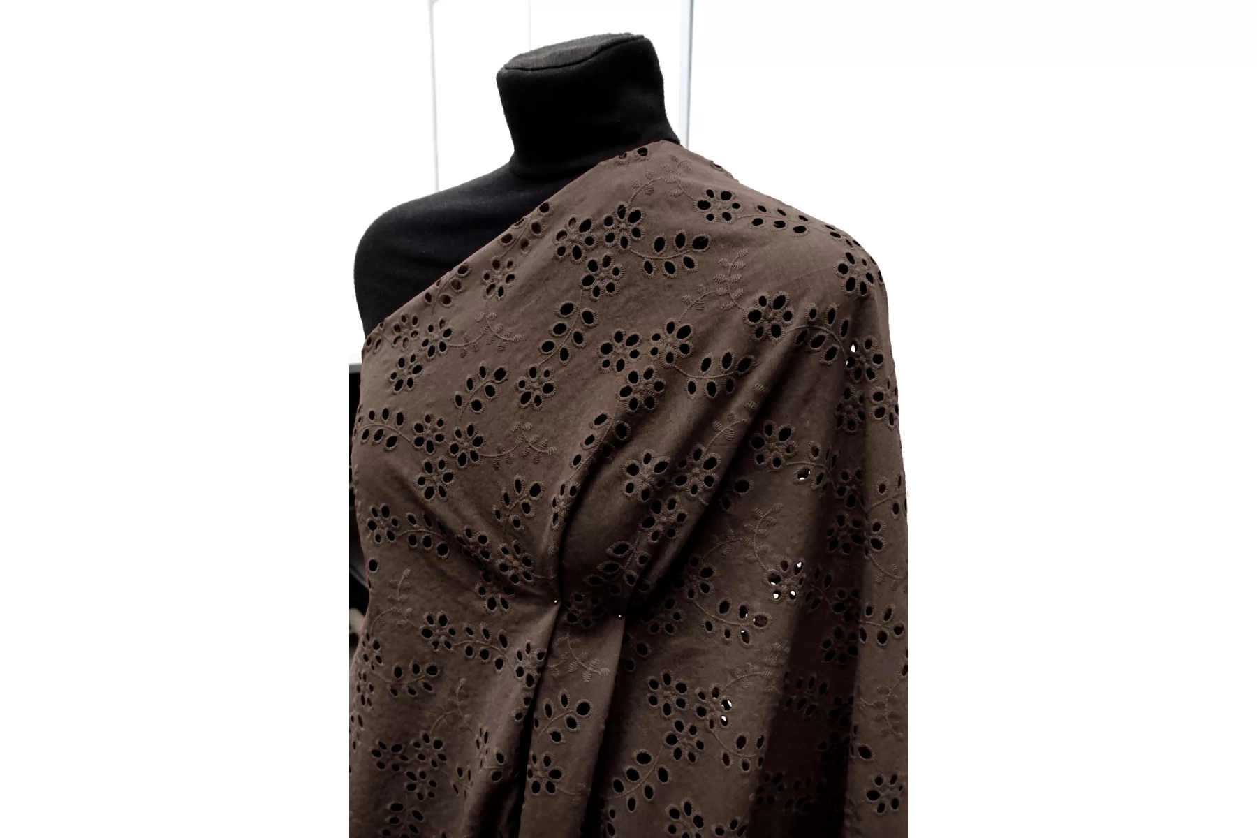Общая ширина 143 см, ширина участка с вышивкой - 133 см. Хлопковое шитье коричневого цвета с цветочными узорами. В основе ткани хлопковый батист. Без фестонного края. Материал мнется. Не тянется. Прекрасный вариант на платья, сарафаны, блузки и юбки. Для однослойных изделий при необходимости используйте подкладочный материал.
