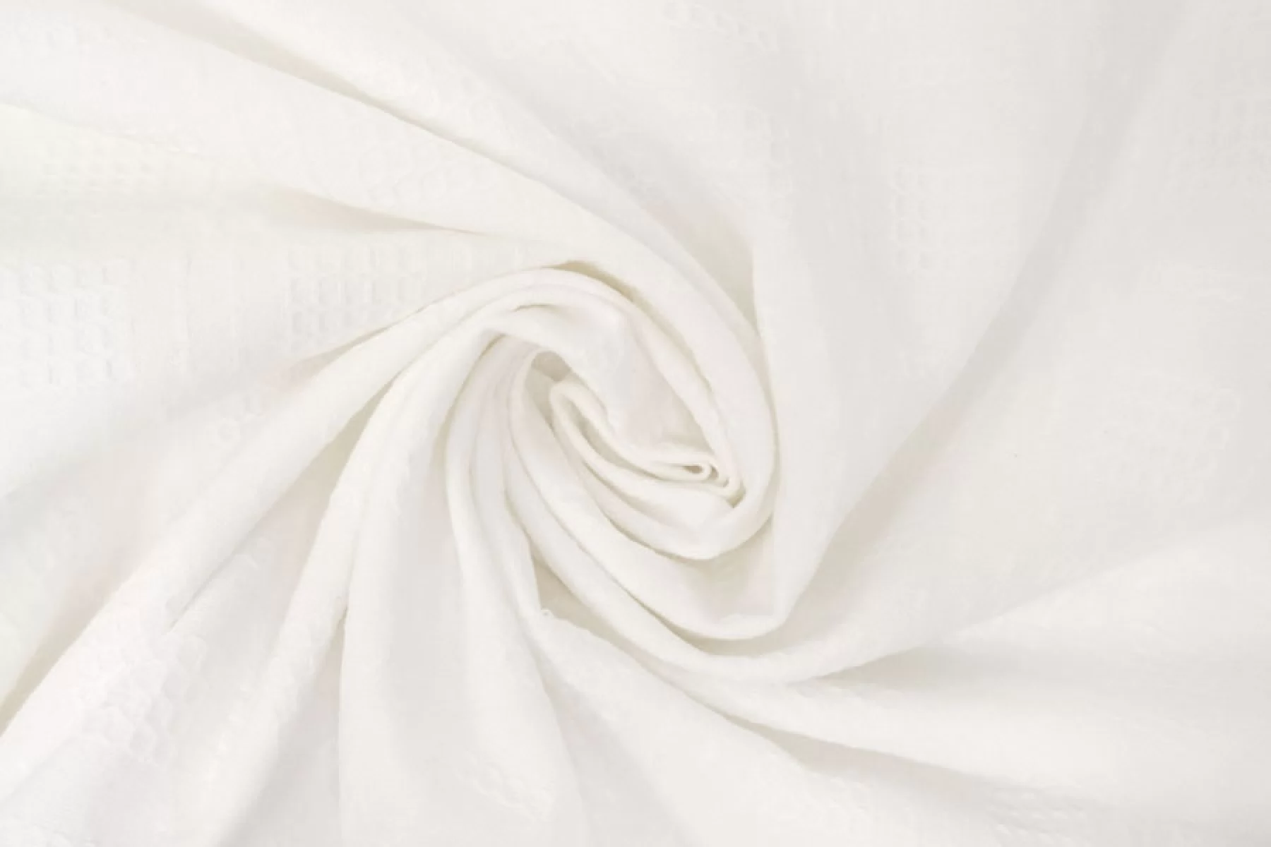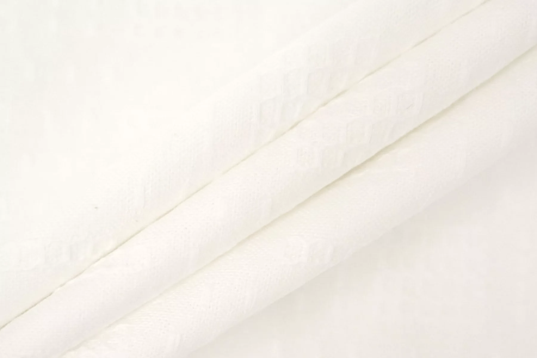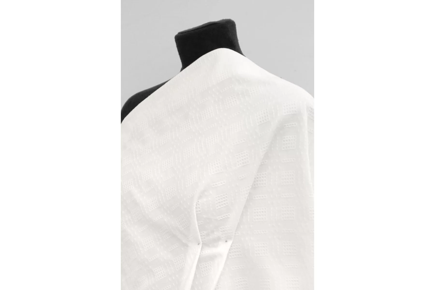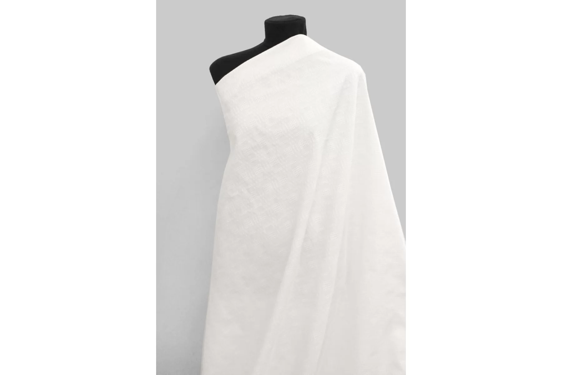 Хлопковое шитье в костюмной плотности, белого цвета. Фактурная поверхность, немного суховатый материал тактильно. Немного просвечивает в один слой, не тянется. Мнется средне, форму держит. Шьем жакеты, платья, юбки.