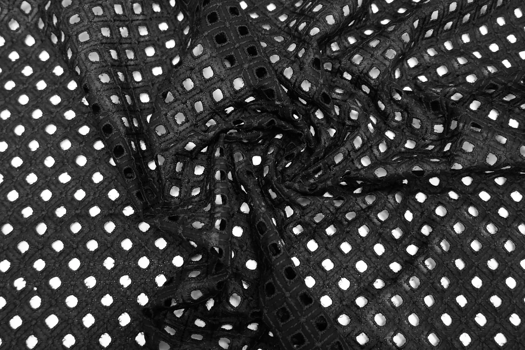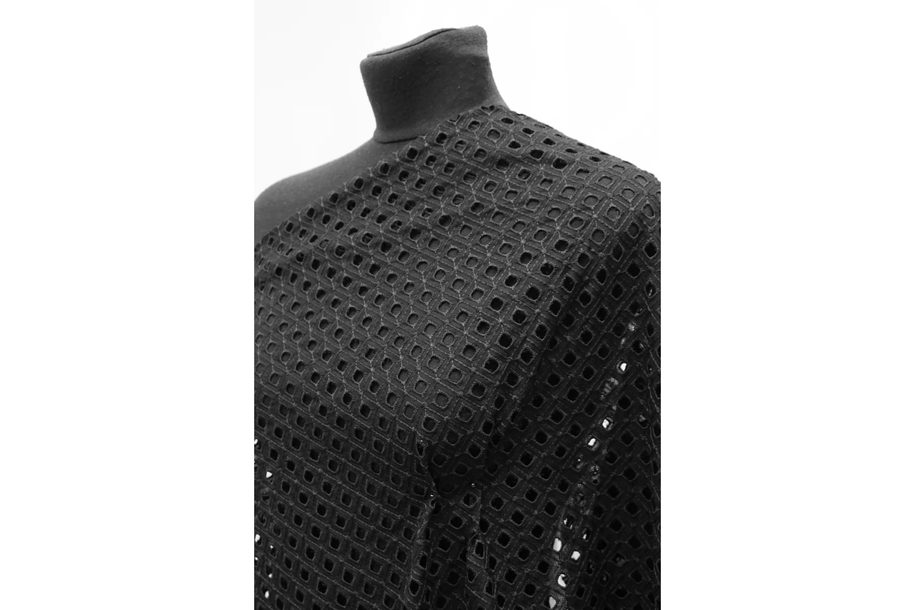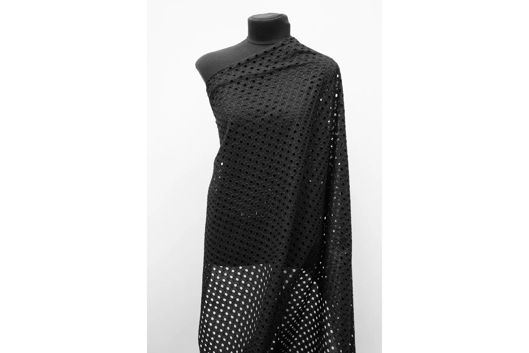 Красивое хлопковое шитье чёрного цвета от бренда Max Mara с геометрическим орнаментом. В основе ткани хлопок, вышивка синтетической нитью. Материал пластичный, но при этом держит форму. Просвечивает. Слегка мнется. Не тянется. Прекрасный вариант на платья, сарафаны, блузки и юбки. Для однослойных изделий при необходимости используйте подкладочный материал.