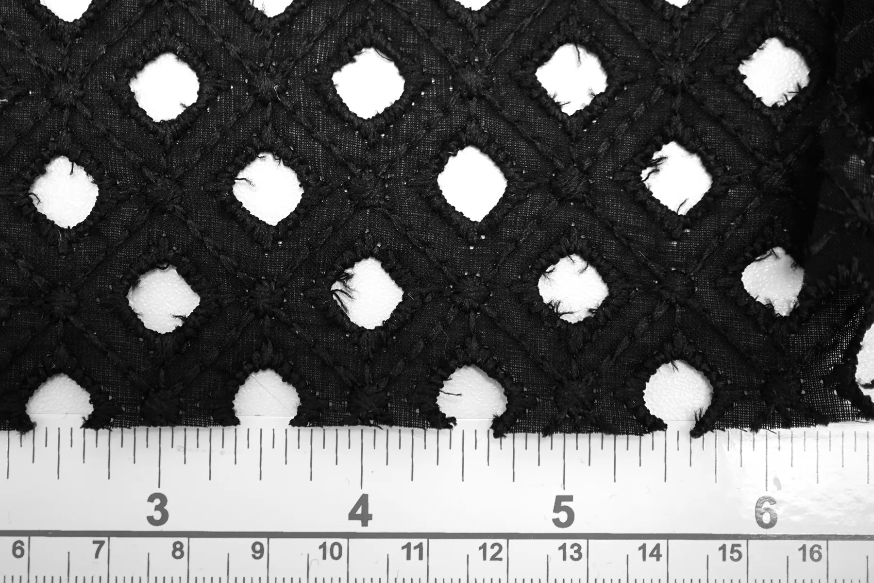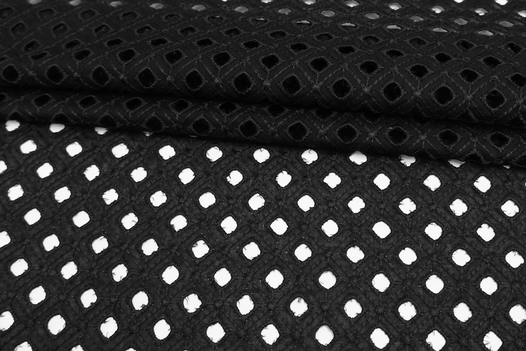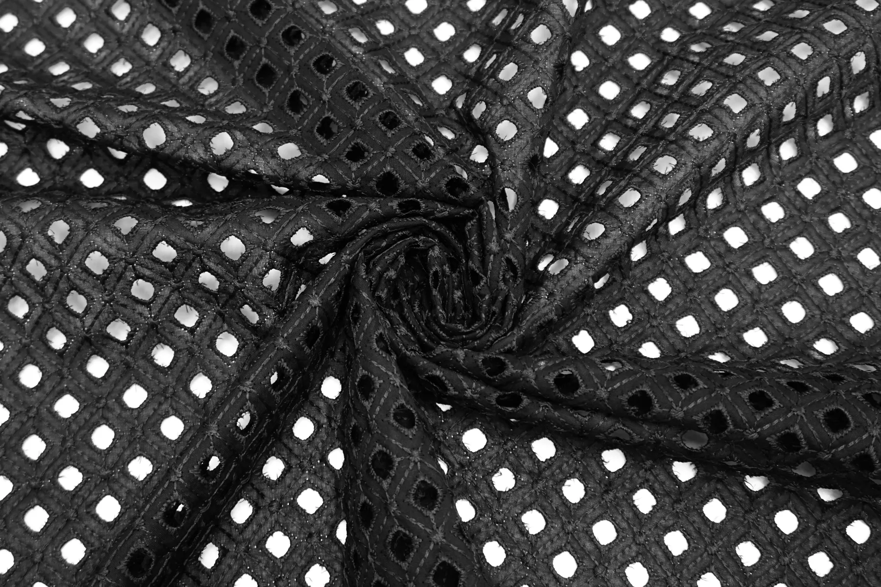 Красивое хлопковое шитье чёрного цвета от бренда Max Mara с геометрическим орнаментом. В основе ткани хлопок, вышивка синтетической нитью. Материал пластичный, но при этом держит форму. Просвечивает. Слегка мнется. Не тянется. Прекрасный вариант на платья, сарафаны, блузки и юбки. Для однослойных изделий при необходимости используйте подкладочный материал.