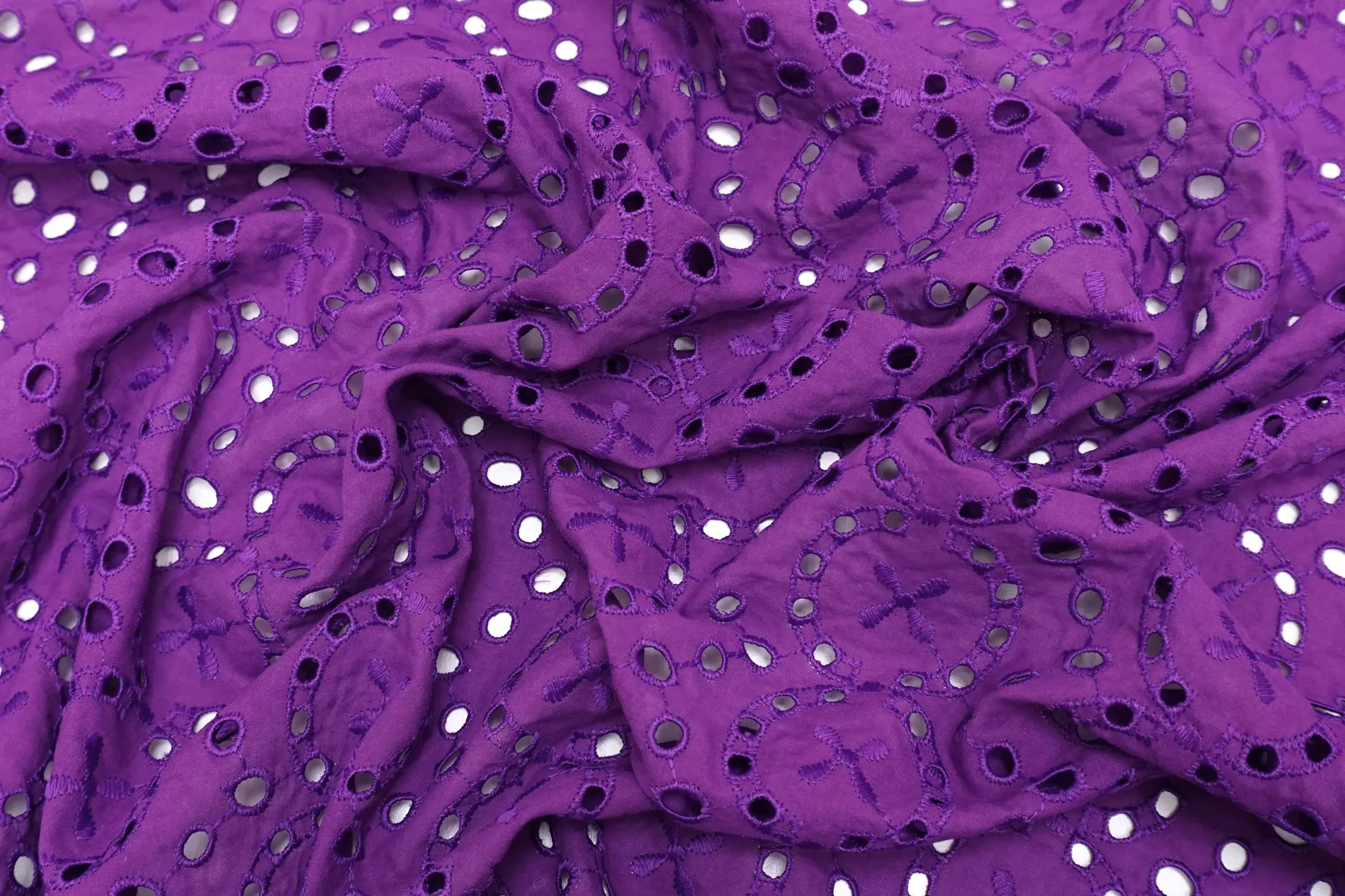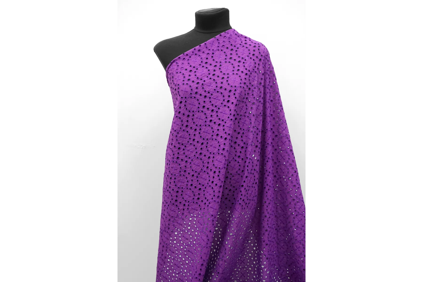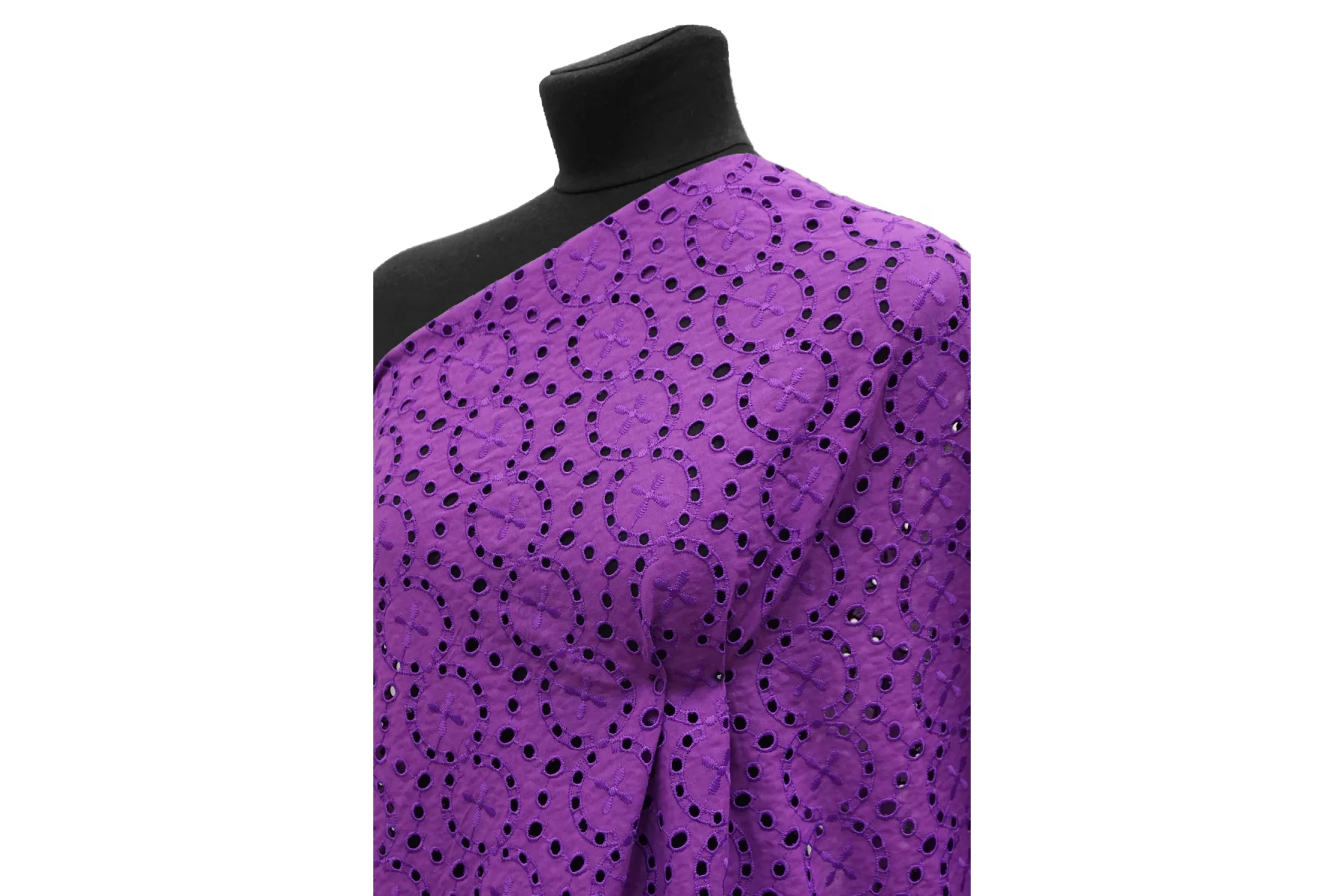 Красивое хлопковое шитье насыщенного фиолетового цвета (со сливовым подтоном) от бренда Max Mara с геометрическим орнаментом. В основе ткани хлопок, вышивка синтетической нитью. Материал пластичный, но при этом держит форму. Просвечивает. Слегка мнется. Не тянется. Прекрасный вариант на платья, сарафаны, блузки и юбки. Для однослойных изделий при необходимости используйте подкладочный материал.