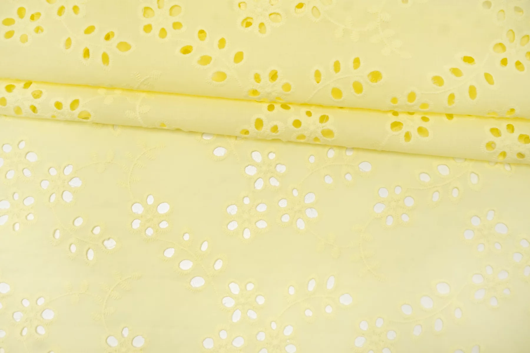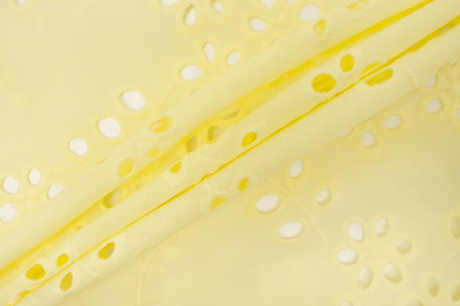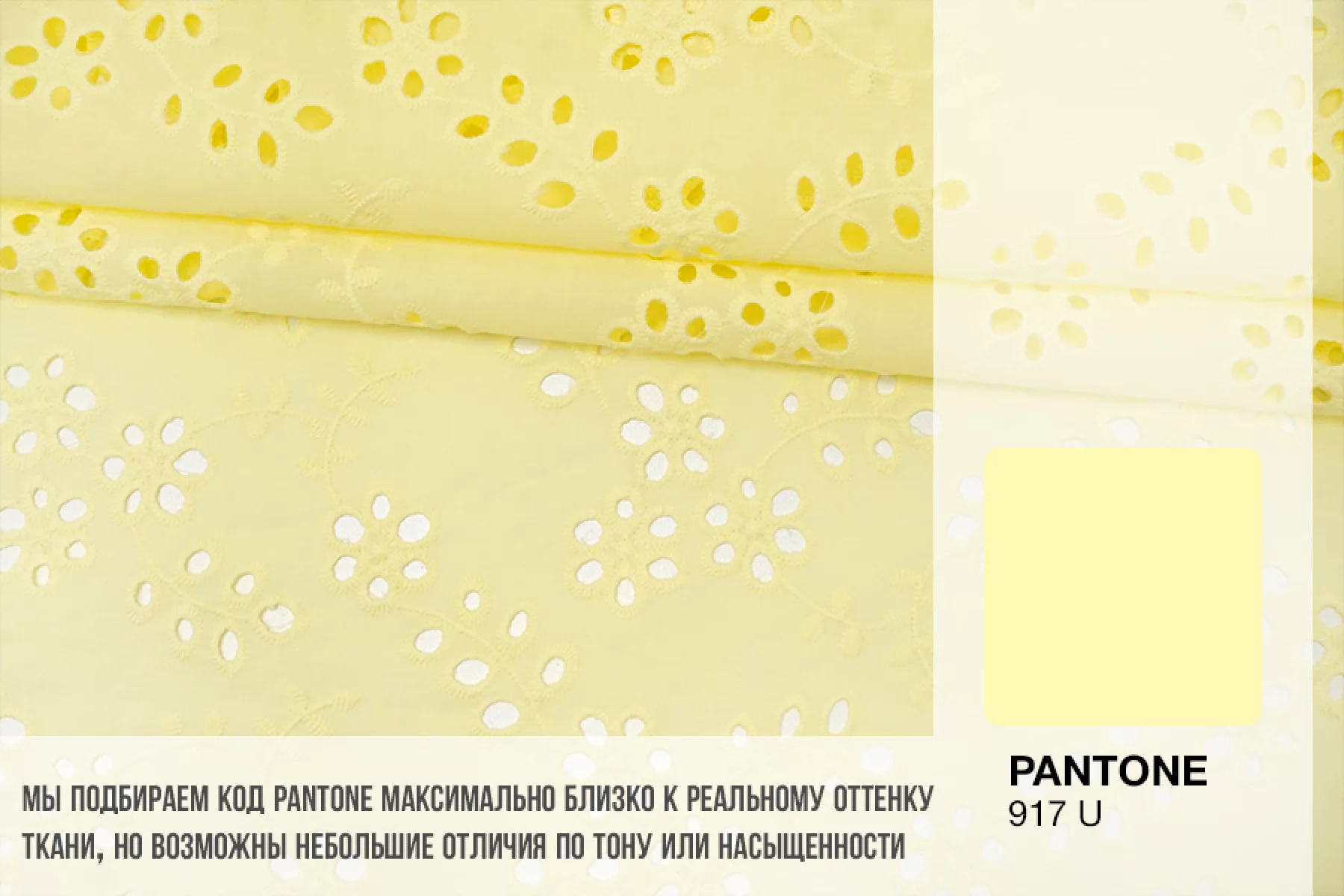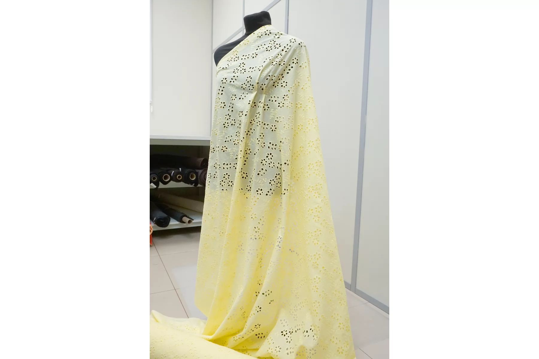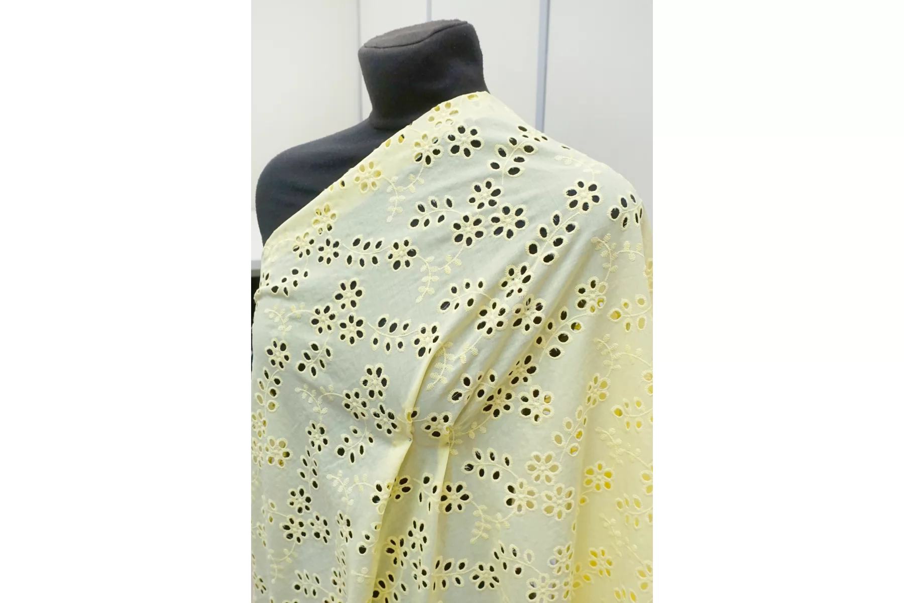 Общая ширина 143 см, ширина участка с вышивкой - 133 см. Хлопковое шитье в красивом, чуть высветленном жёлтом оттенке, с цветочными узорами. В основе ткани хлопковый батист. Без фестонного края. Материал мнется. Не тянется. Прекрасный вариант на платья, сарафаны, блузки и юбки. Для однослойных изделий при необходимости используйте подкладочный материал.