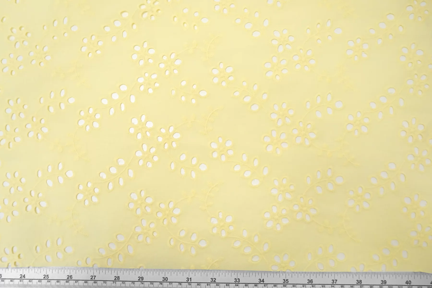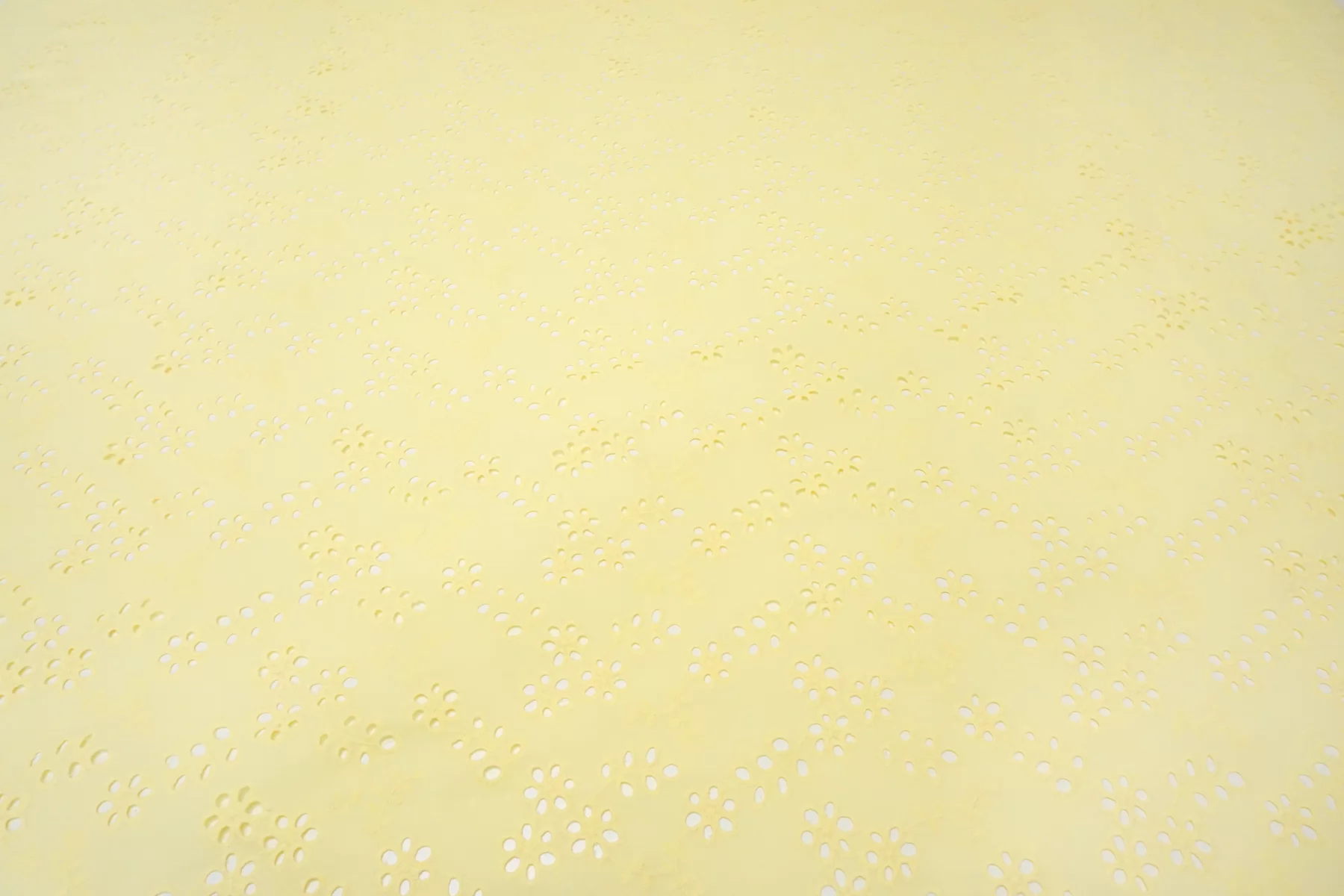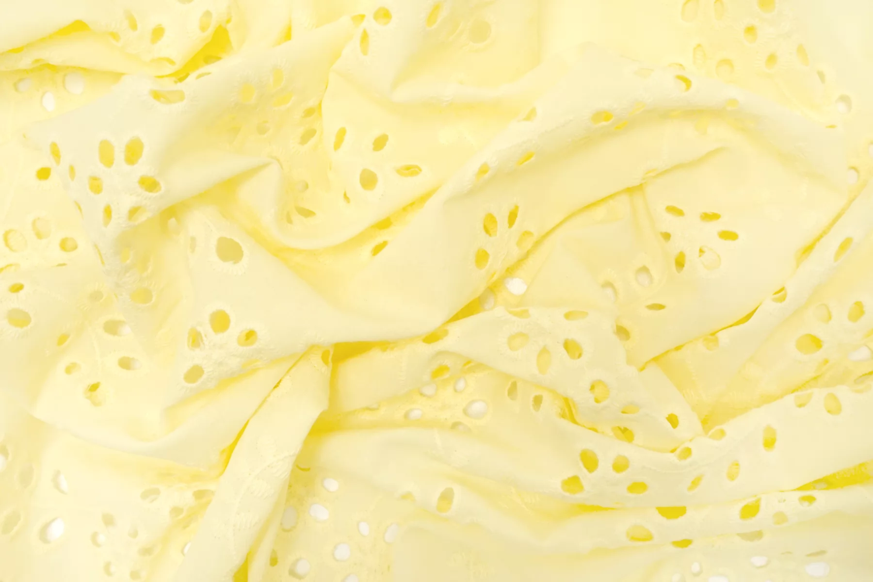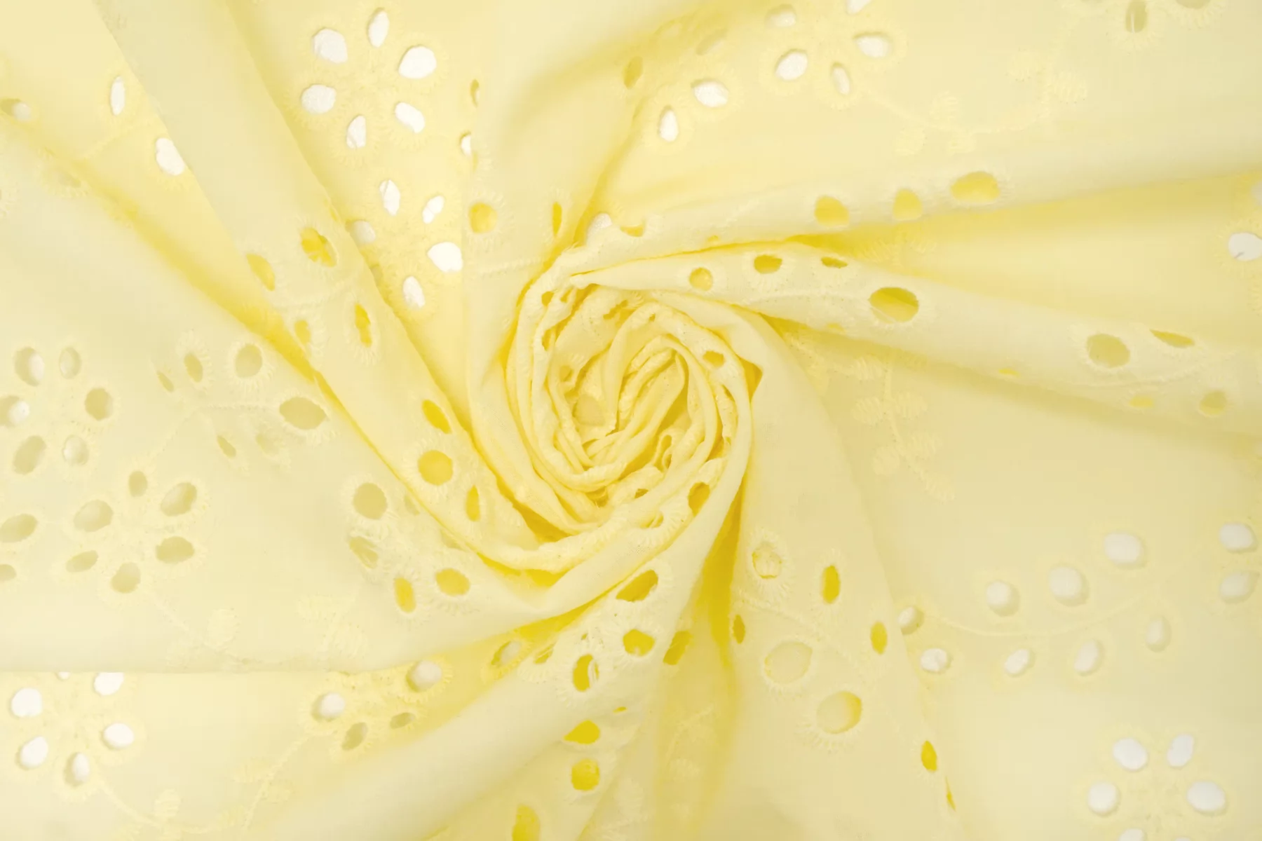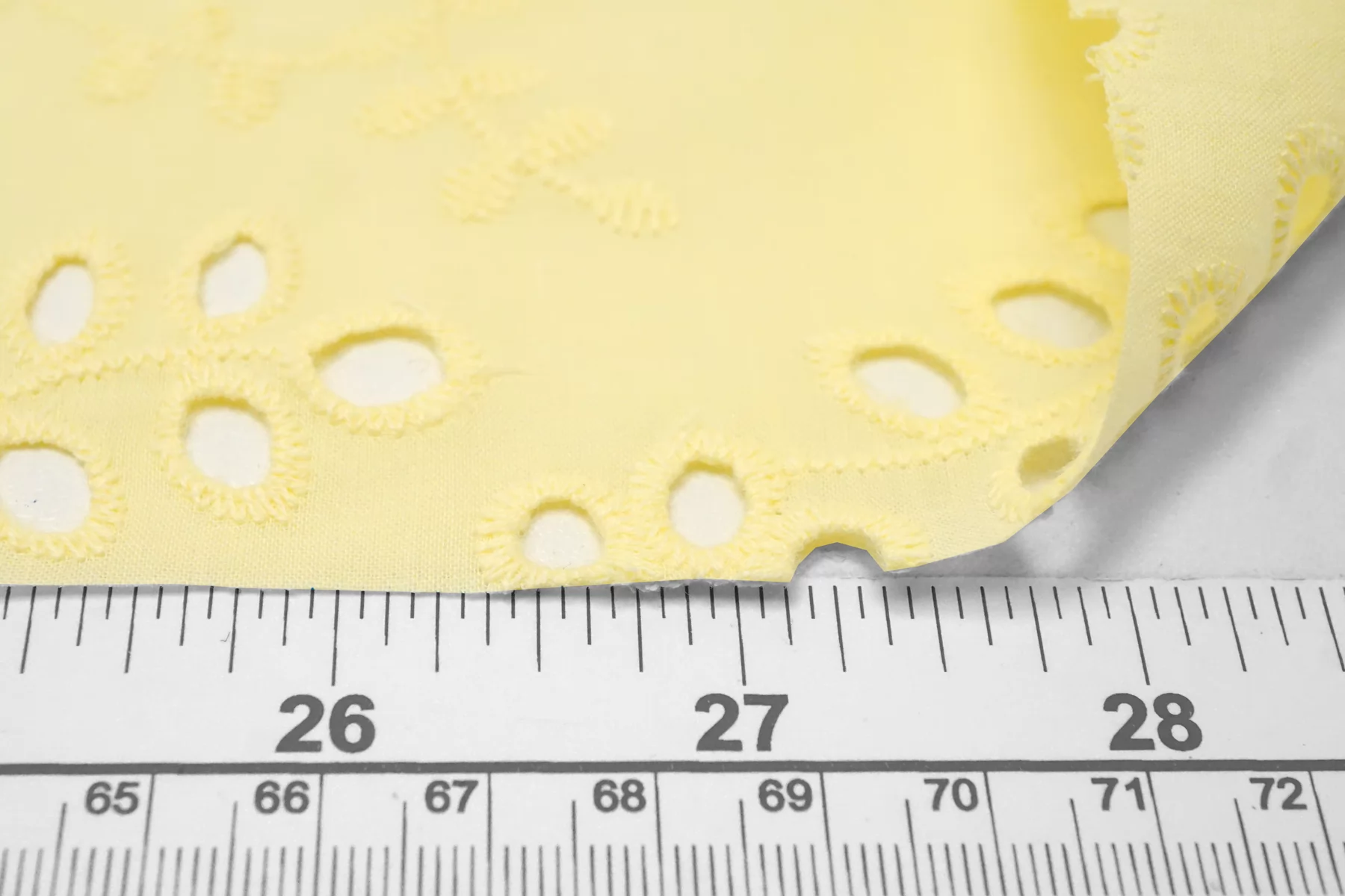 Общая ширина 143 см, ширина участка с вышивкой - 133 см. Хлопковое шитье в красивом, чуть высветленном жёлтом оттенке, с цветочными узорами. В основе ткани хлопковый батист. Без фестонного края. Материал мнется. Не тянется. Прекрасный вариант на платья, сарафаны, блузки и юбки. Для однослойных изделий при необходимости используйте подкладочный материал.