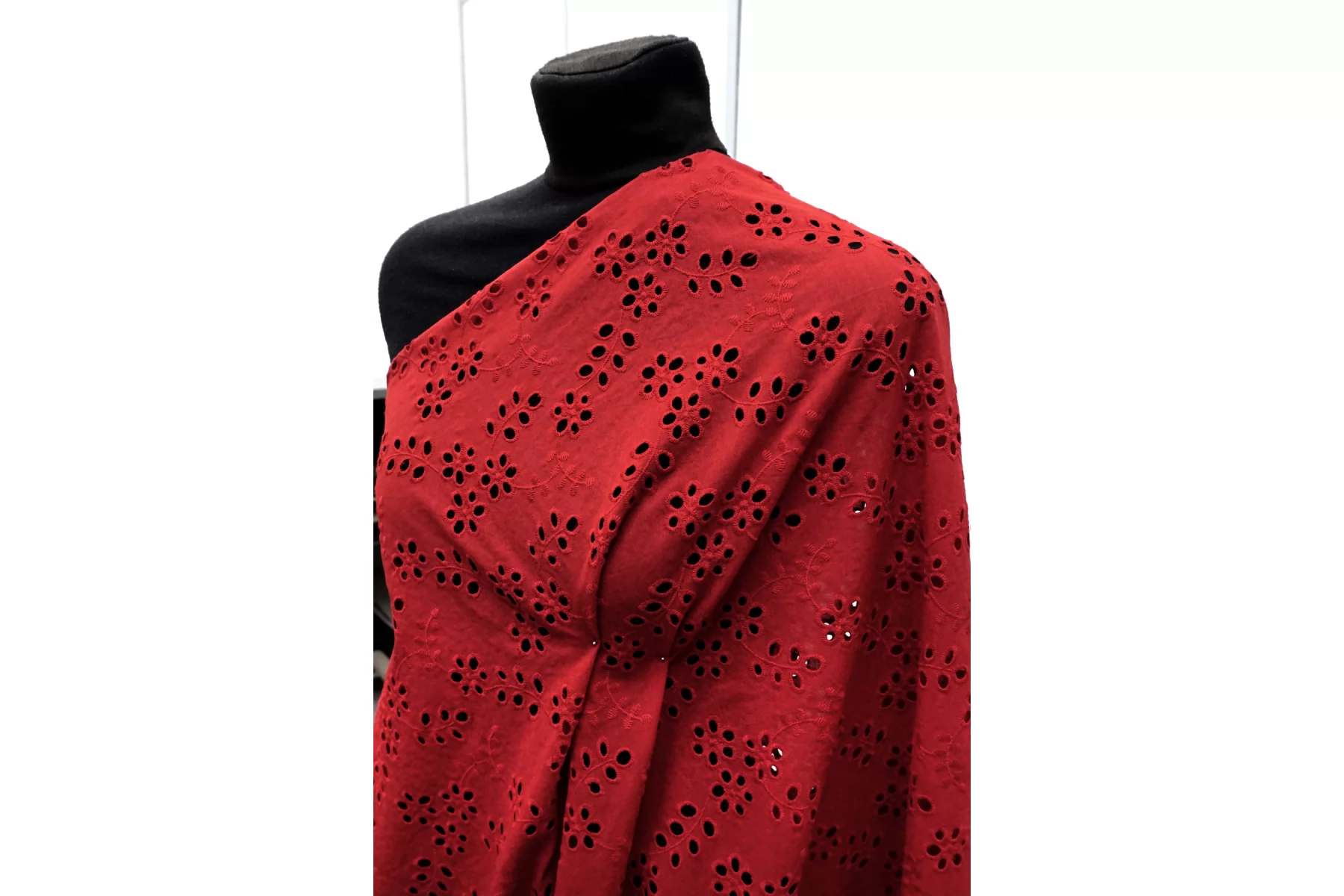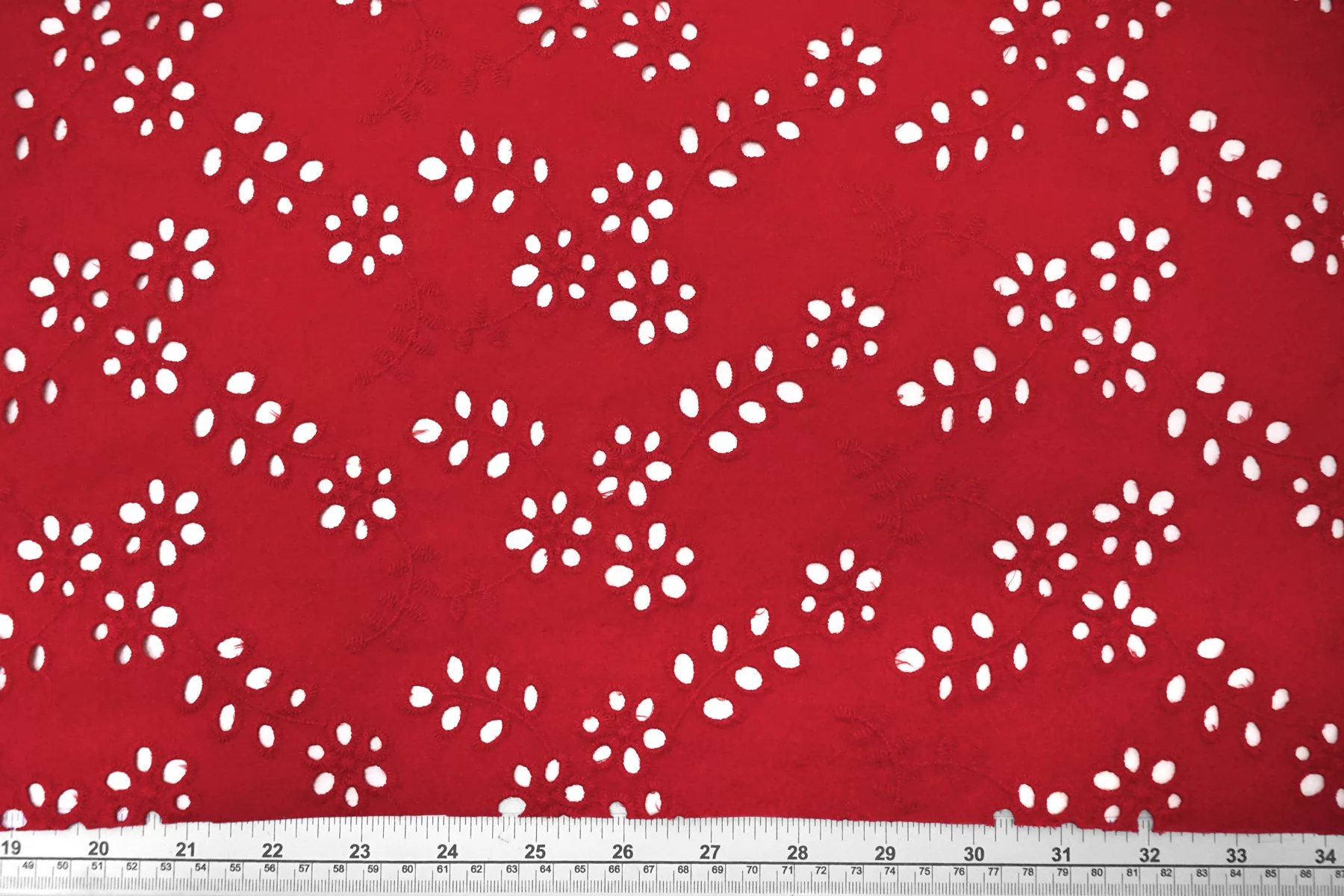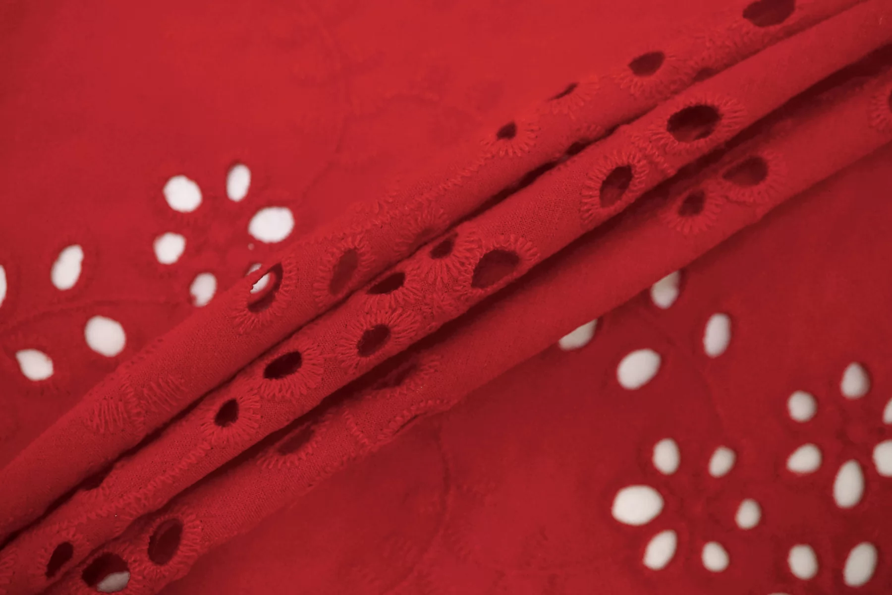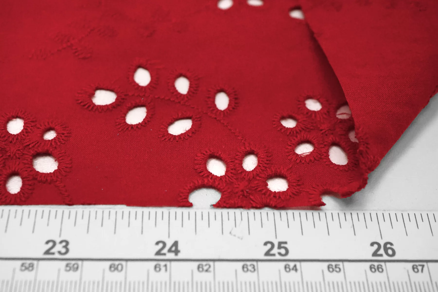 Общая ширина 143 см, ширина участка с вышивкой - 133 см. Хлопковое шитье красного цвета с цветочными узорами. В основе ткани хлопковый батист. Без фестонного края. Материал мнется. Не тянется. Прекрасный вариант на платья, сарафаны, блузки и юбки. Для однослойных изделий при необходимости используйте подкладочный материал.