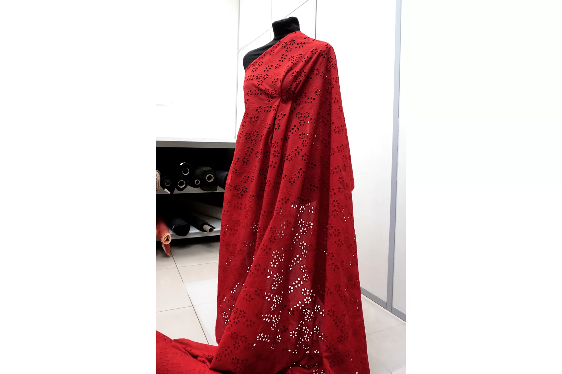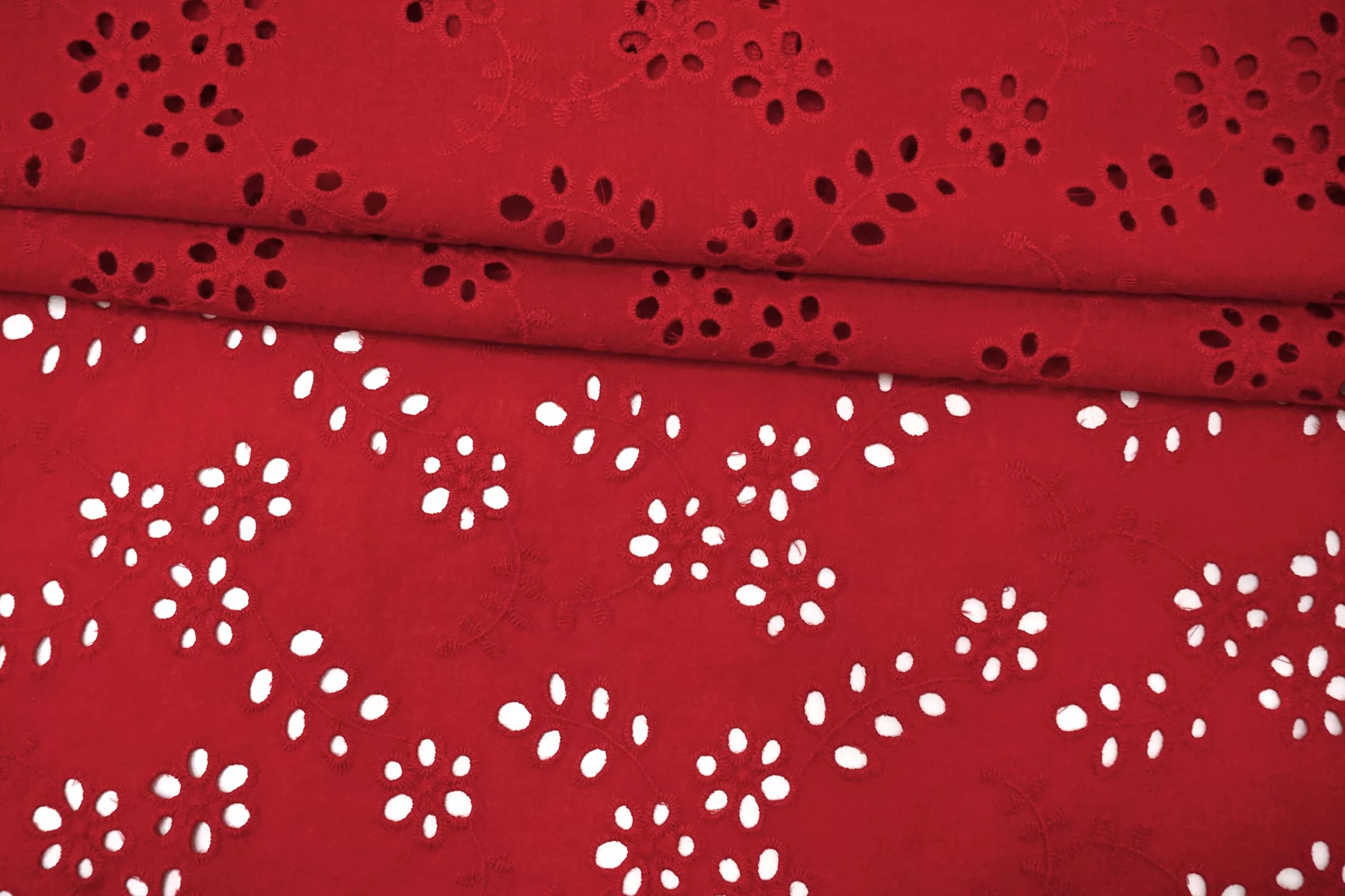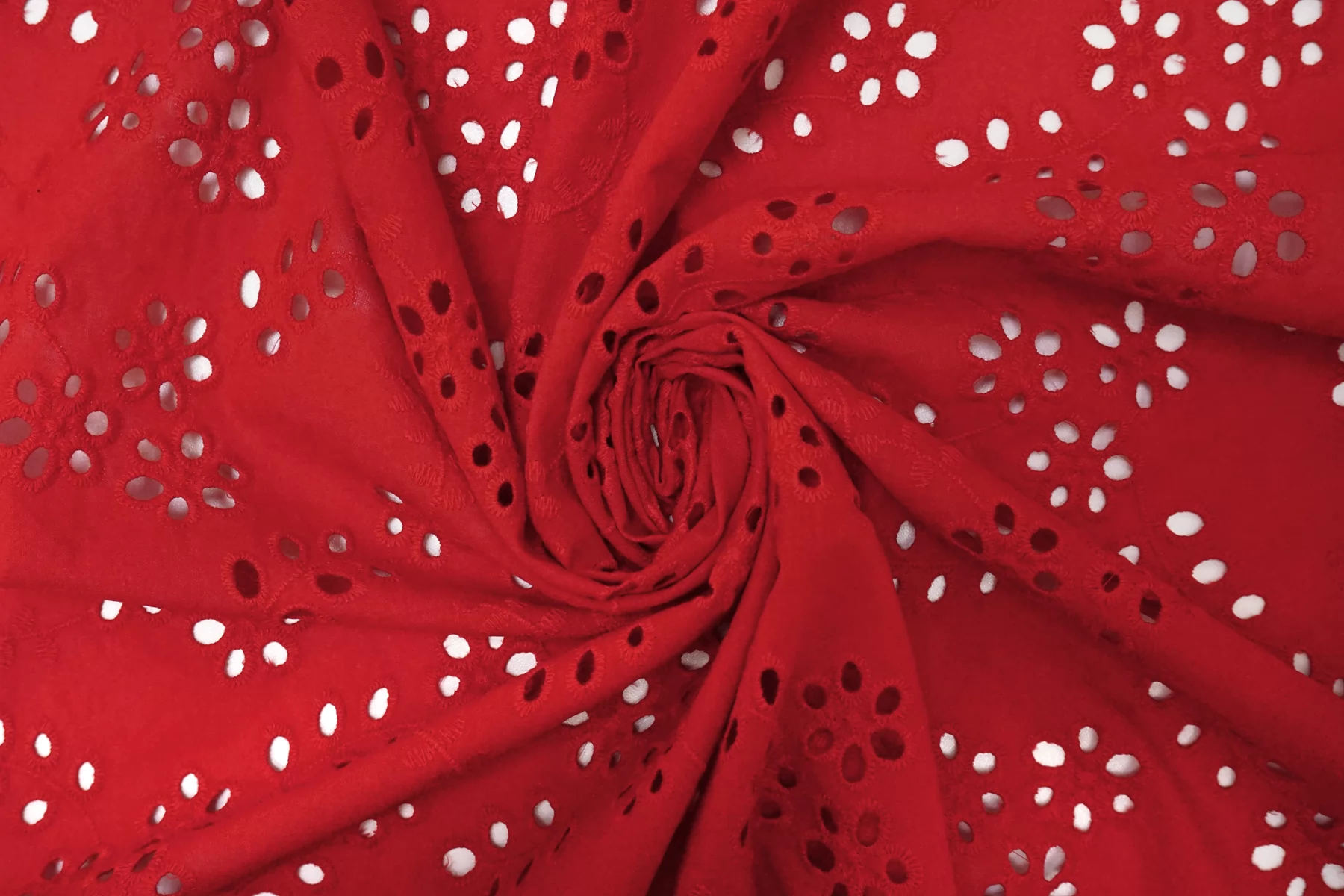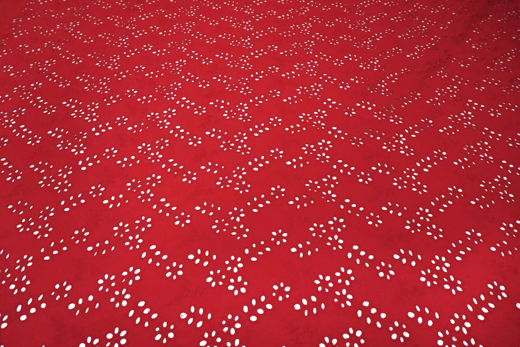 Общая ширина 143 см, ширина участка с вышивкой - 133 см. Хлопковое шитье красного цвета с цветочными узорами. В основе ткани хлопковый батист. Без фестонного края. Материал мнется. Не тянется. Прекрасный вариант на платья, сарафаны, блузки и юбки. Для однослойных изделий при необходимости используйте подкладочный материал.