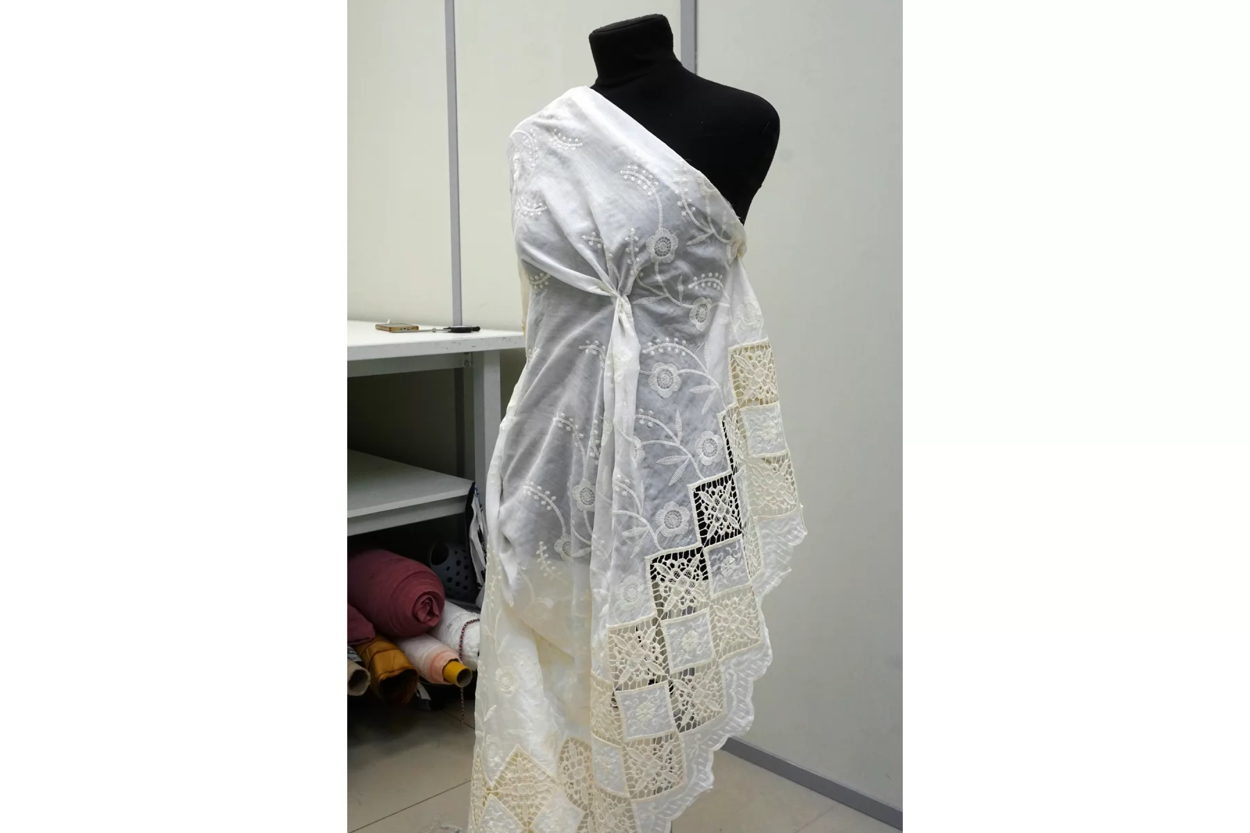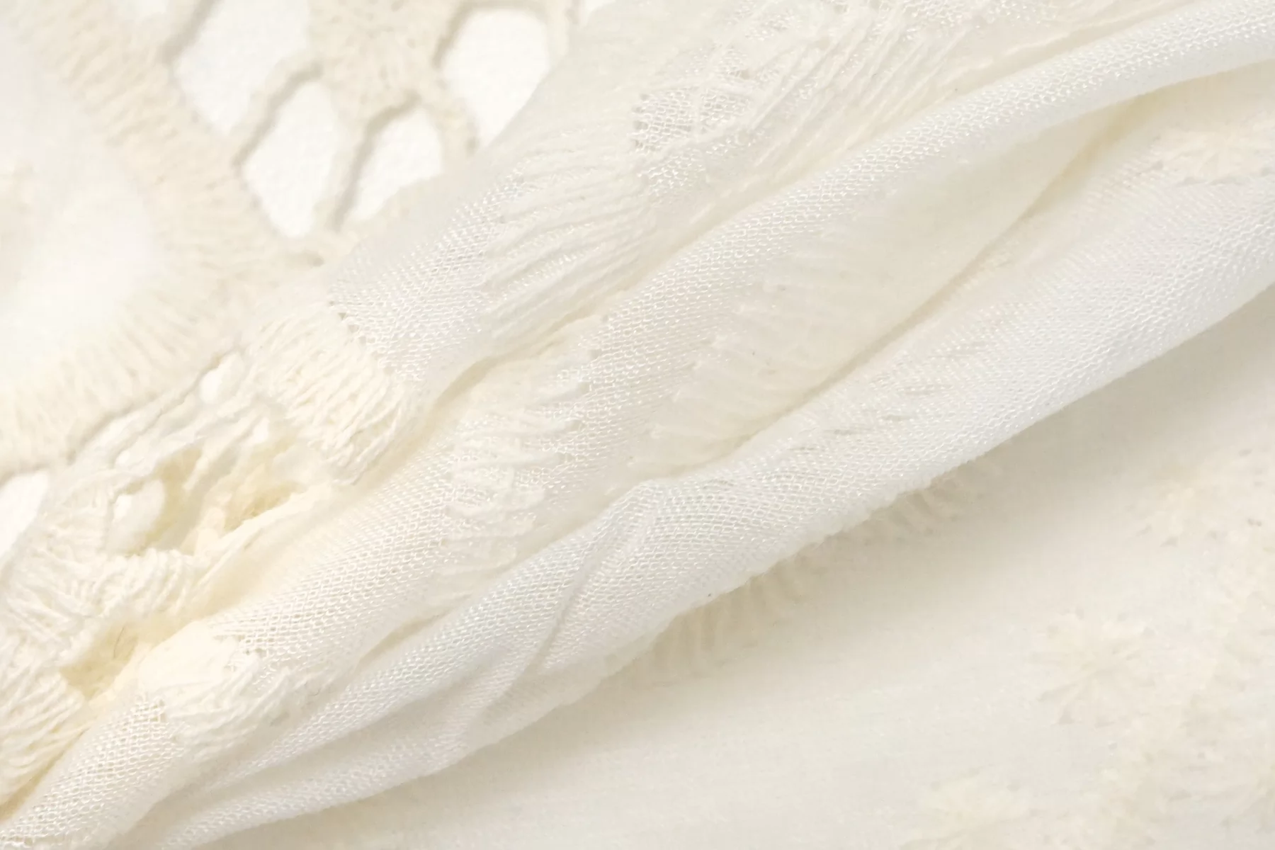 Великолепное шитье с фестонными краями на тонком батисте из хлопка с шелком. Цвет - молочный. Края фестонные. Нежный, мягкий и воздушный. Вышивка предает немного тяжести ткани.. Не тянется. Просвечивает. Сминается слабо. Отличный вариант на летние и нарядные или свадебные изделия.