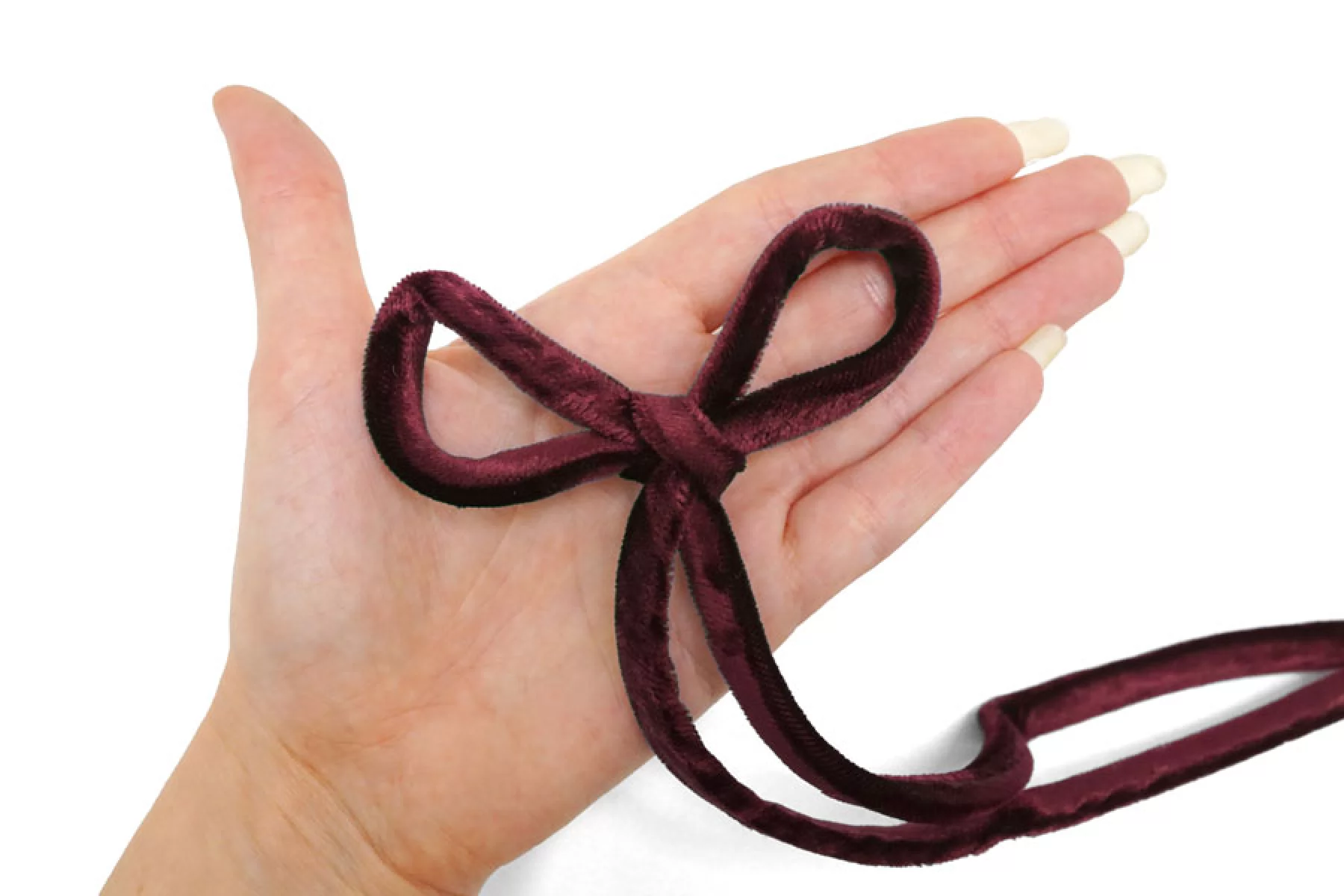 Бархатный шнур в оттенке марсала. Ворс вискозный, внутри шнурок - хлопковый. Ширина 9 мм. Приятный наощупь, блестит.