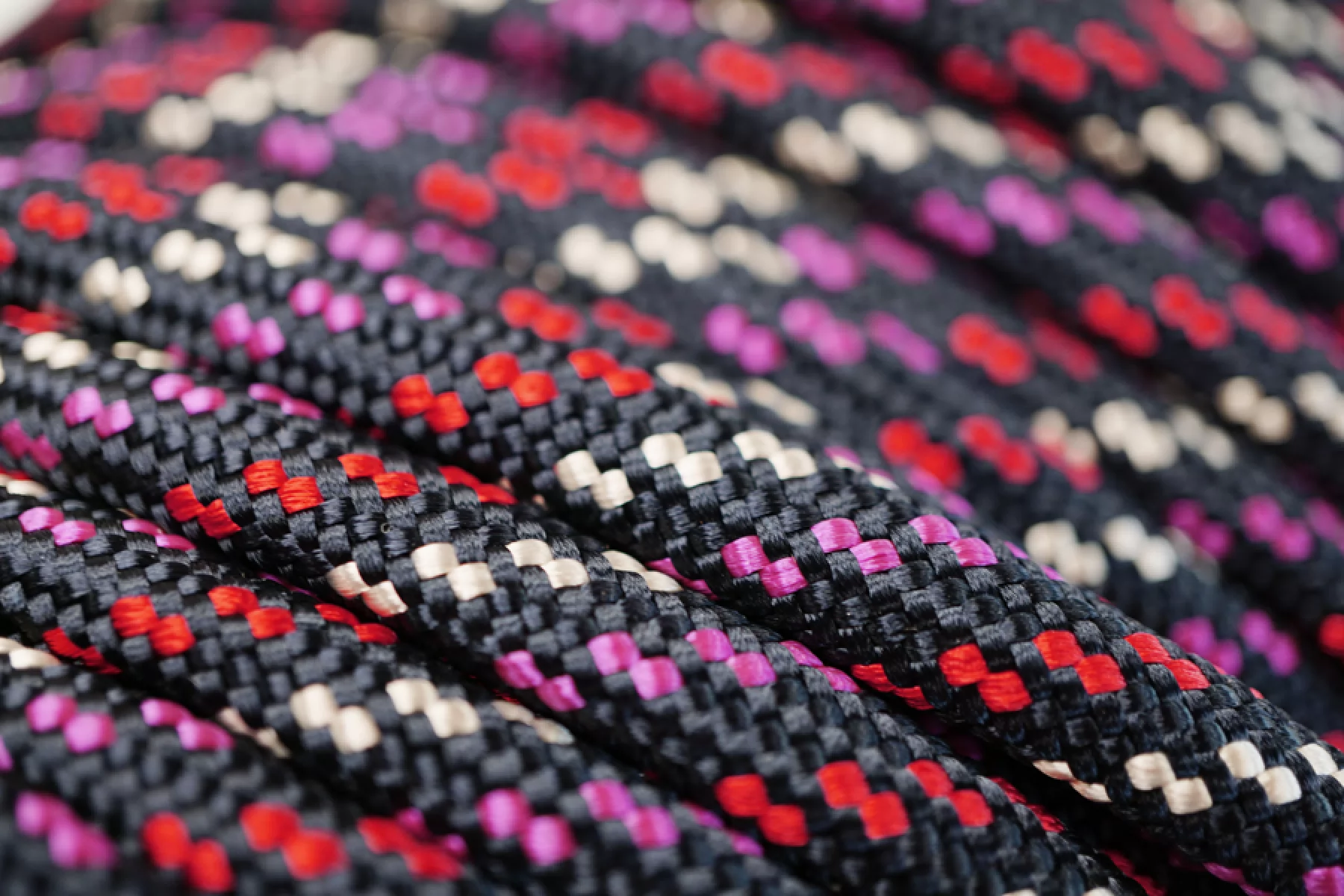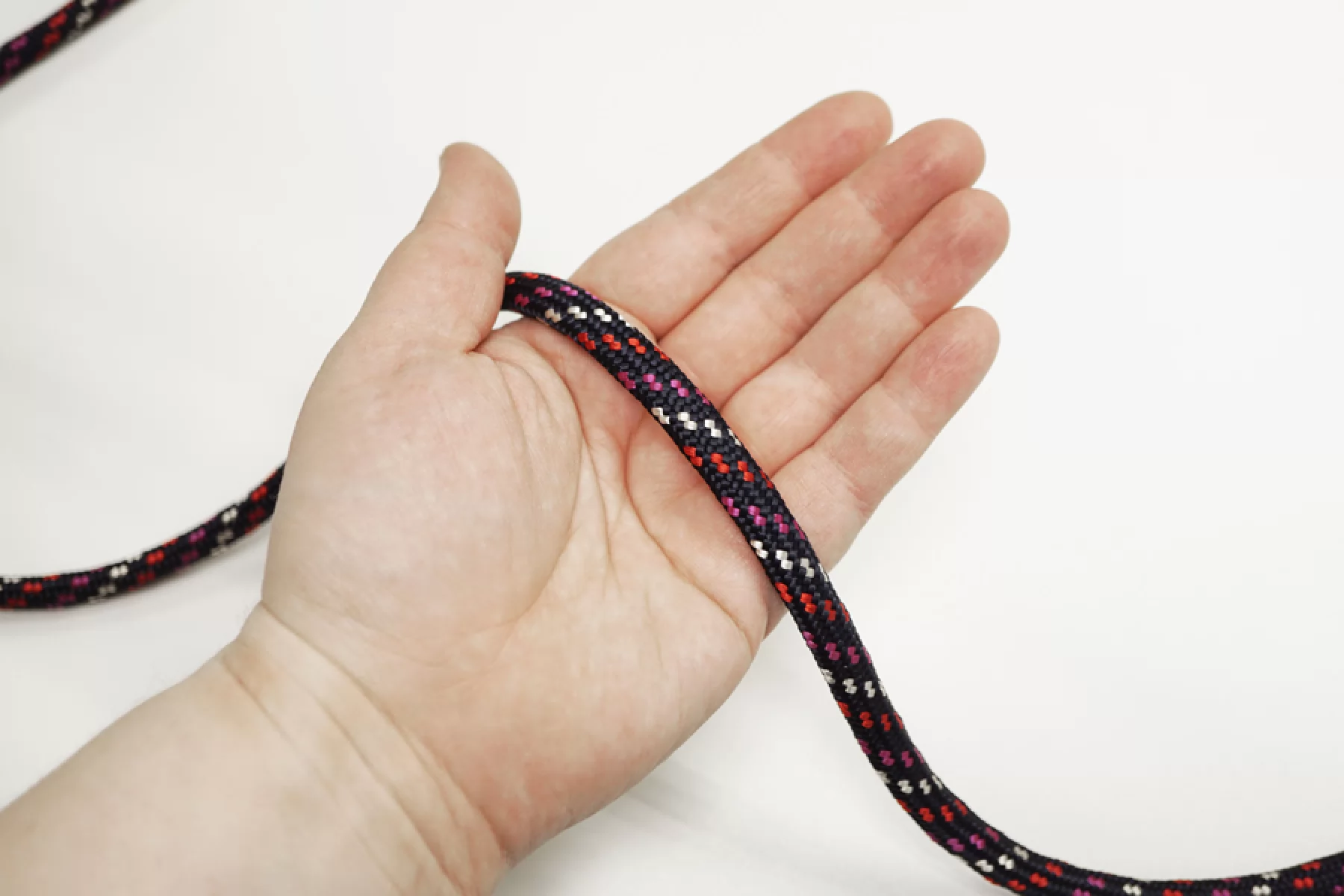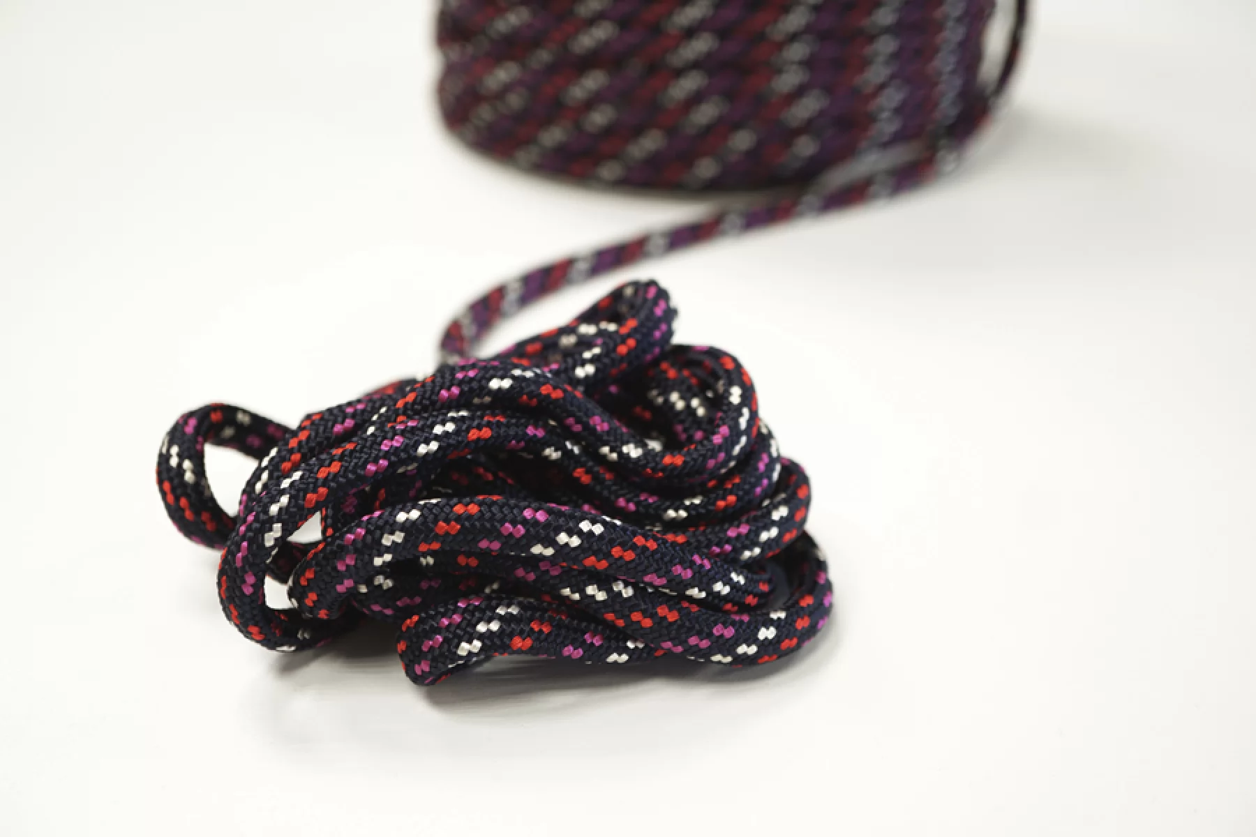 Хлопковый шнур черного цвета с белыми, красными и сиреневыми крапинками. Форма круглая. Ширина около 1 см.