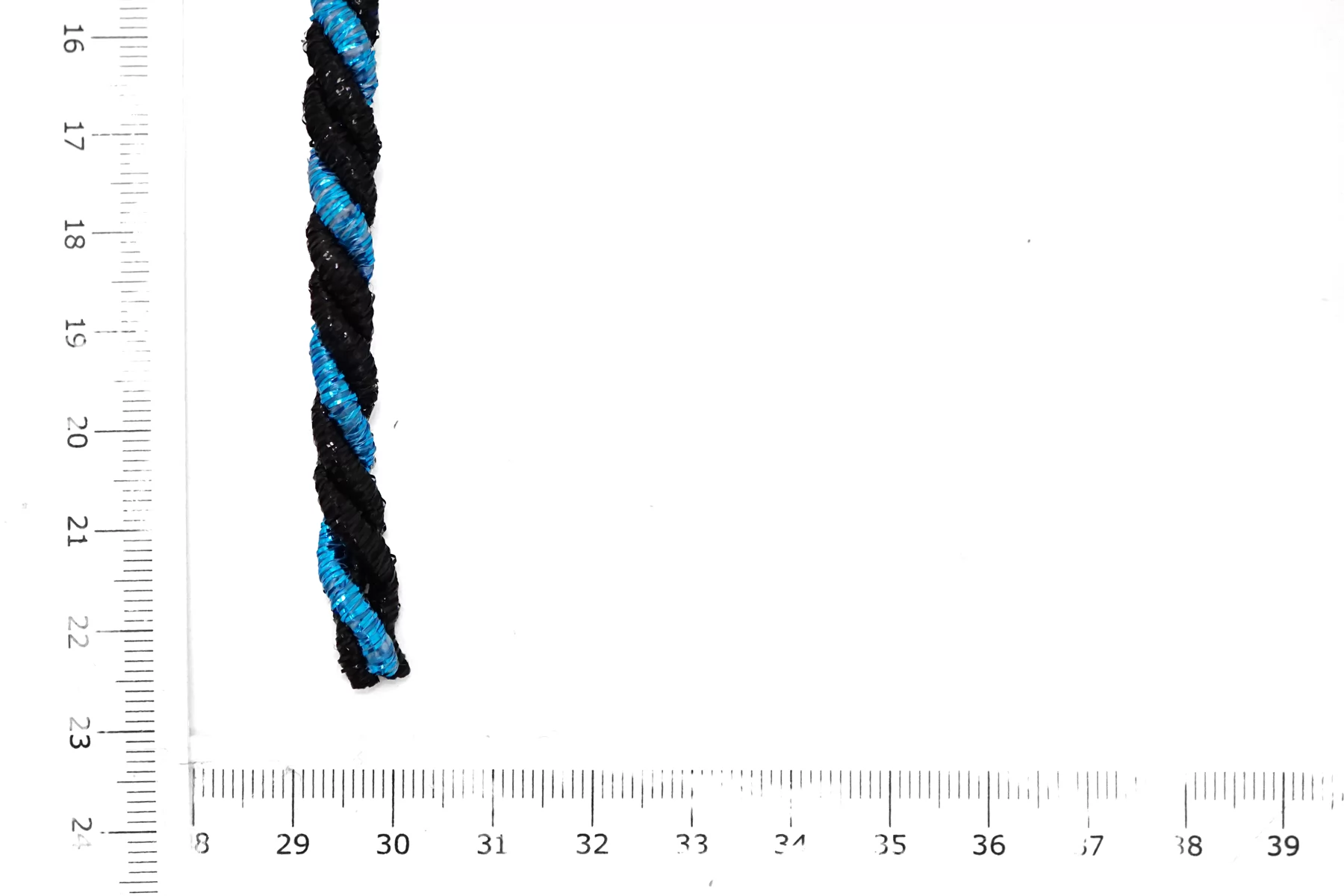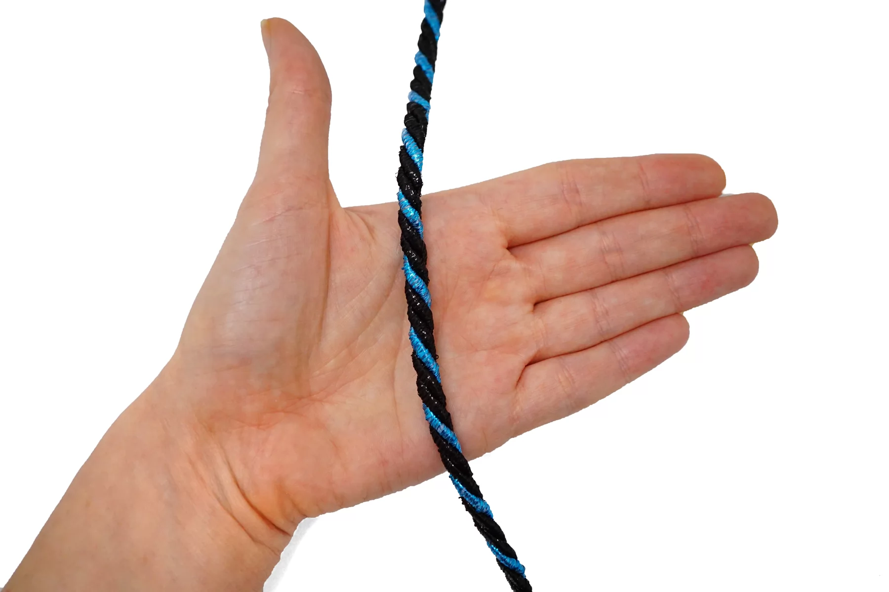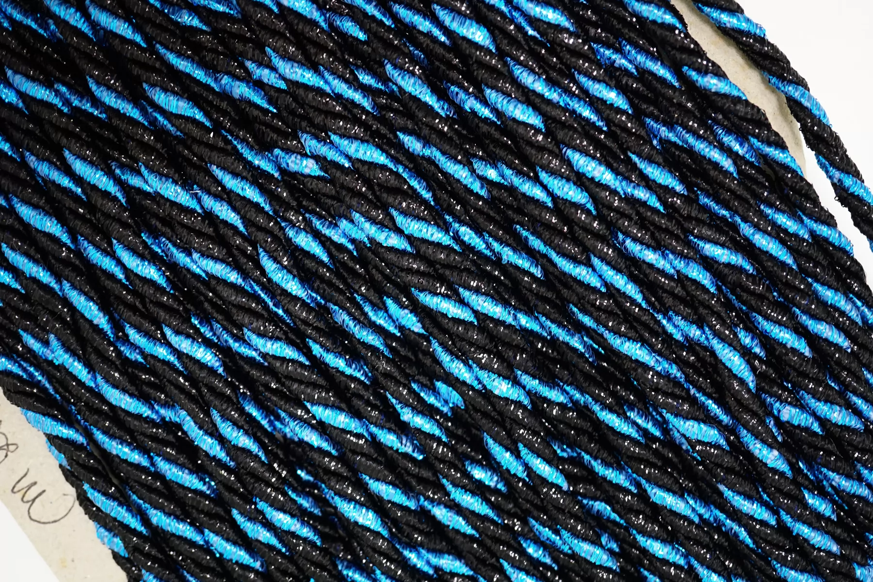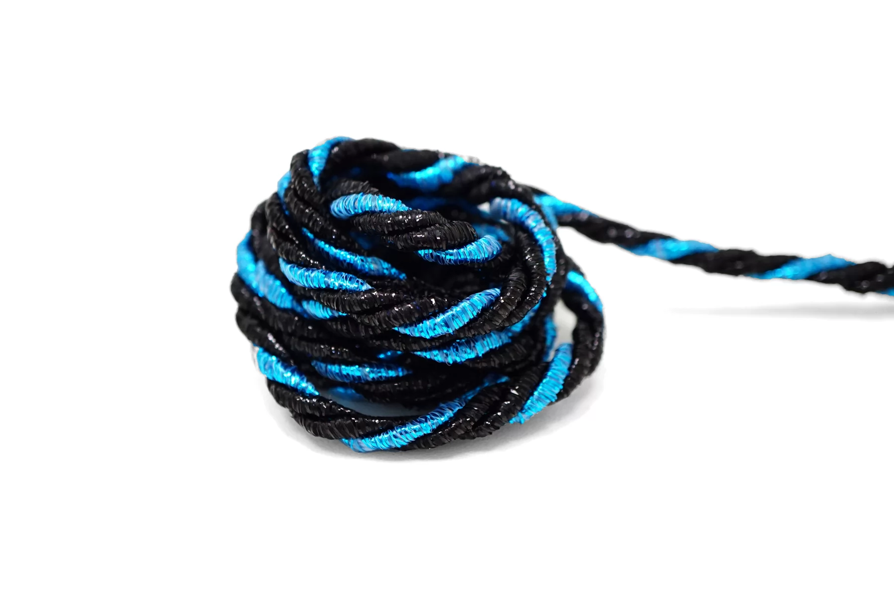 Гайтановый шнур, сочетание сине-голубого и чёрного цвета (с люрексом в цвет). Форма круглая. Ширина около 6 мм.