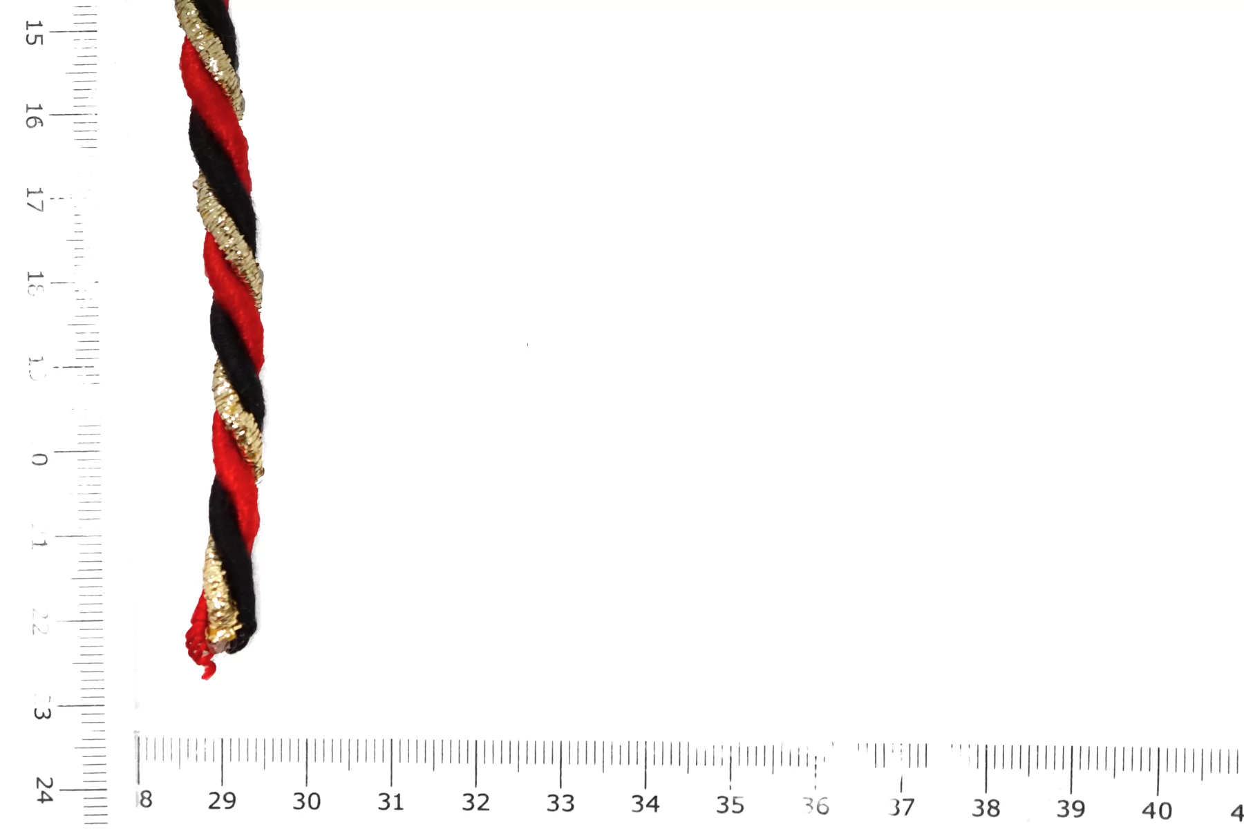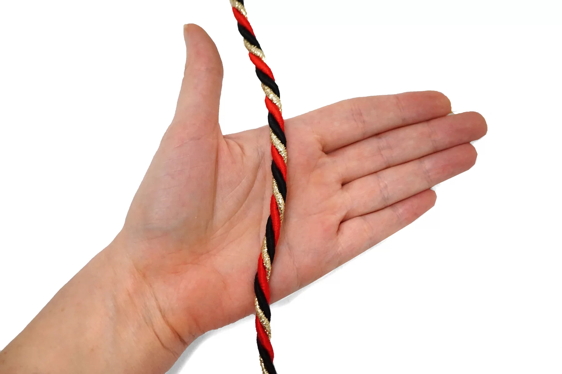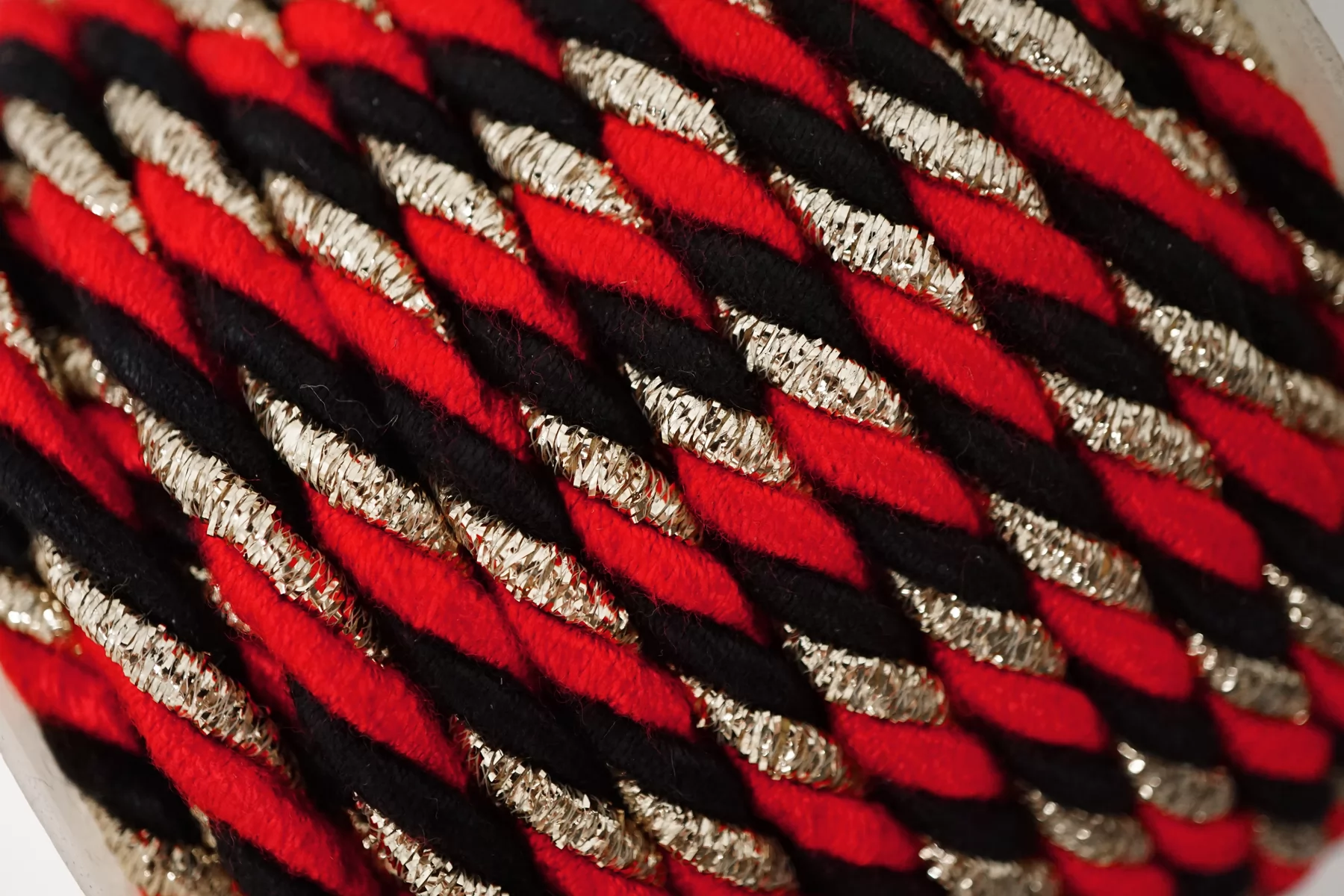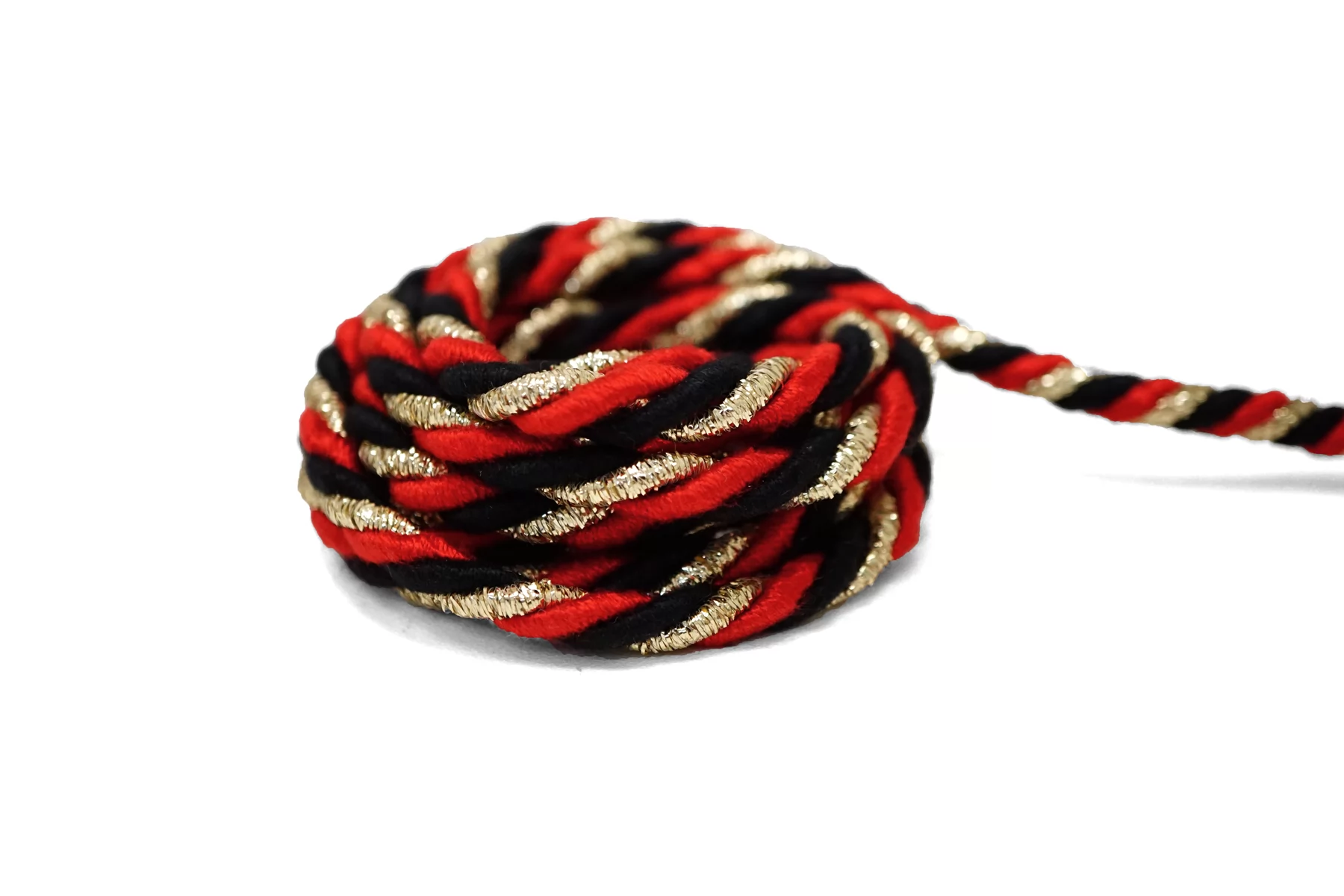 Гайтановый шнур, сочетание чёрного, красного и золотого цвета. Форма круглая. Ширина около 7 мм.