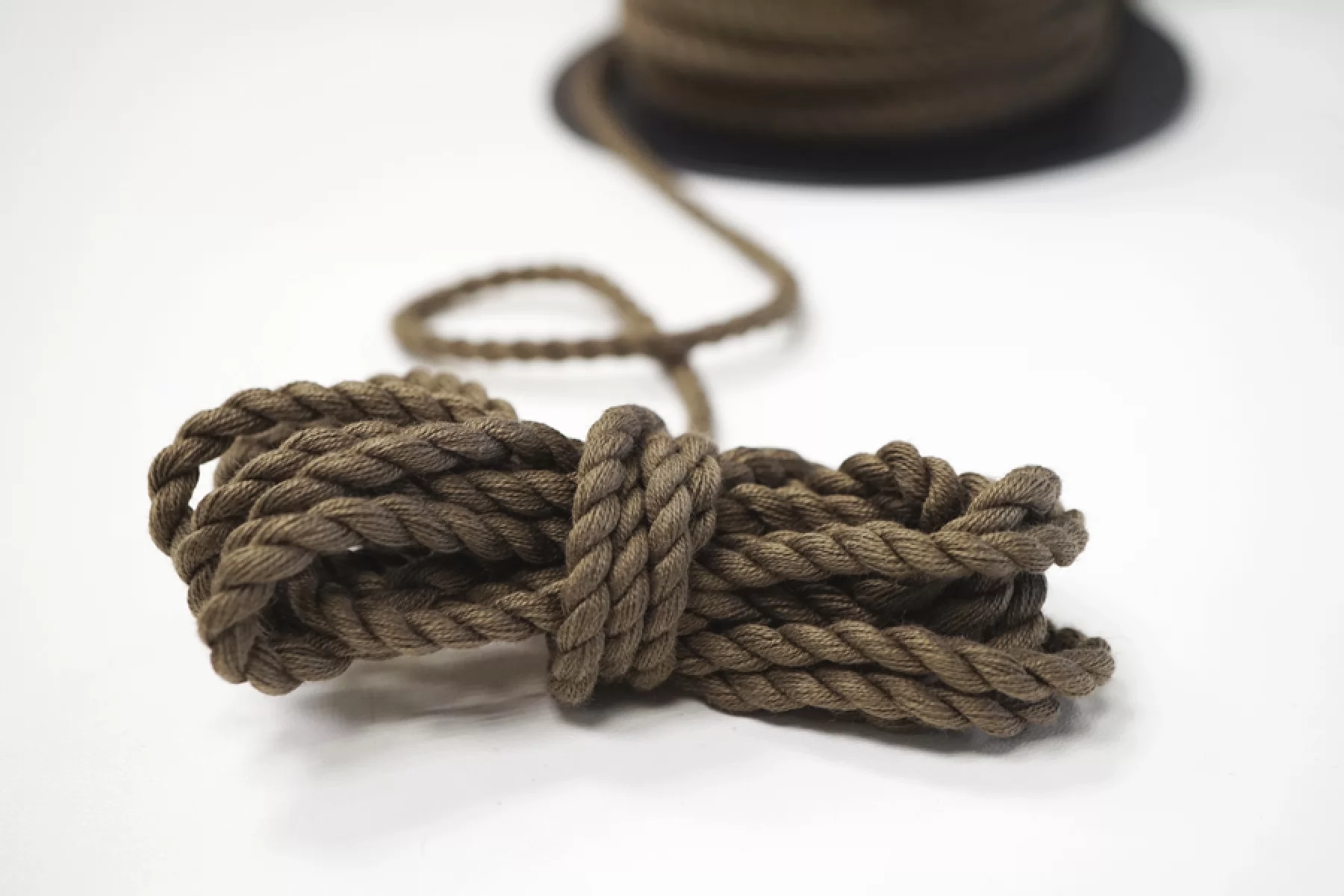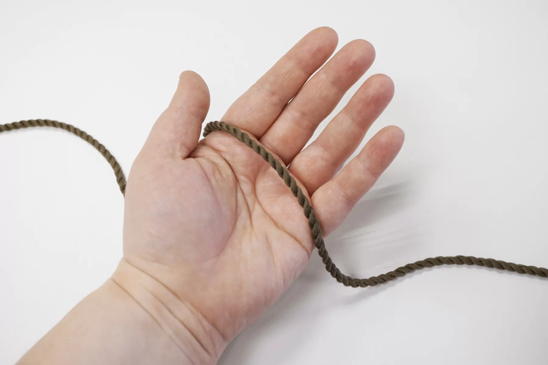 Хлопковый гайтановый шнур цвета хаки. Форма круглая. Ширина около 5 мм.