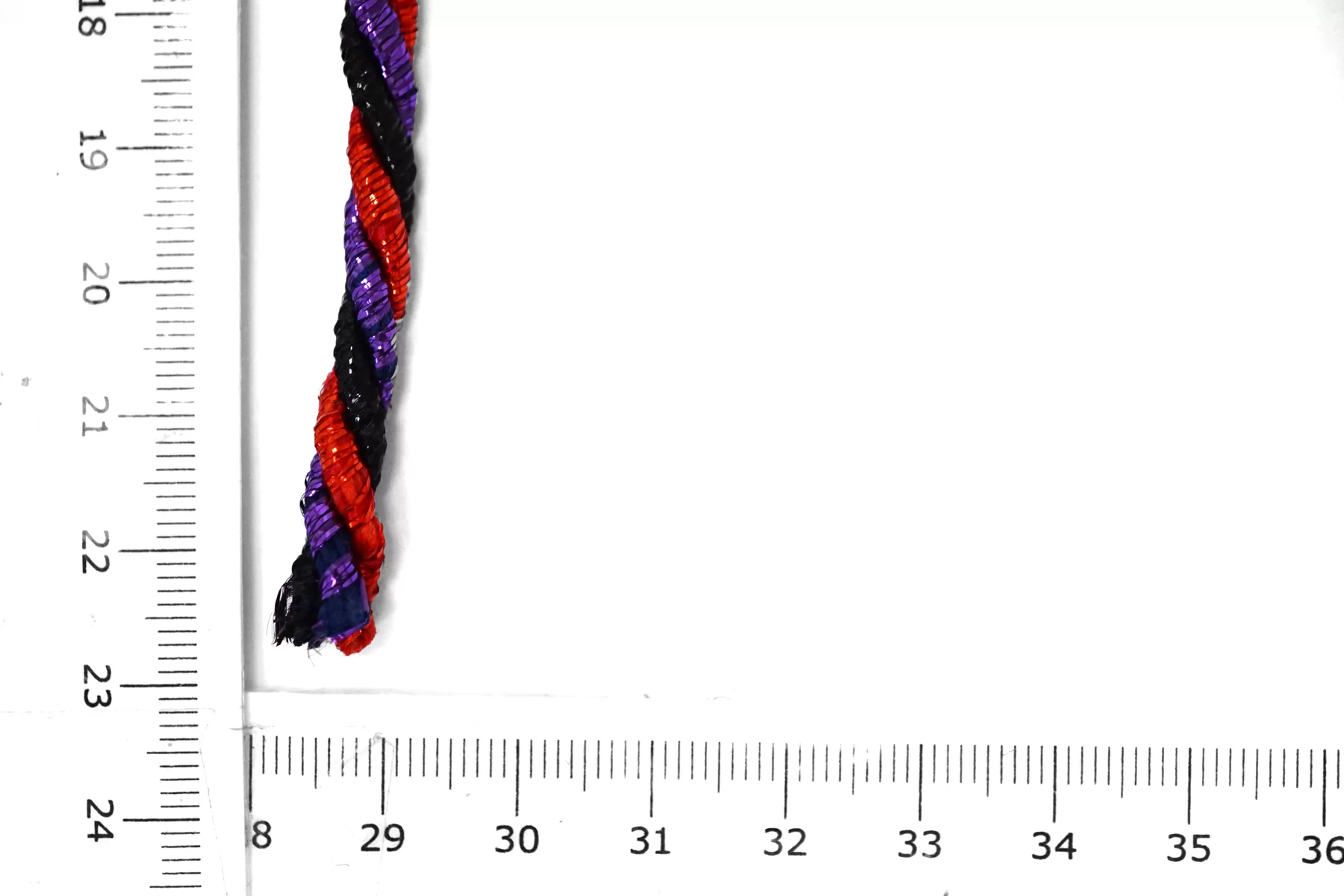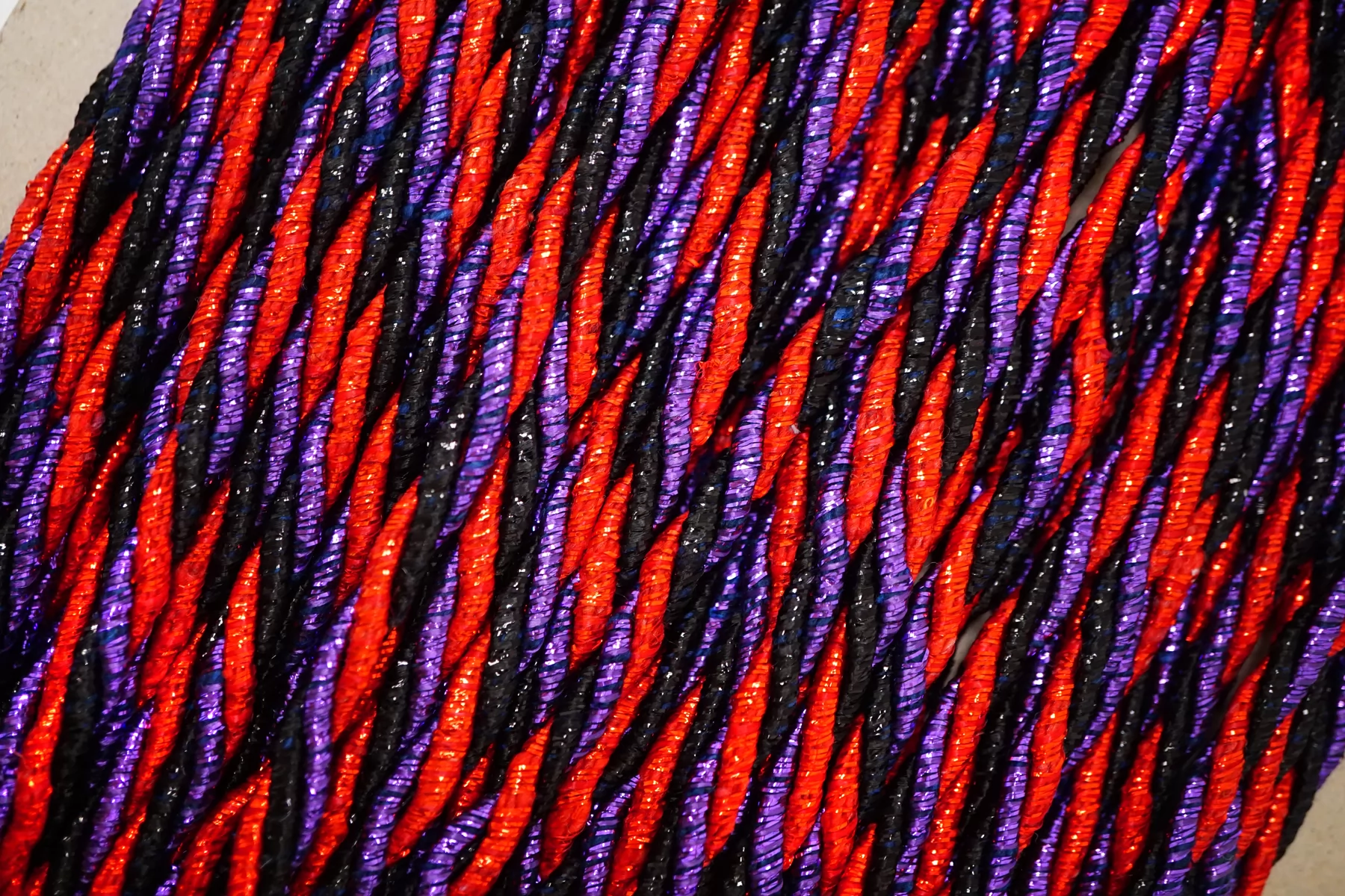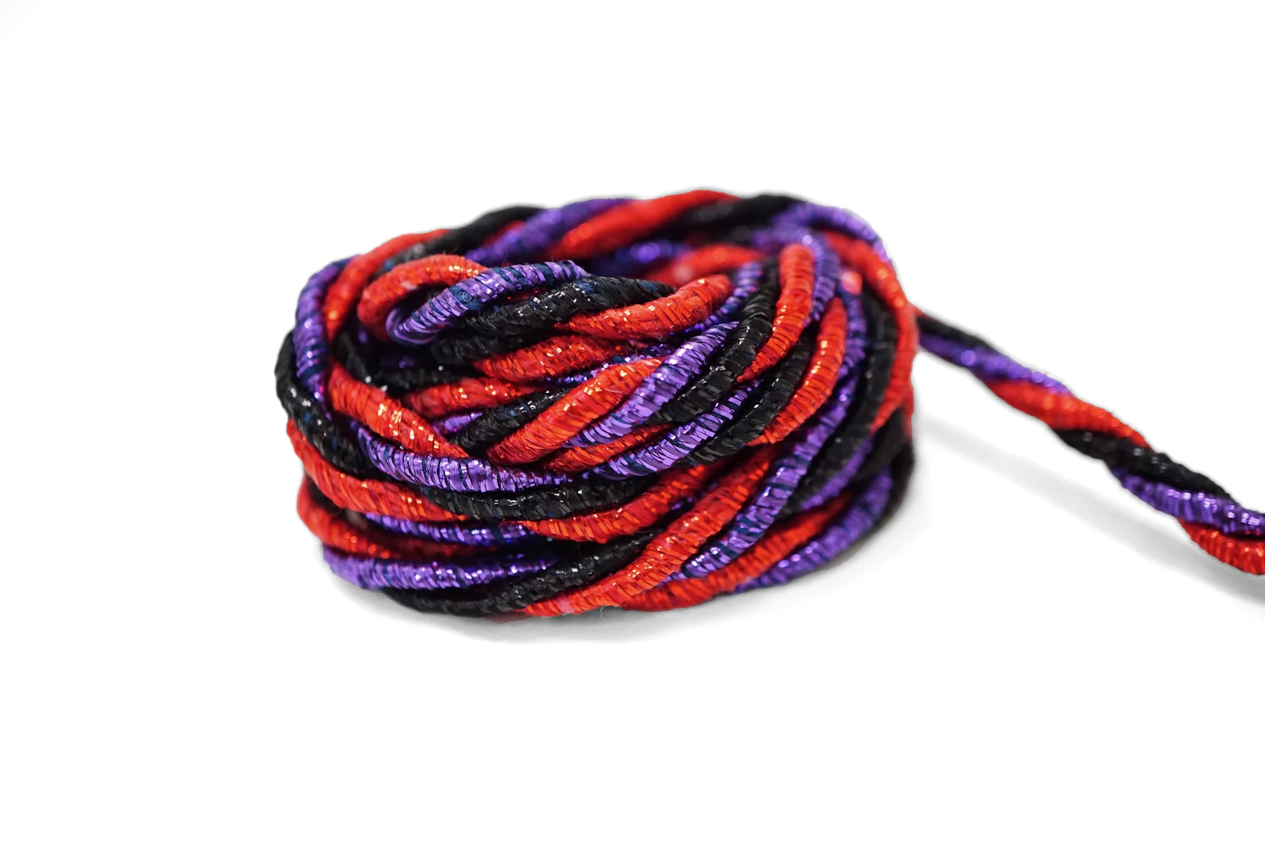 Гайтановый шнур, сочетание красного, чёрного и фиолетового цвета (с люрексом в цвет). Форма круглая. Ширина около 6 мм.