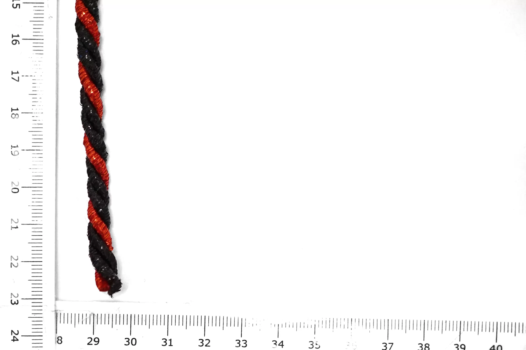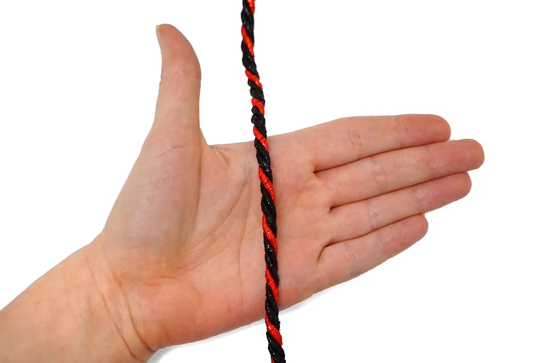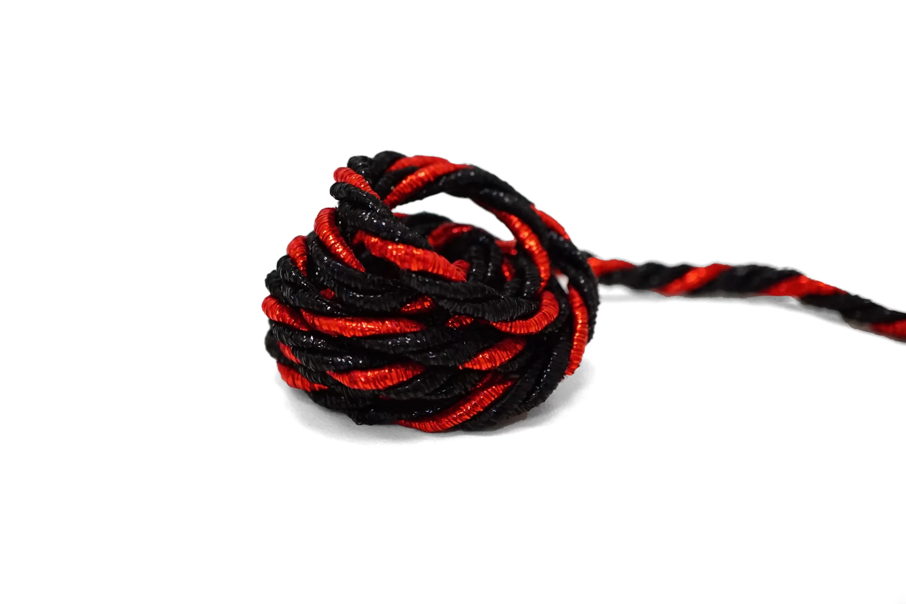 Гайтановый шнур, сочетание красного и чёрного цвета (с люрексом в цвет). Форма круглая. Ширина около 6 мм.