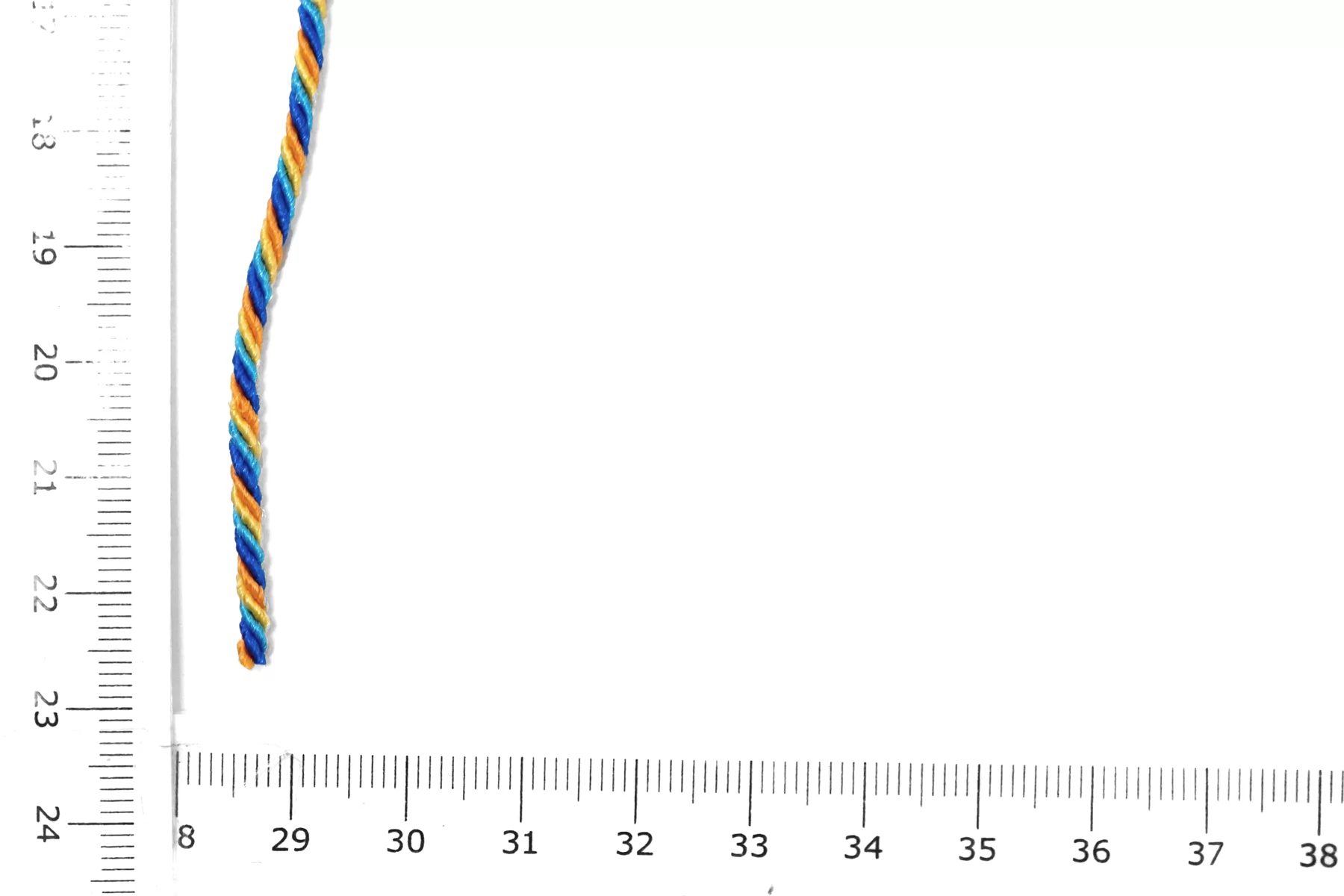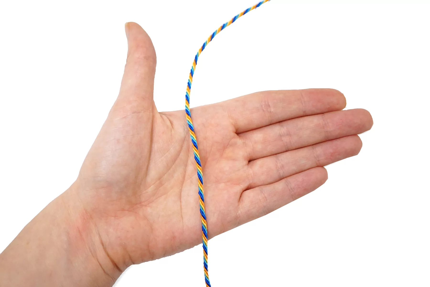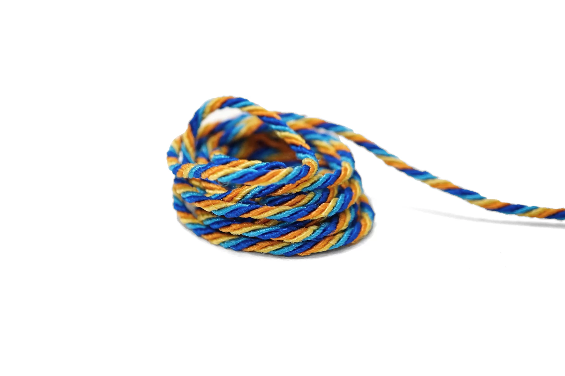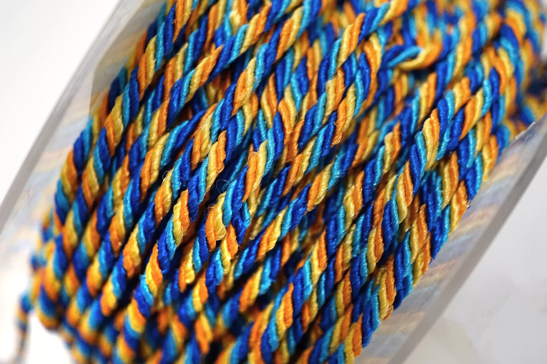 Гайтановый шнур, сочетание синего, голубого, жёлтого и оранжевого цвета. Форма круглая. Ширина около 3 мм.