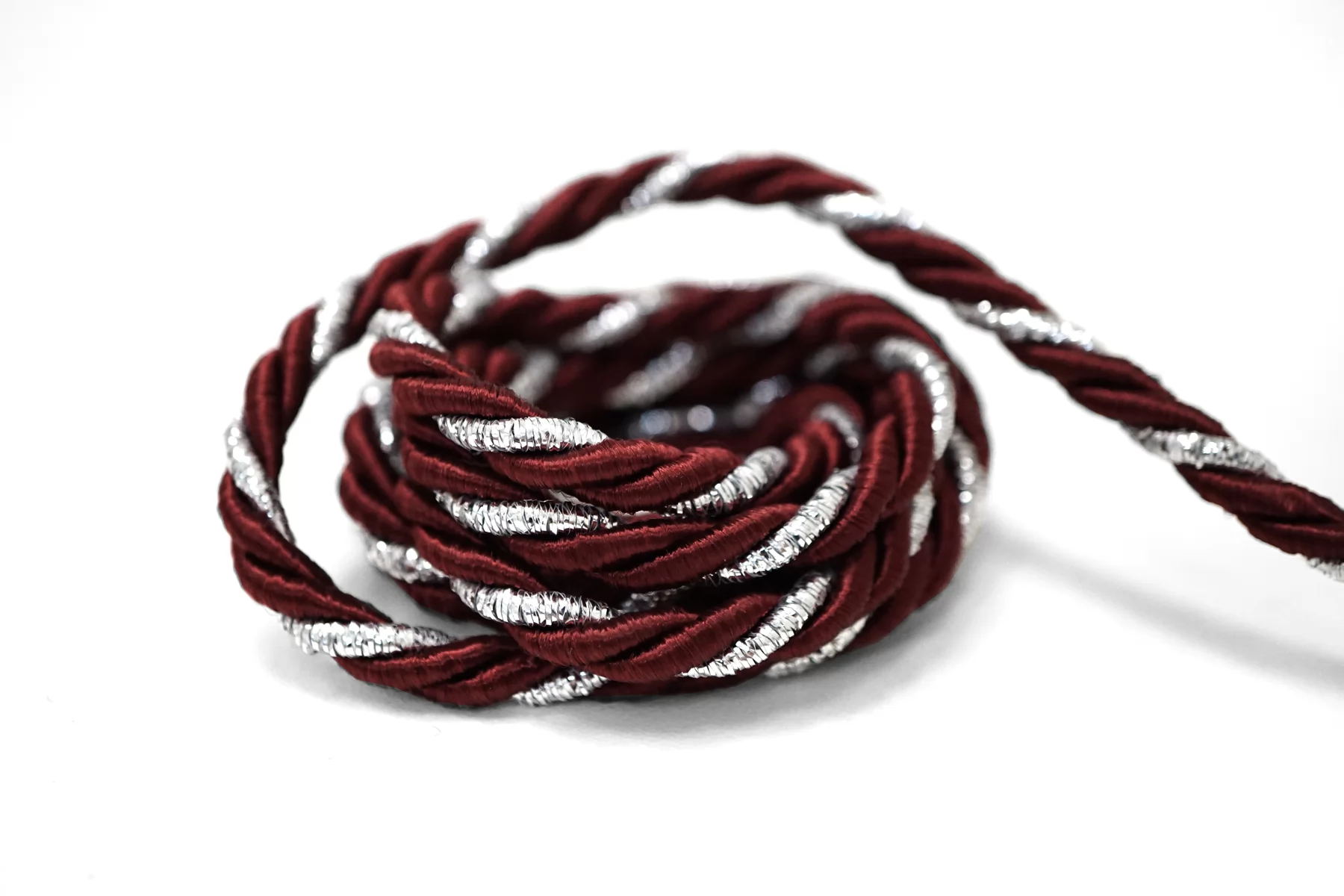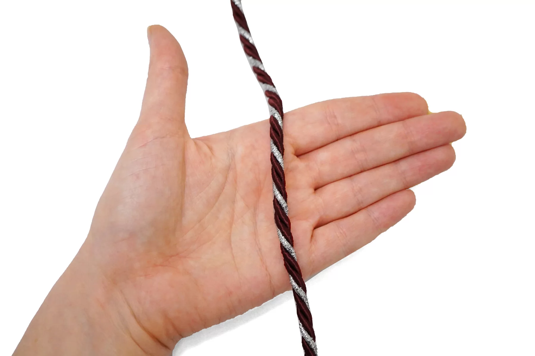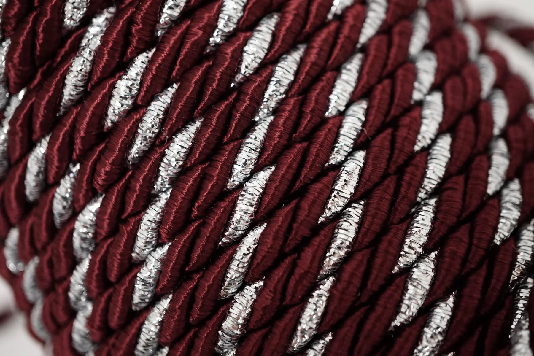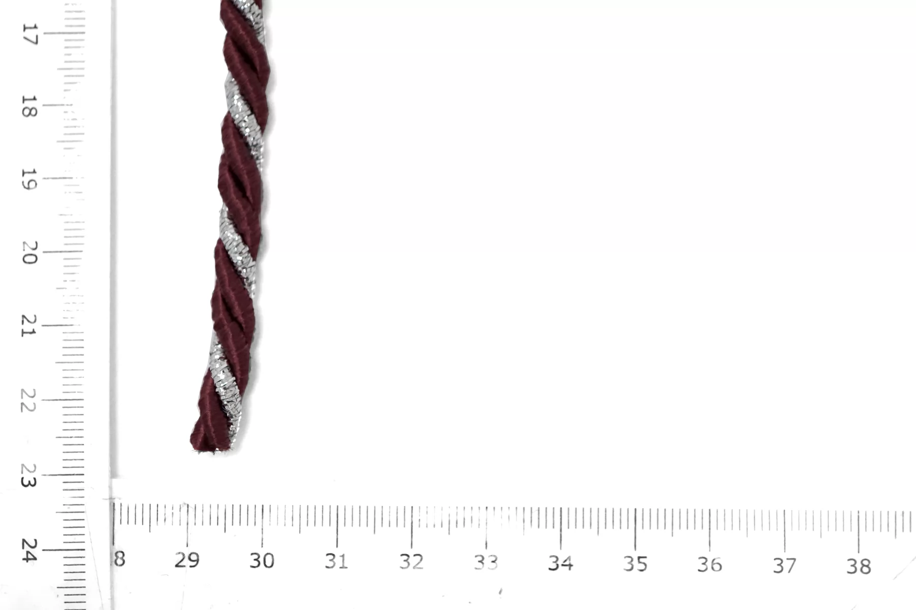 Гайтановый шнур, сочетание винного и серебряного цветов. Форма круглая. Ширина около 6 мм.