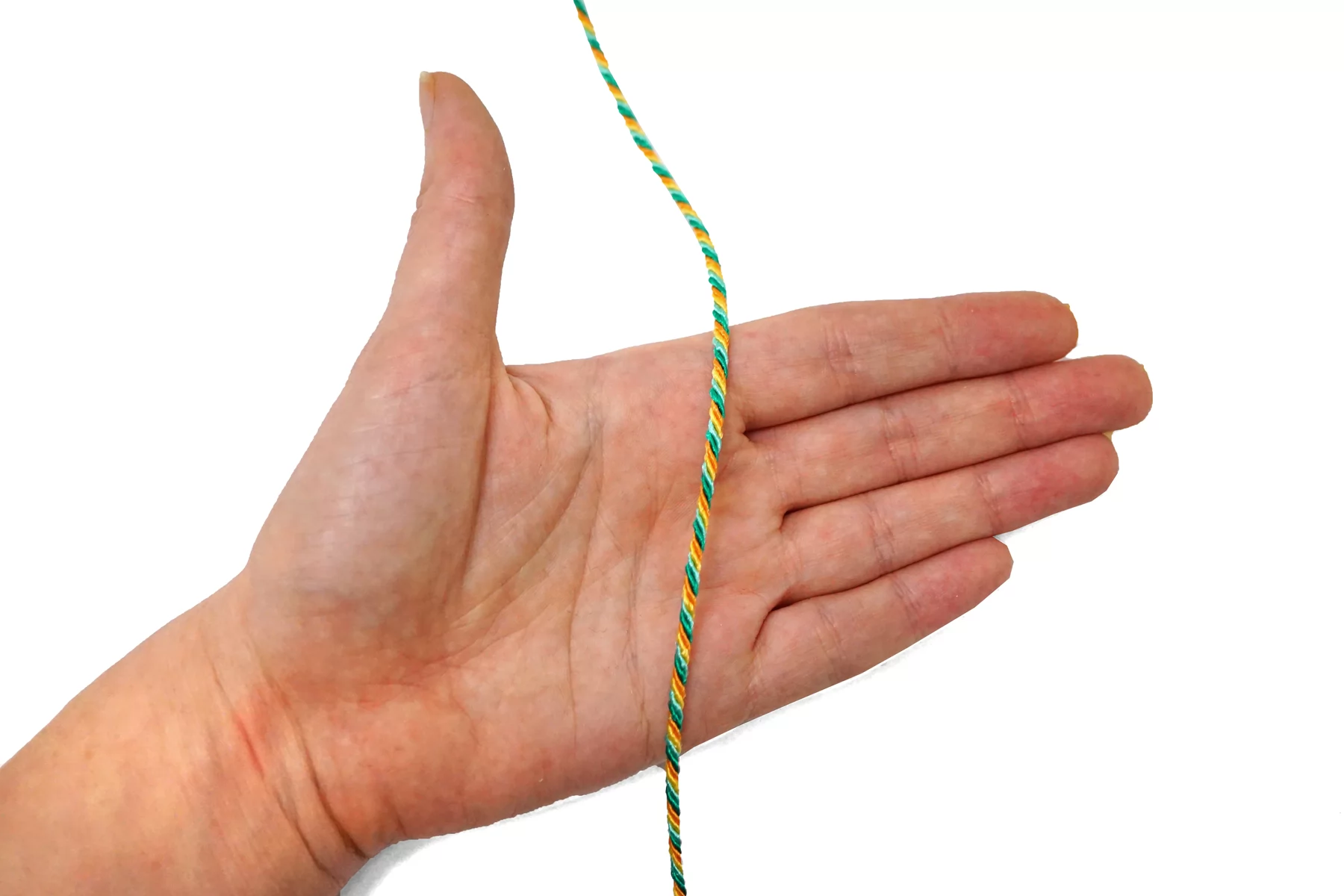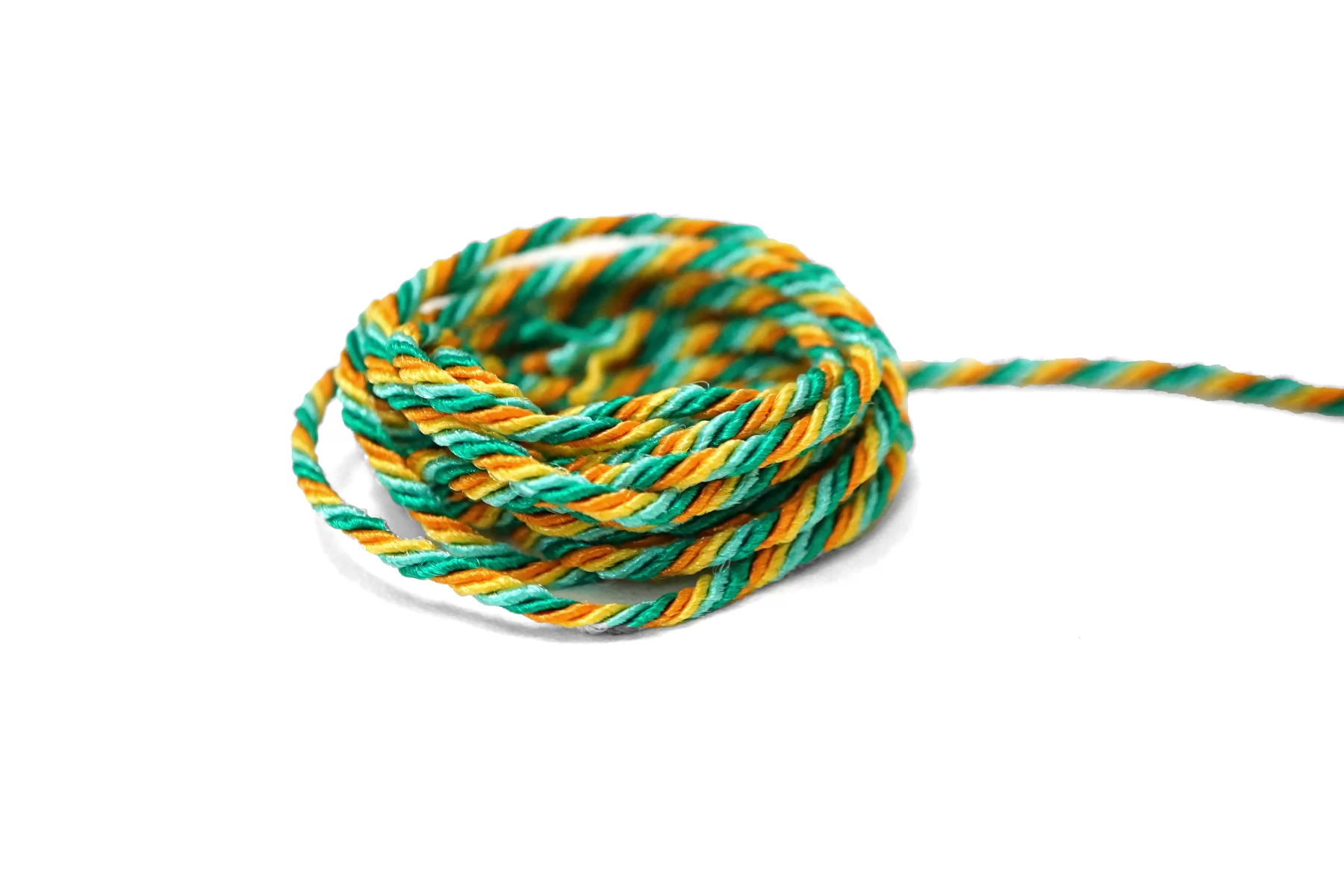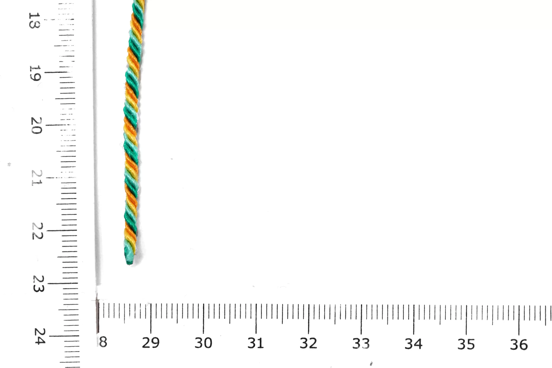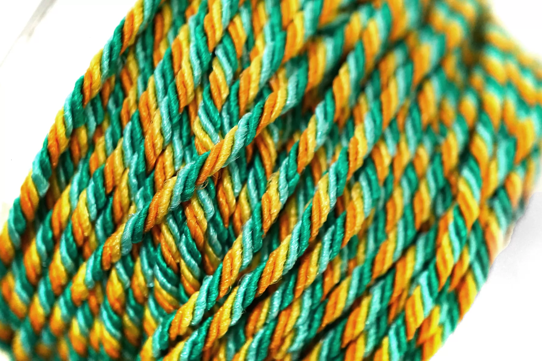 Гайтановый шнур, сочетание зелёного, мятного, жёлтого и оранжевого цвета. Форма круглая. Ширина около 3 мм.