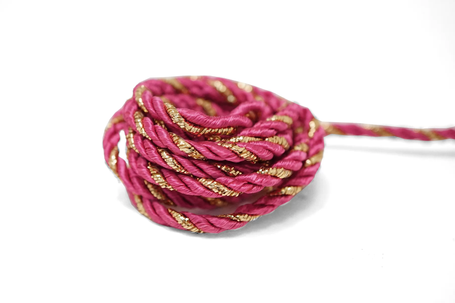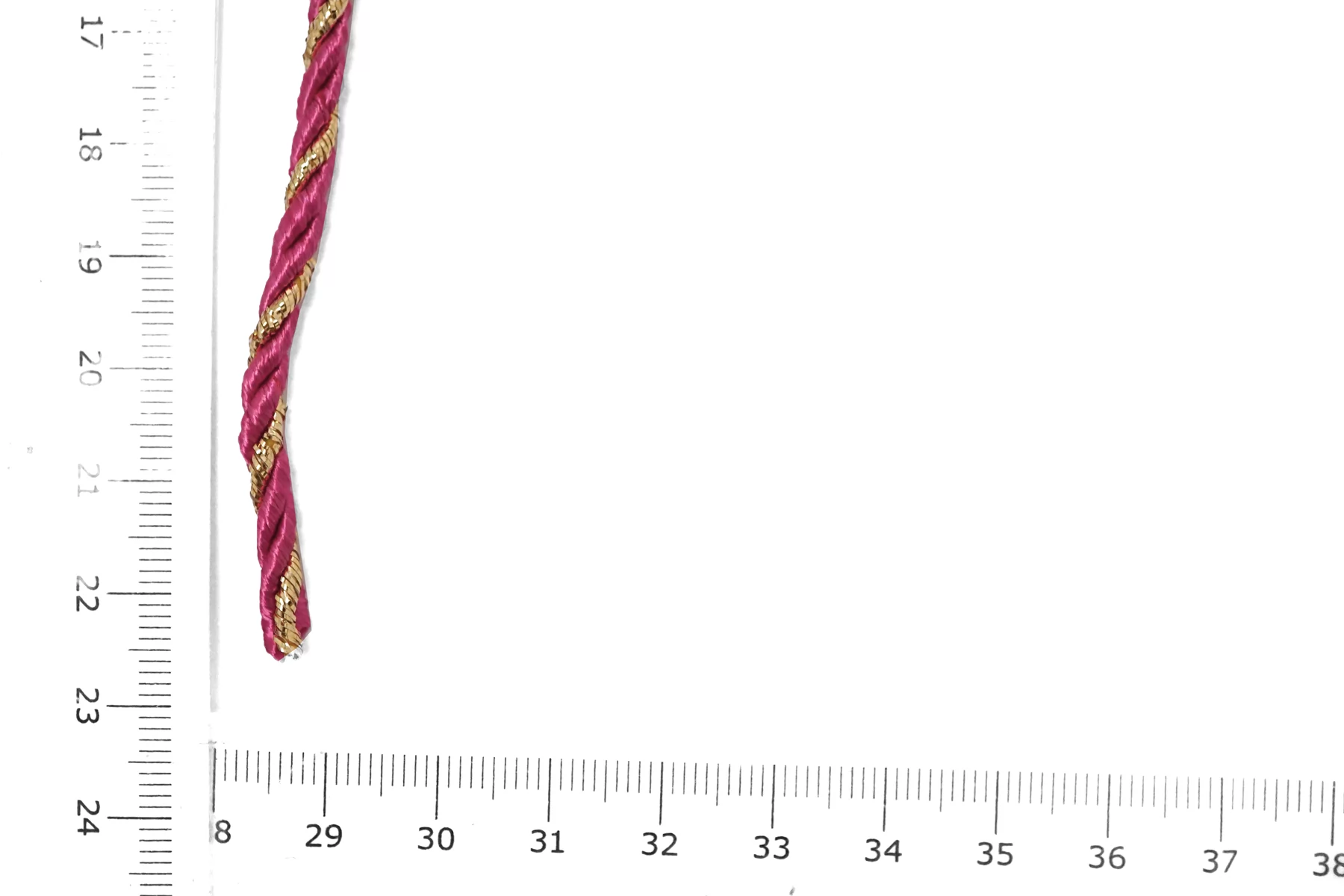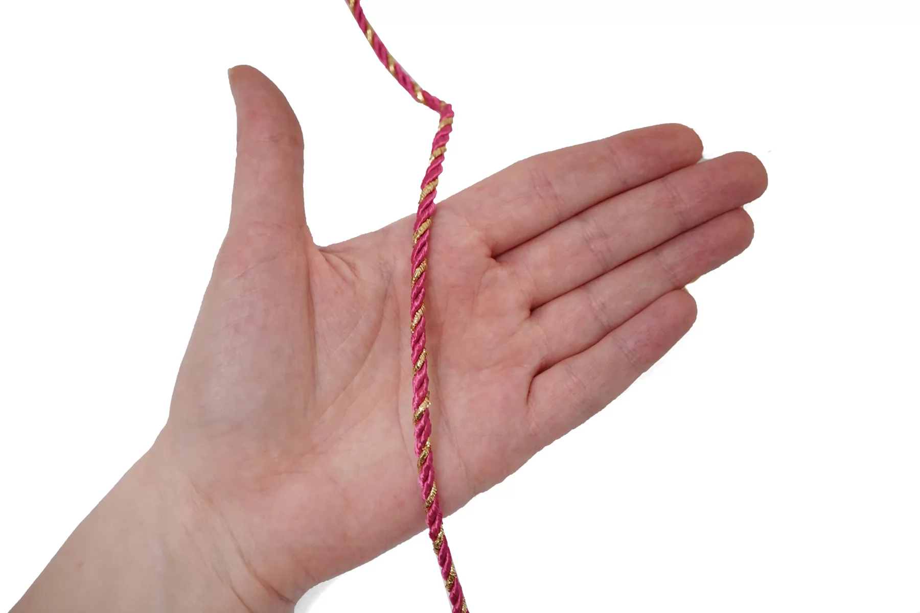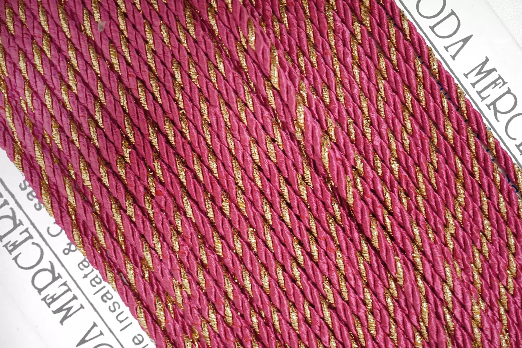 Гайтановый шнур, сочетание розового и золотистого цвета. Форма круглая. Ширина около 4 мм.
