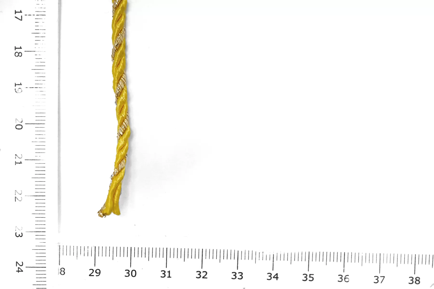 Гайтановый шнур, сочетание жёлтого и золотистого цвета. Форма круглая. Ширина около 4 мм.