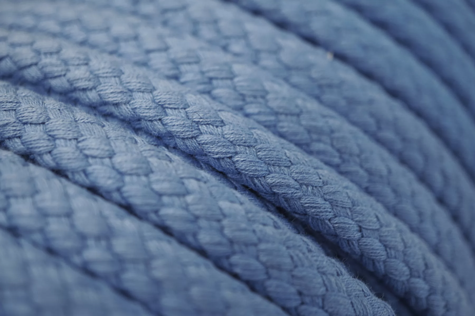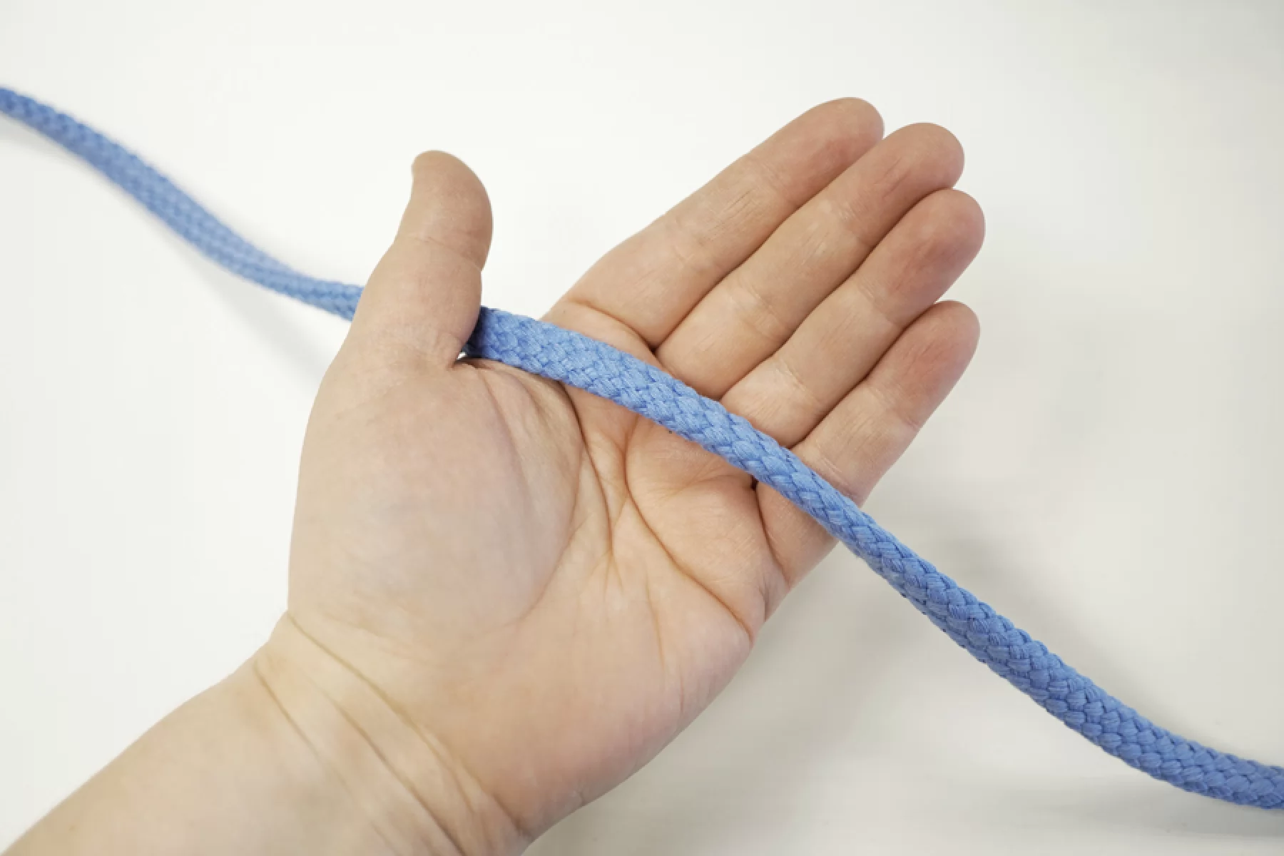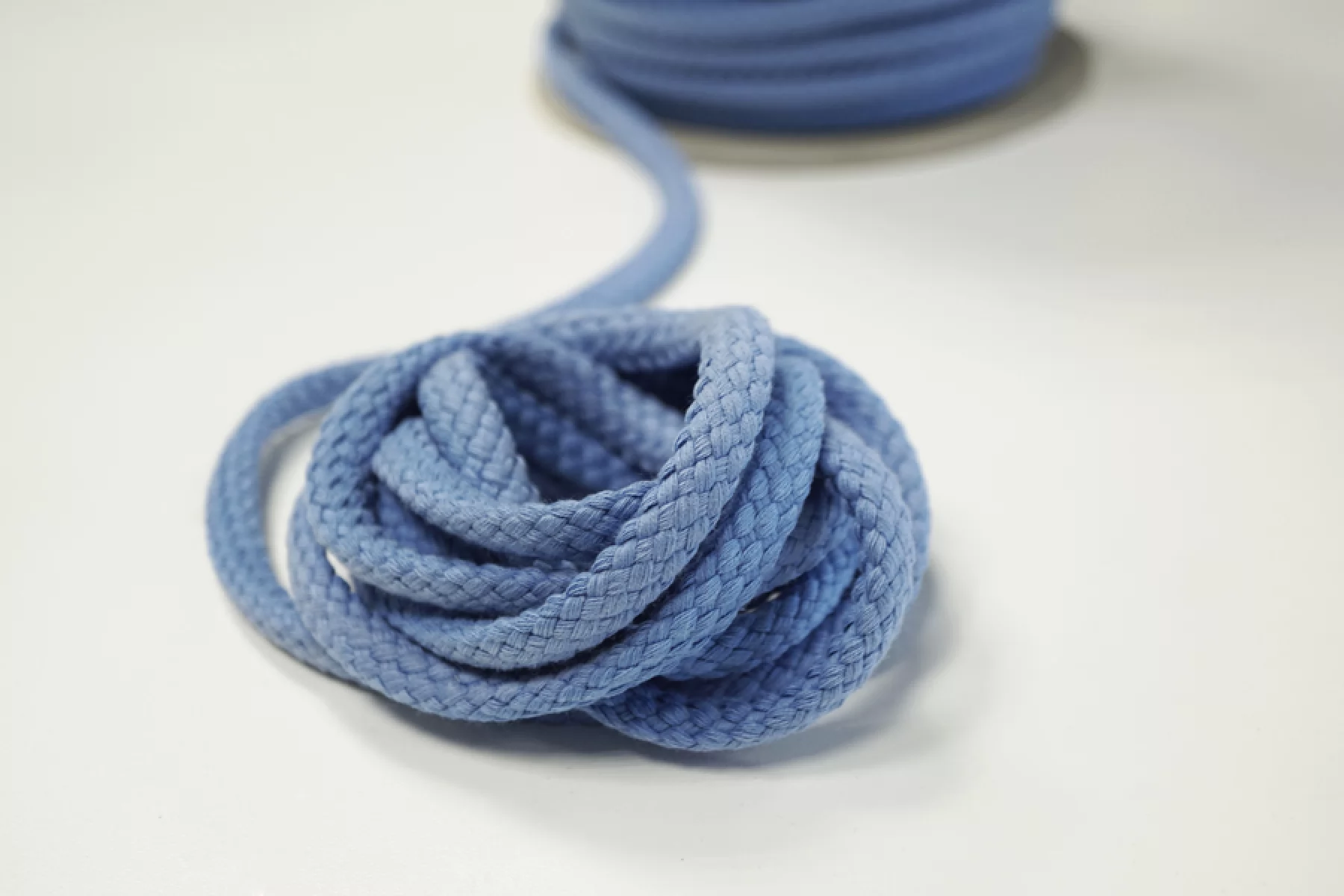 Хлопковый шнур голубого цвета. Форма круглая. Ширина около 1,2 см.