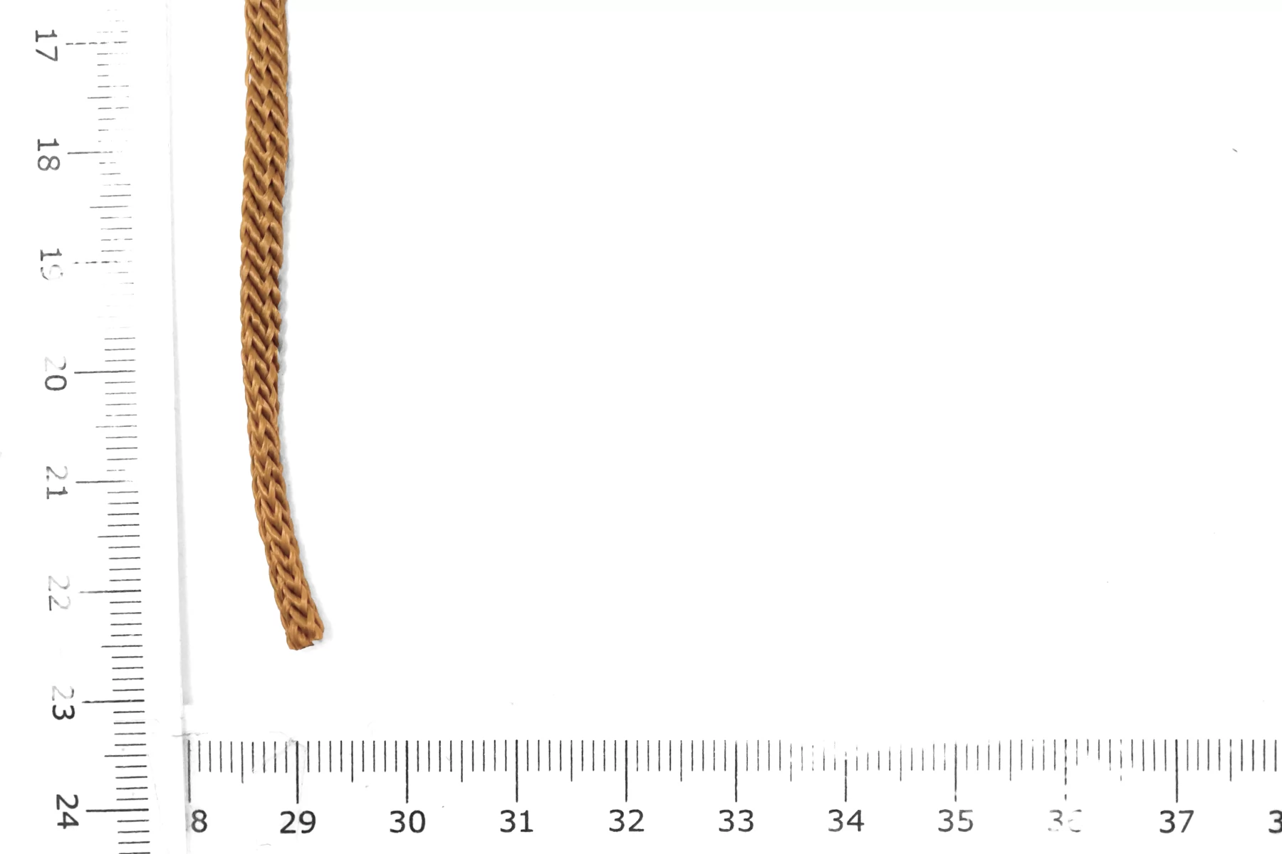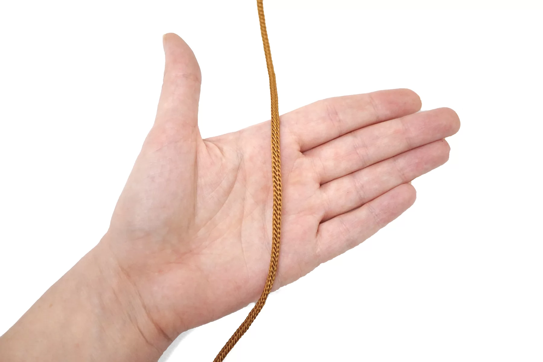 Шнур в чуть высветленном коричневом цвете. Форма чуть сплющенная. Ширина около 5 мм.