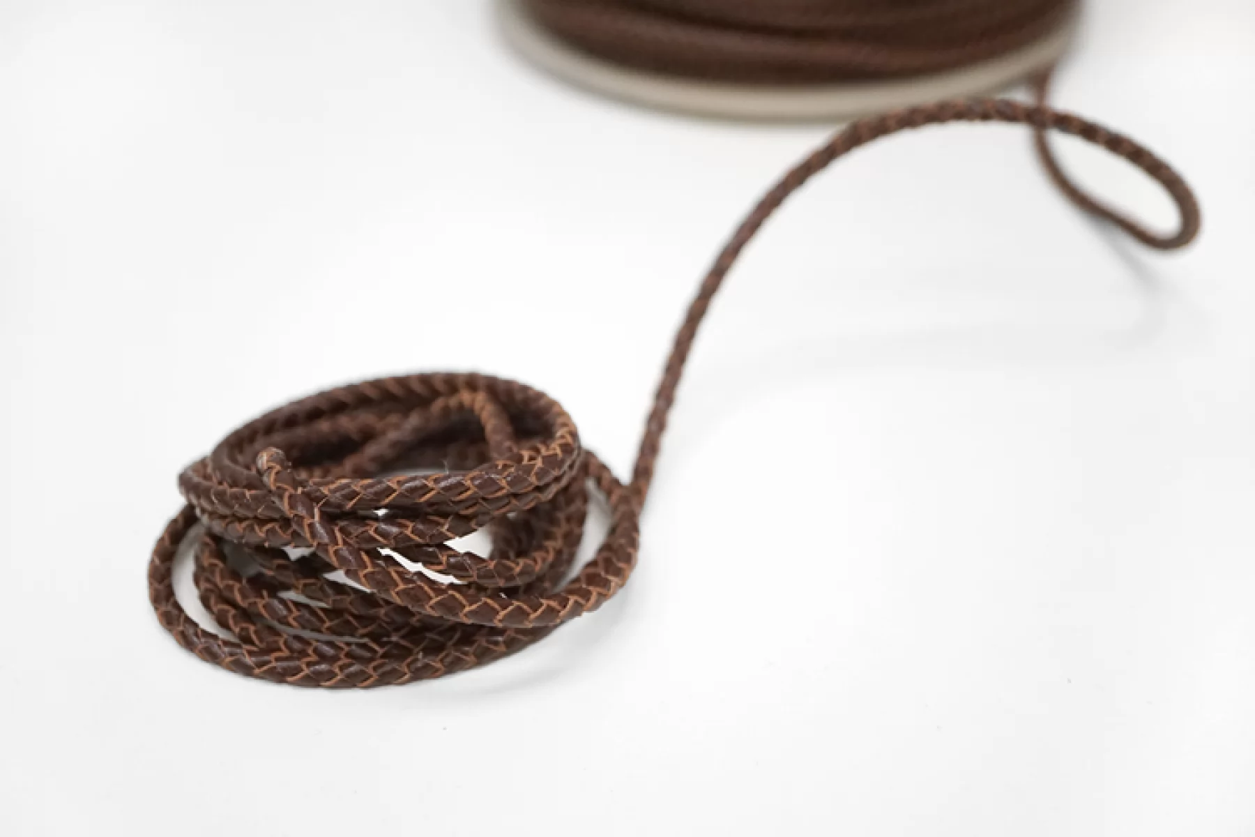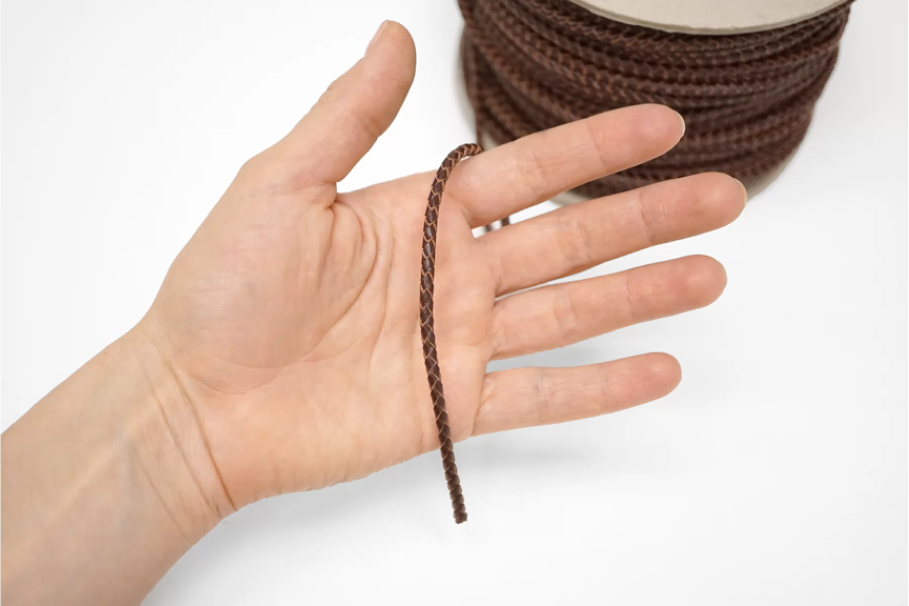 Шнур из эко-кожи коричневого цвета диаметром около 3,5 мм. Можно использовать для изготовления и декорирования элементов одежды, обуви, аксессуаров и мебели.