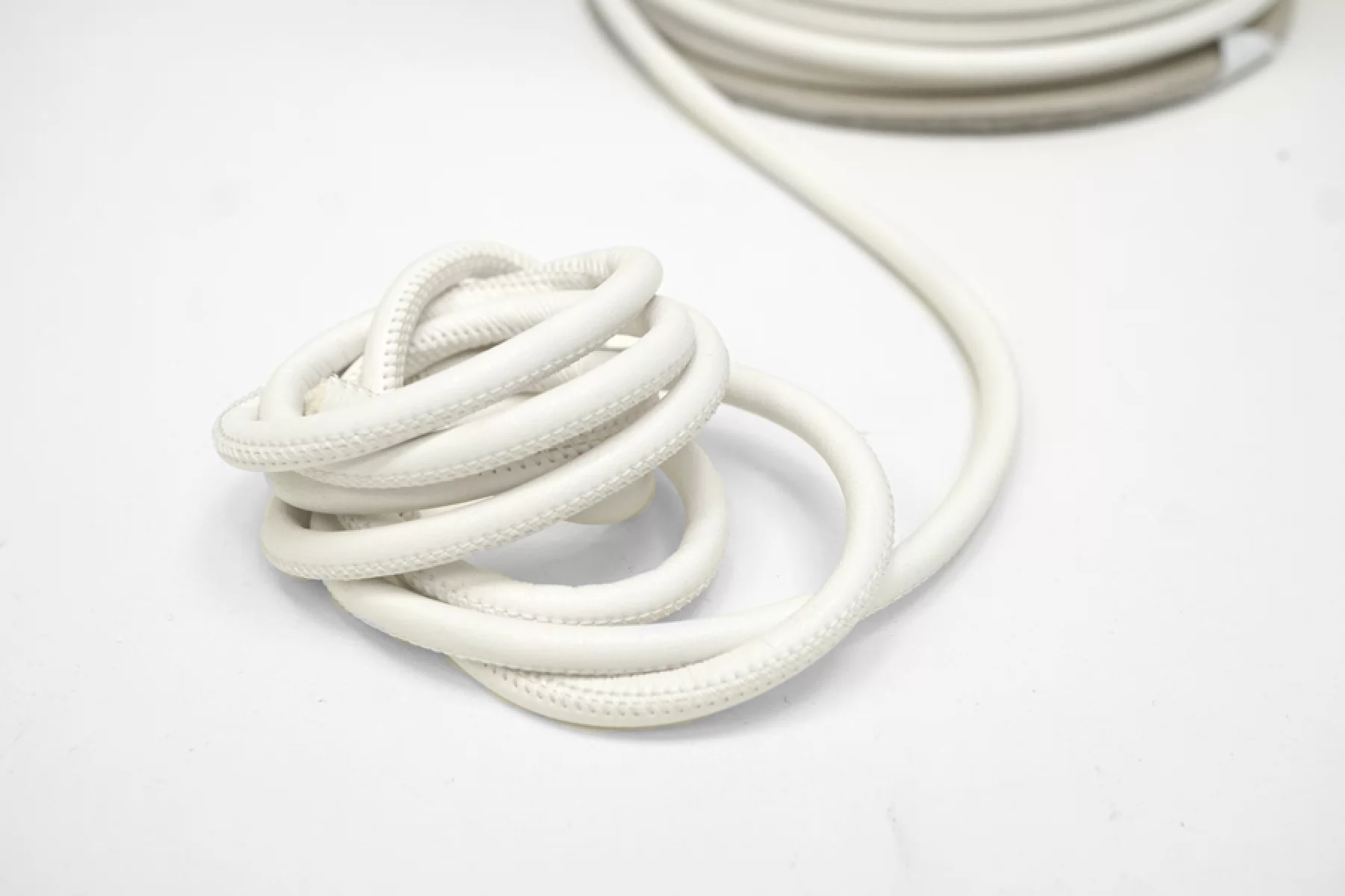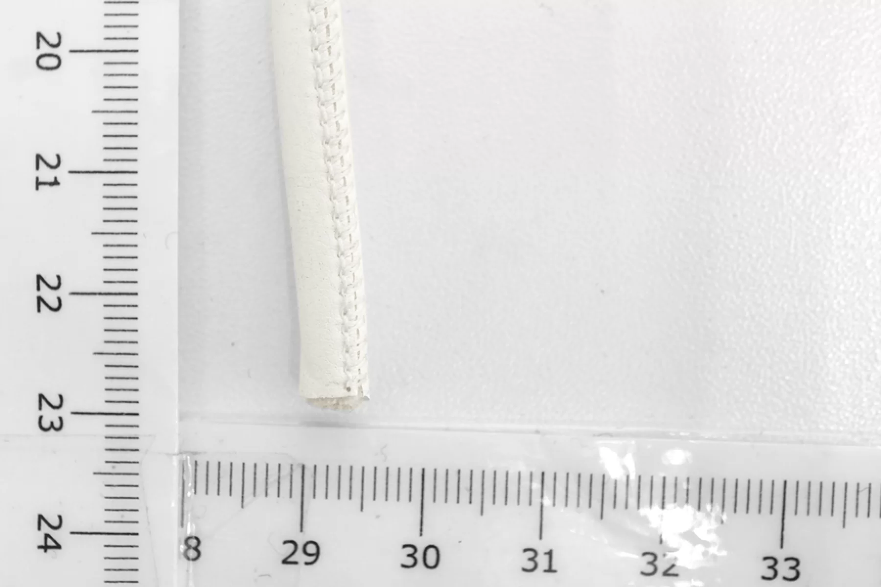 Шнур из эко-кожи молочно-белого цвета диаметром около 5 мм. Можно использовать для изготовления и декорирования элементов одежды, обуви, аксессуаров и мебели.