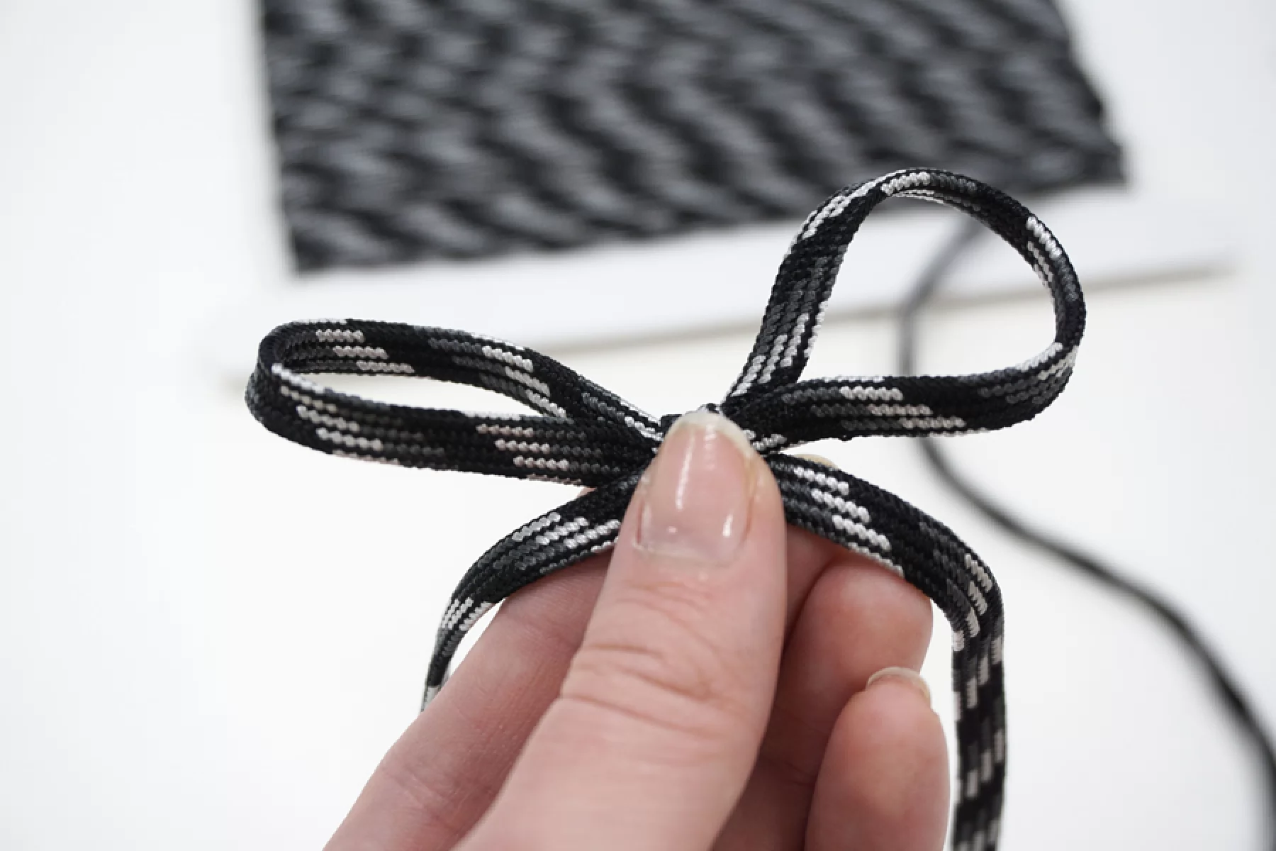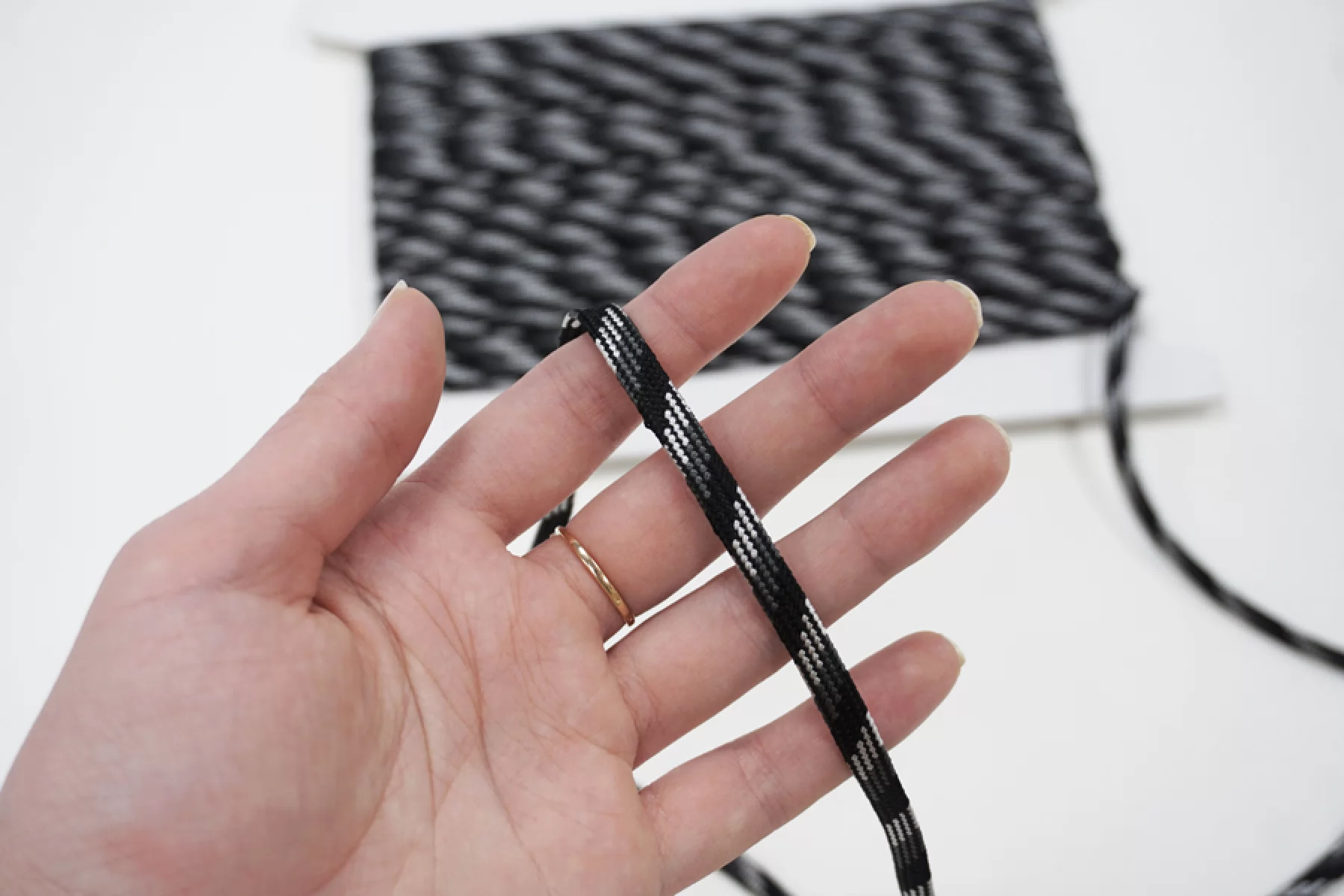 Ацетатный плоский шнур черно-серого цвета. Ширина около 6 мм.