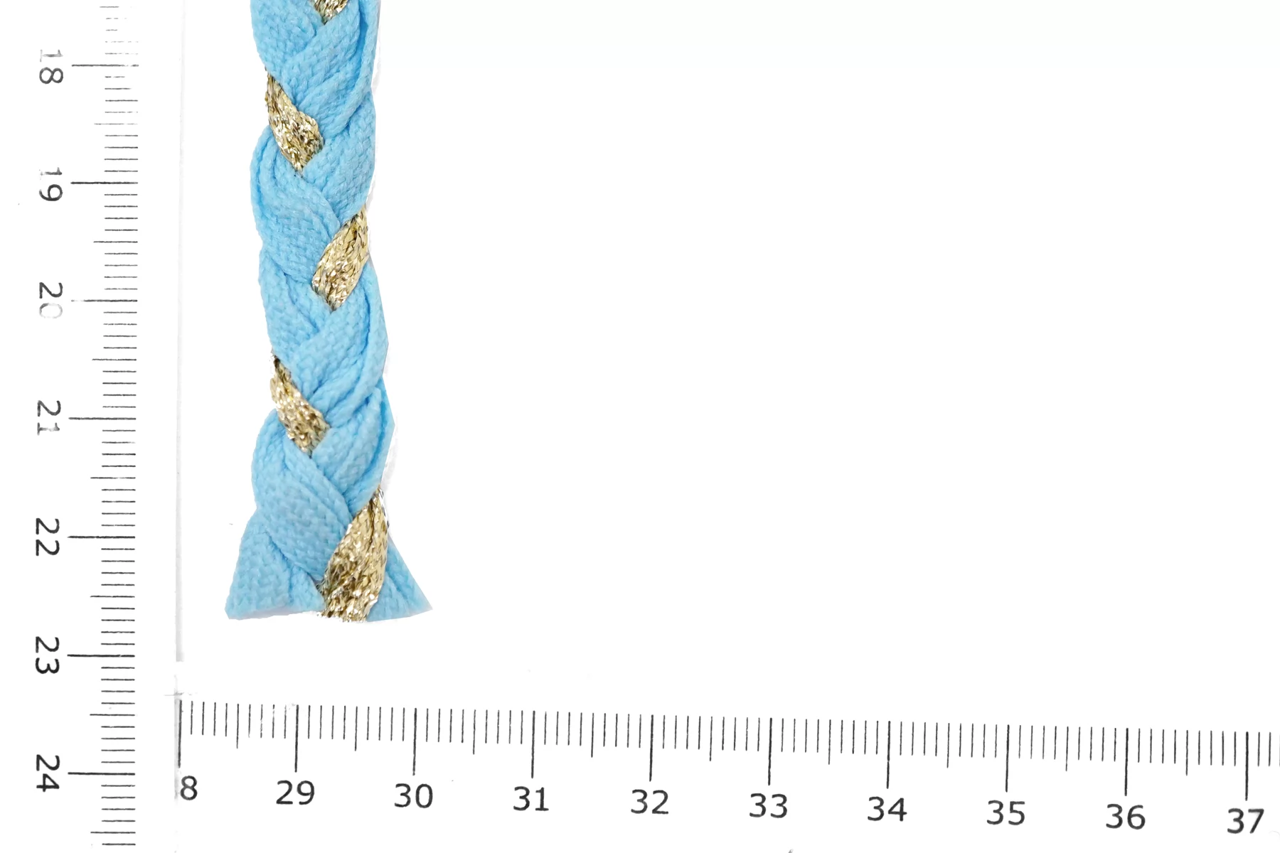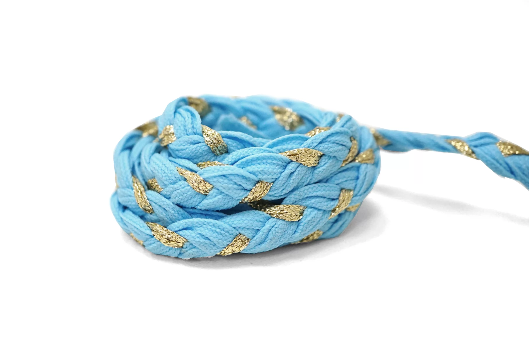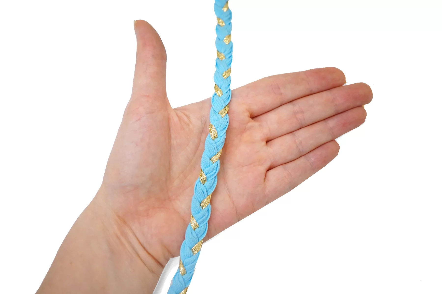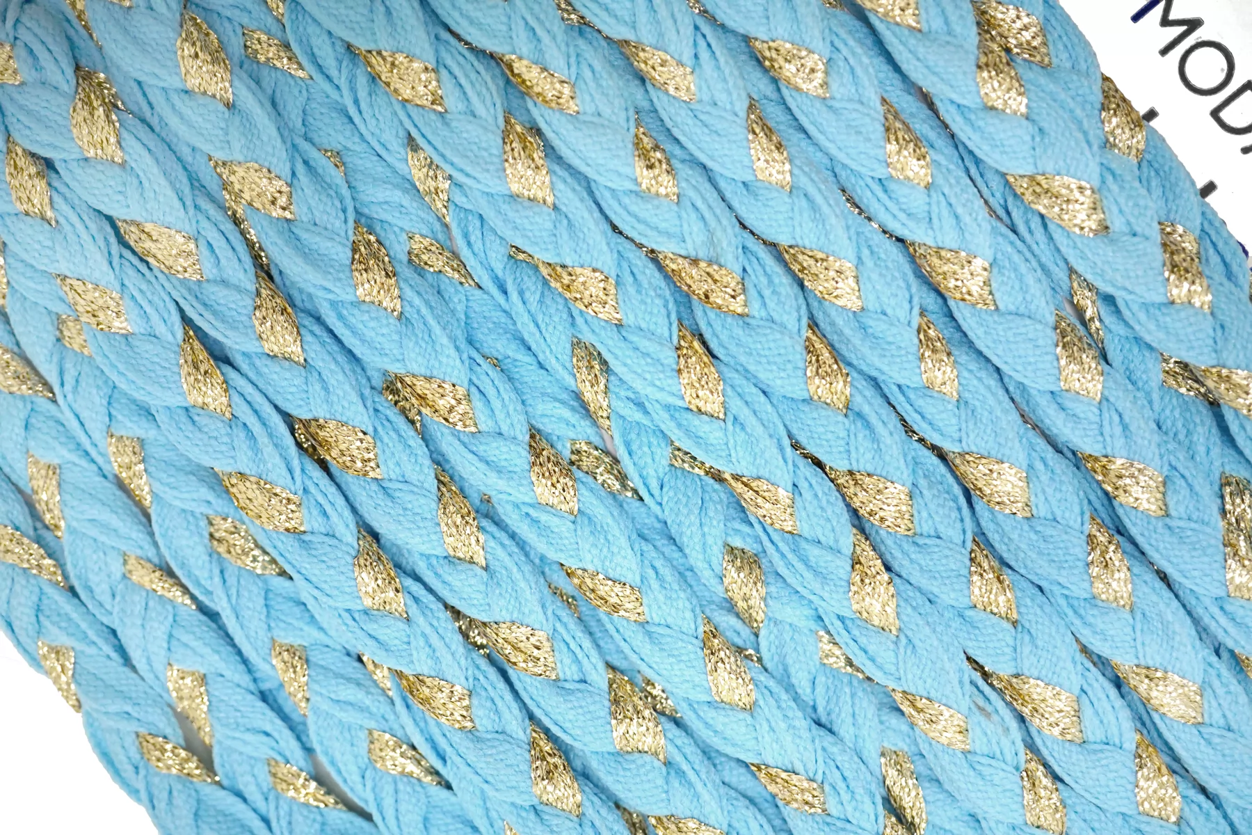 Плетеный косичкой шнур, голубой с золотистым люрексом. Форма плоская. Ширина около 1 см.