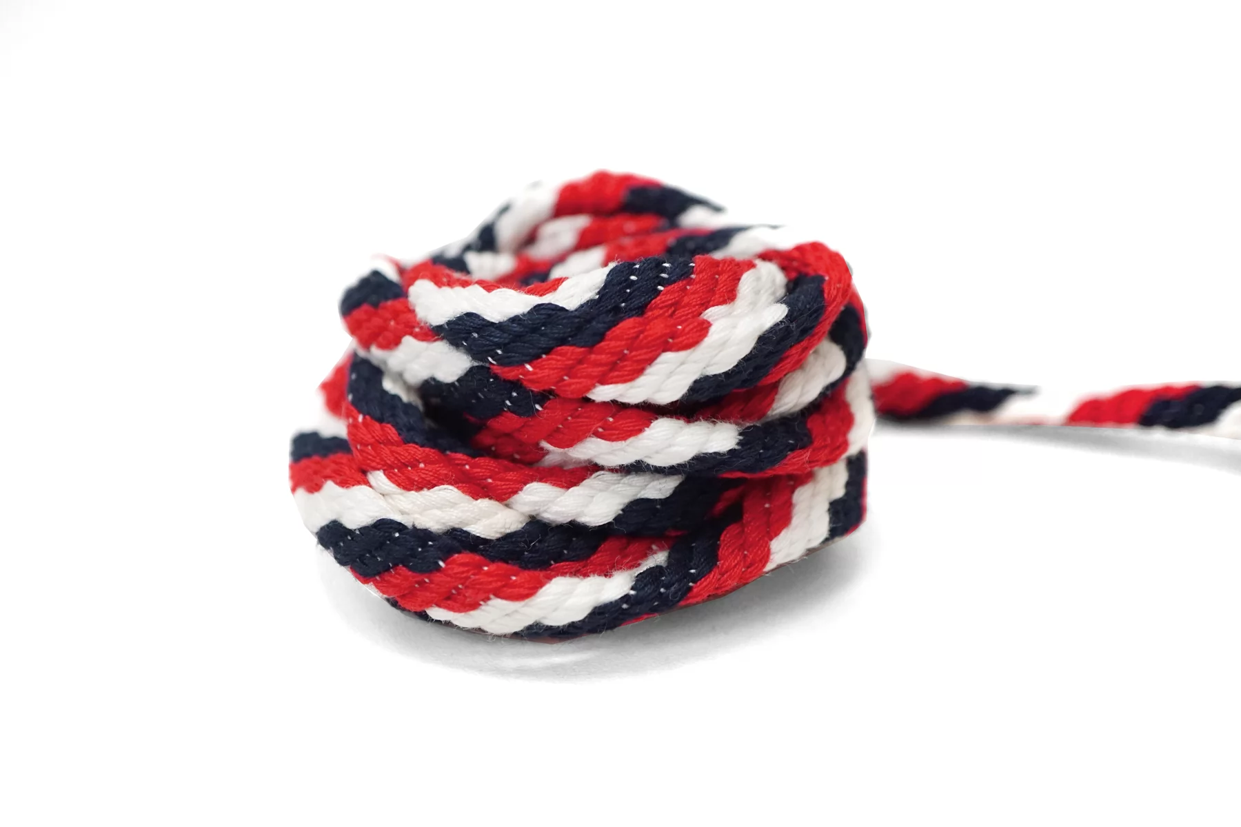 Плетеный шнур, использован синий, красный и белый цвет. Форма круглая. Ширина около 89м.