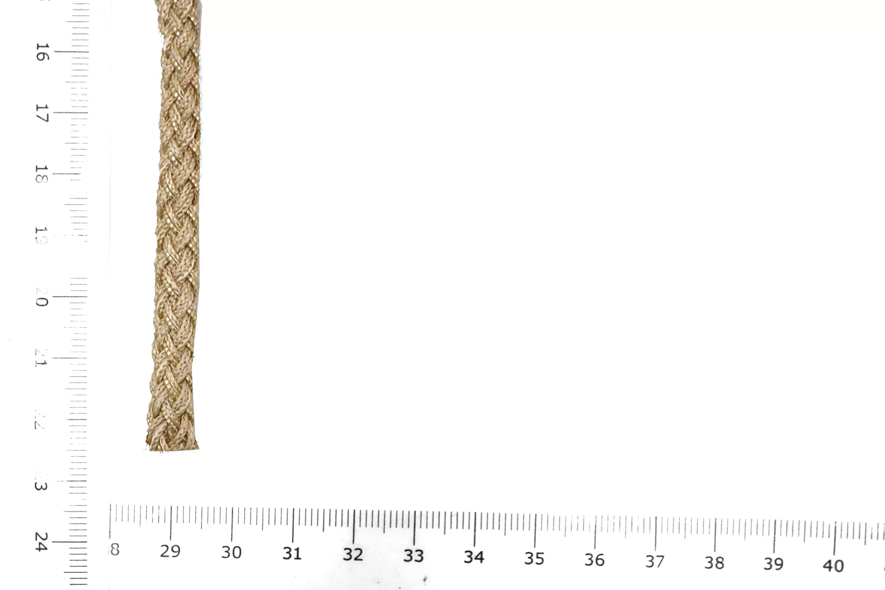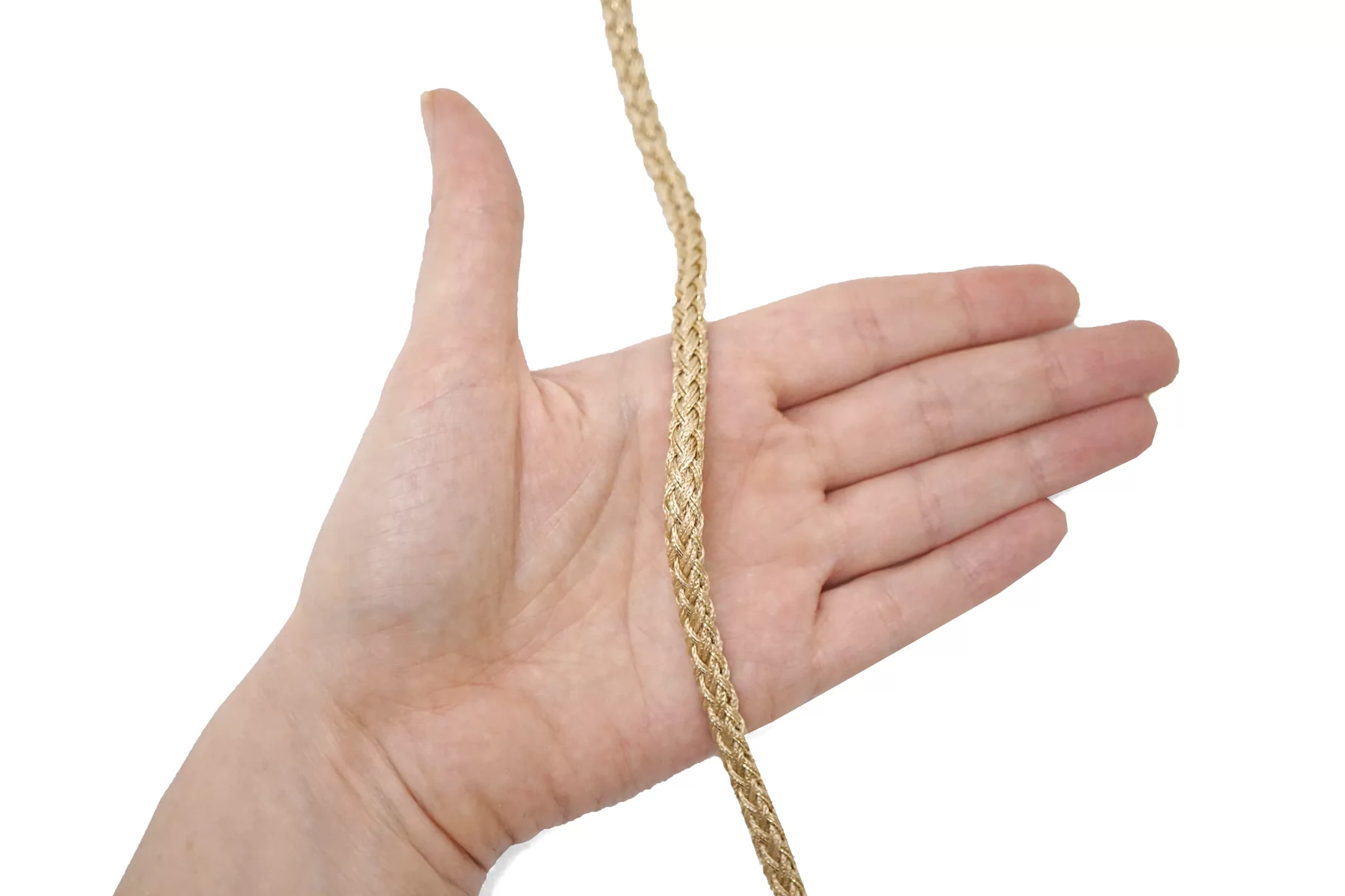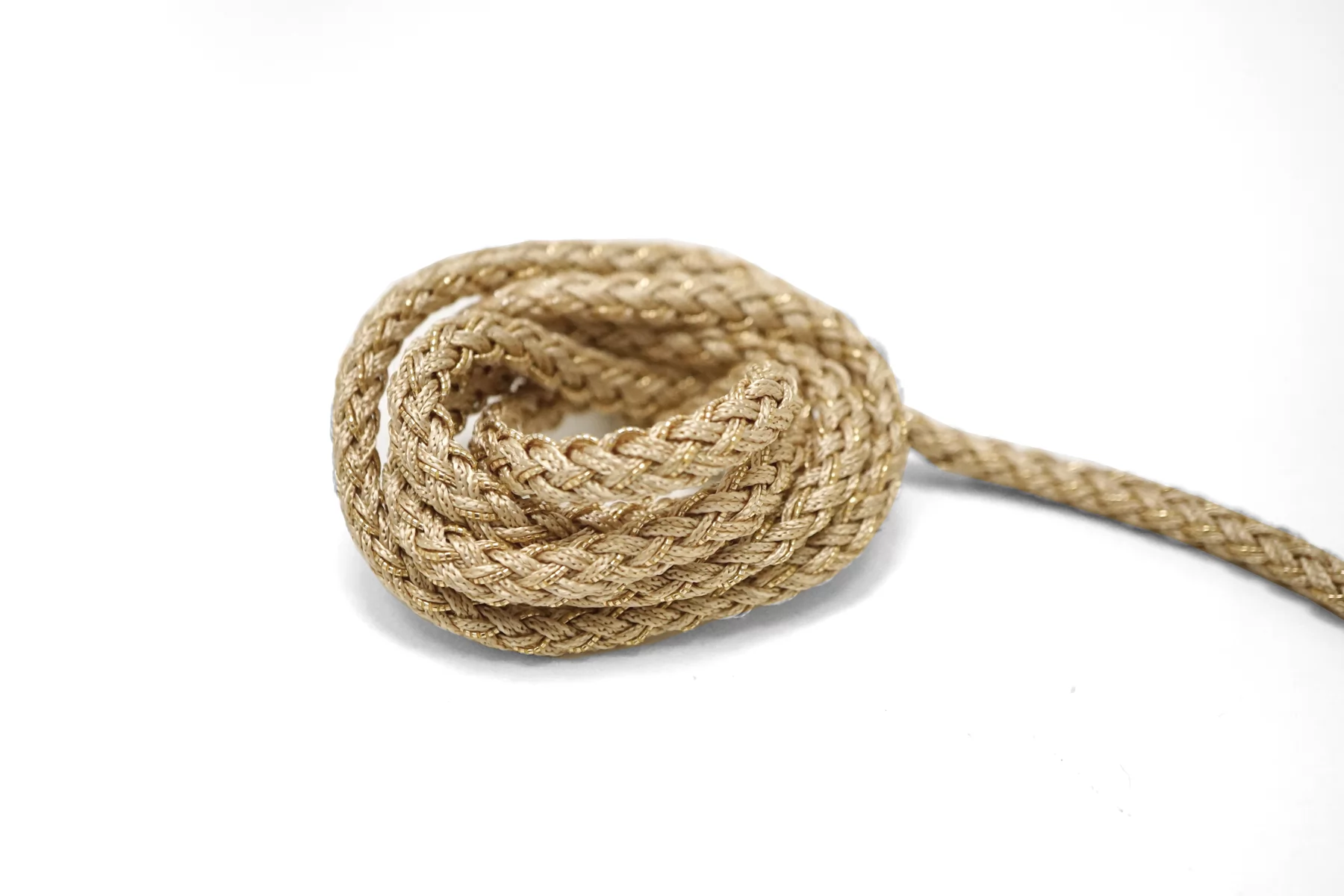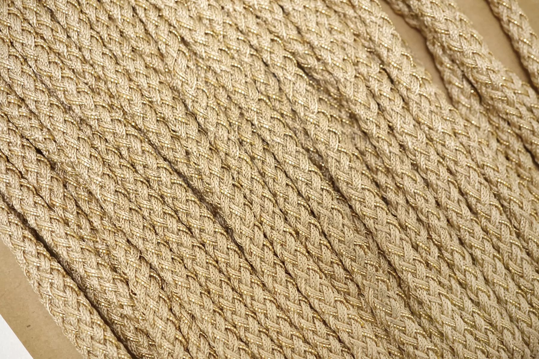 Плетёный шнур, сочетание бежевого цвета и золотистого люрекса. Форма круглая. Ширина около 5 мм.